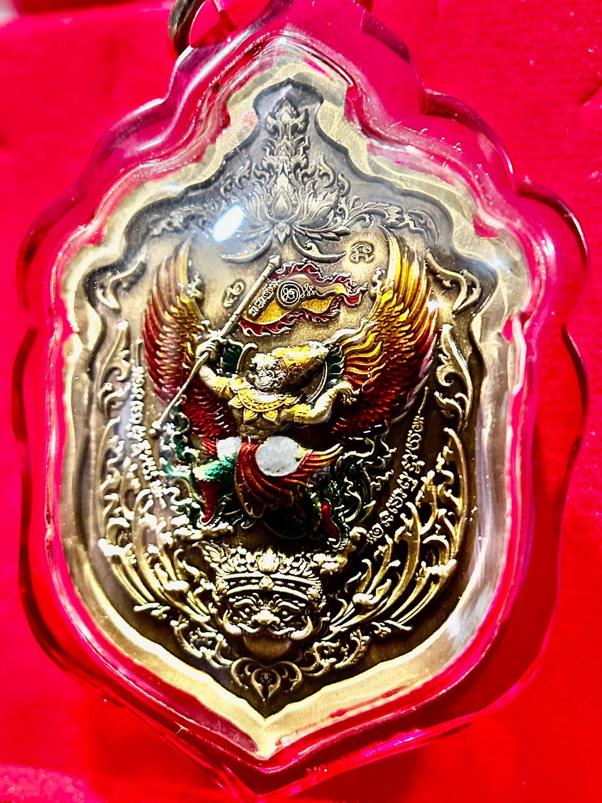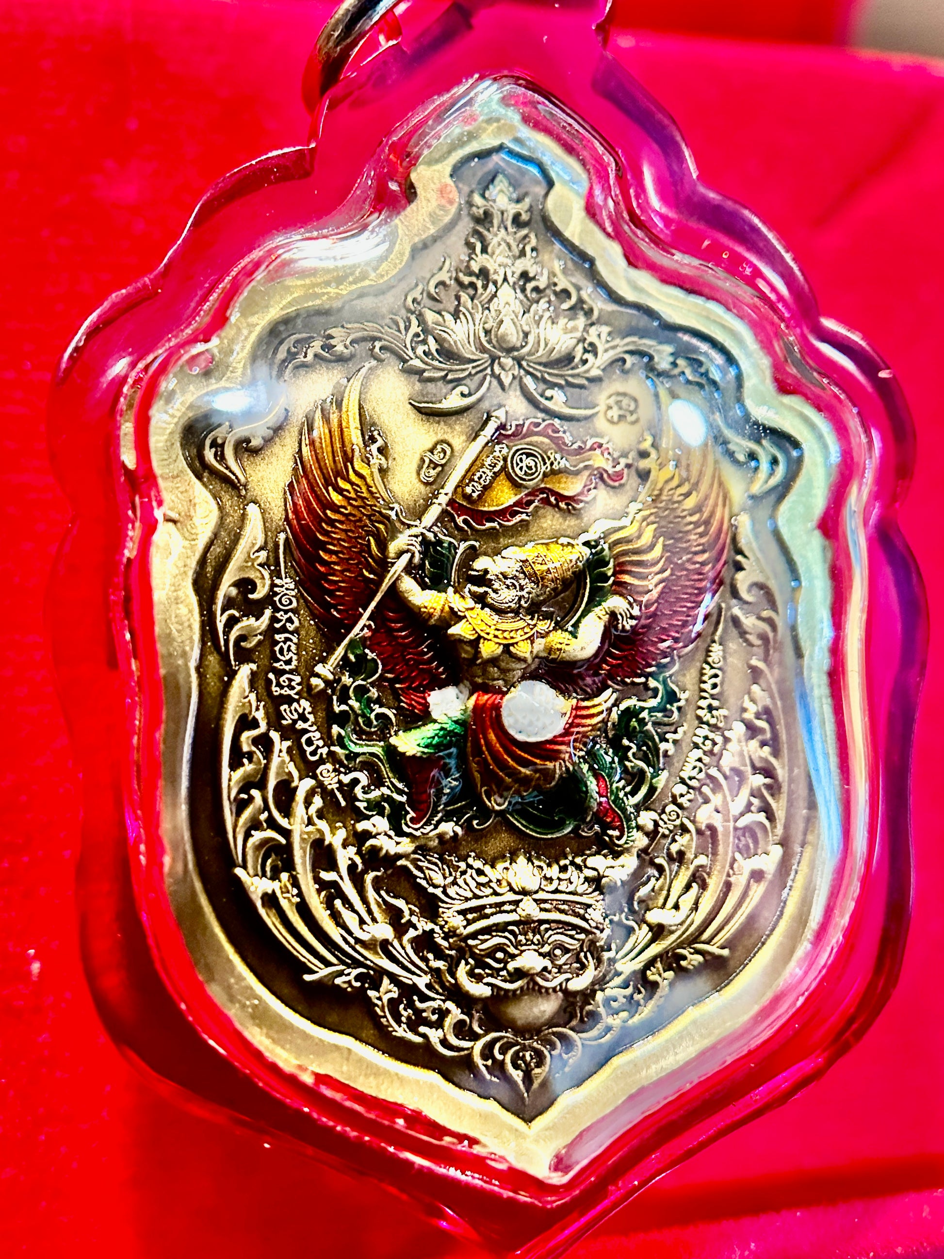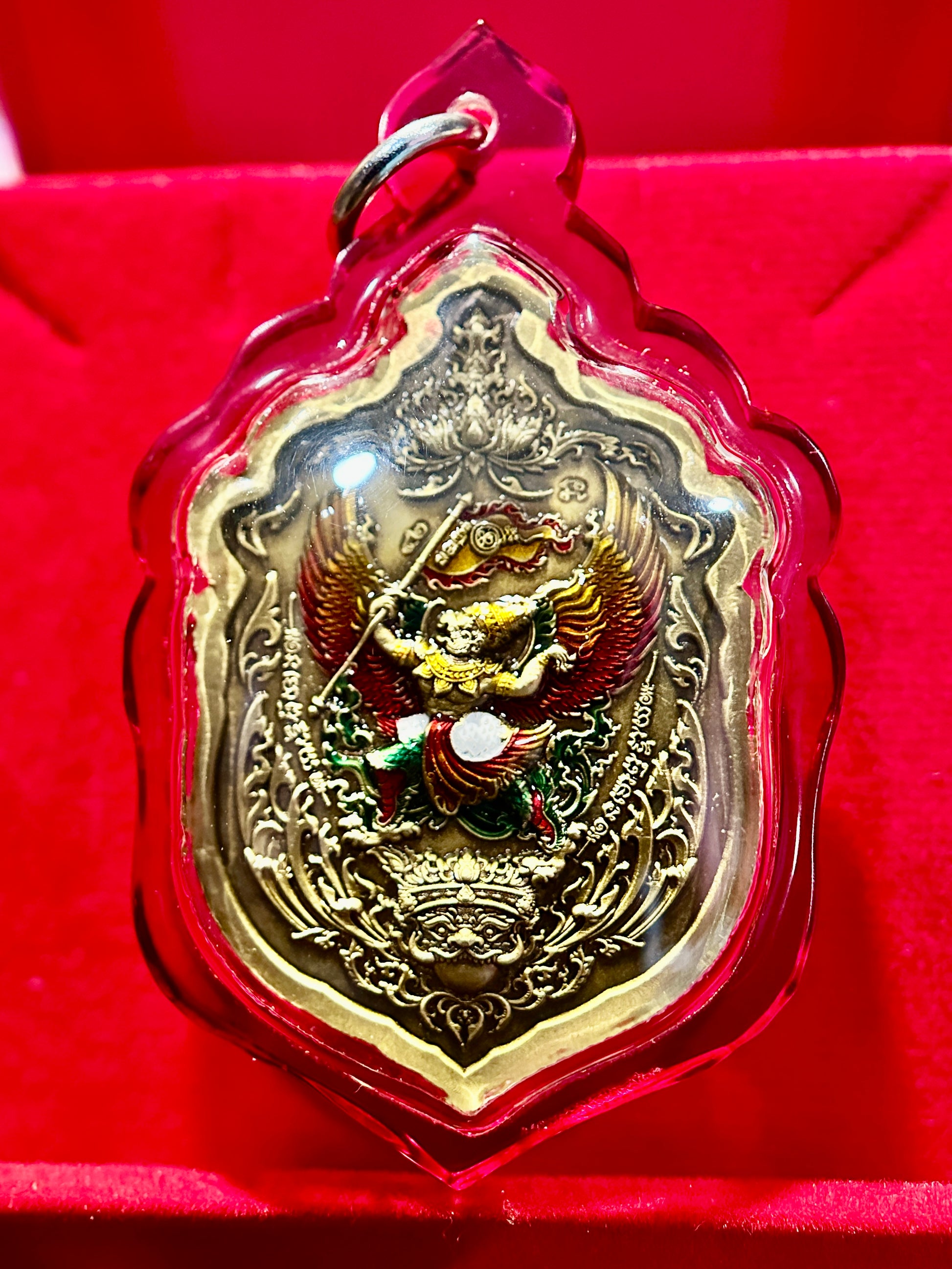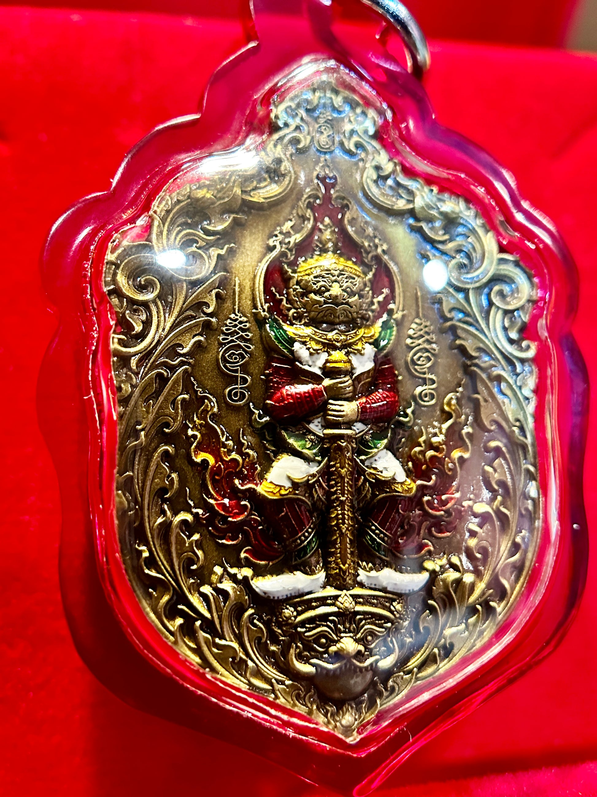 Encased in a clear case with bold red trim, this amulet blends sacred artistry with commanding presence, making it a powerful charm of protection, prosperity, and spiritual triumph.