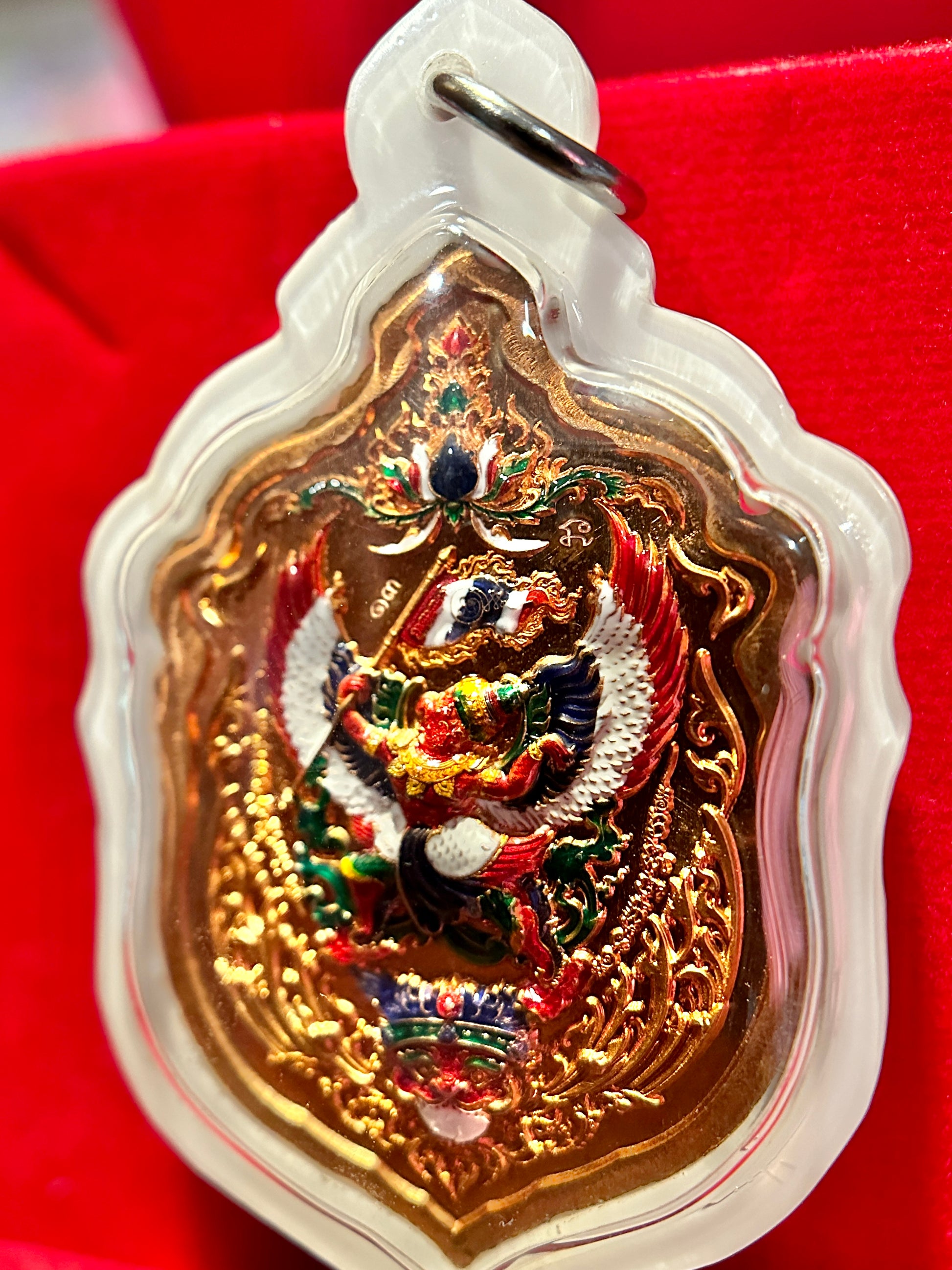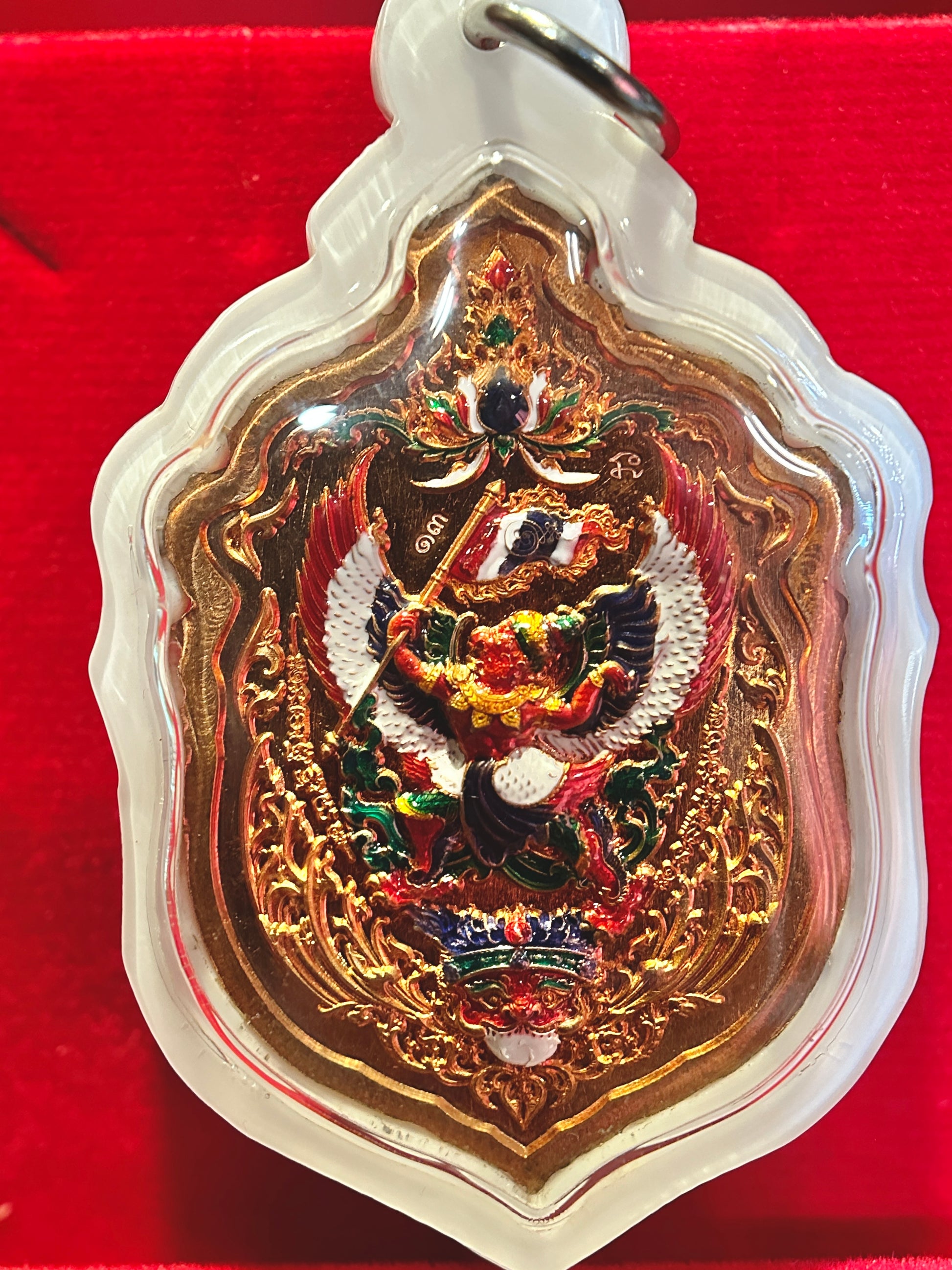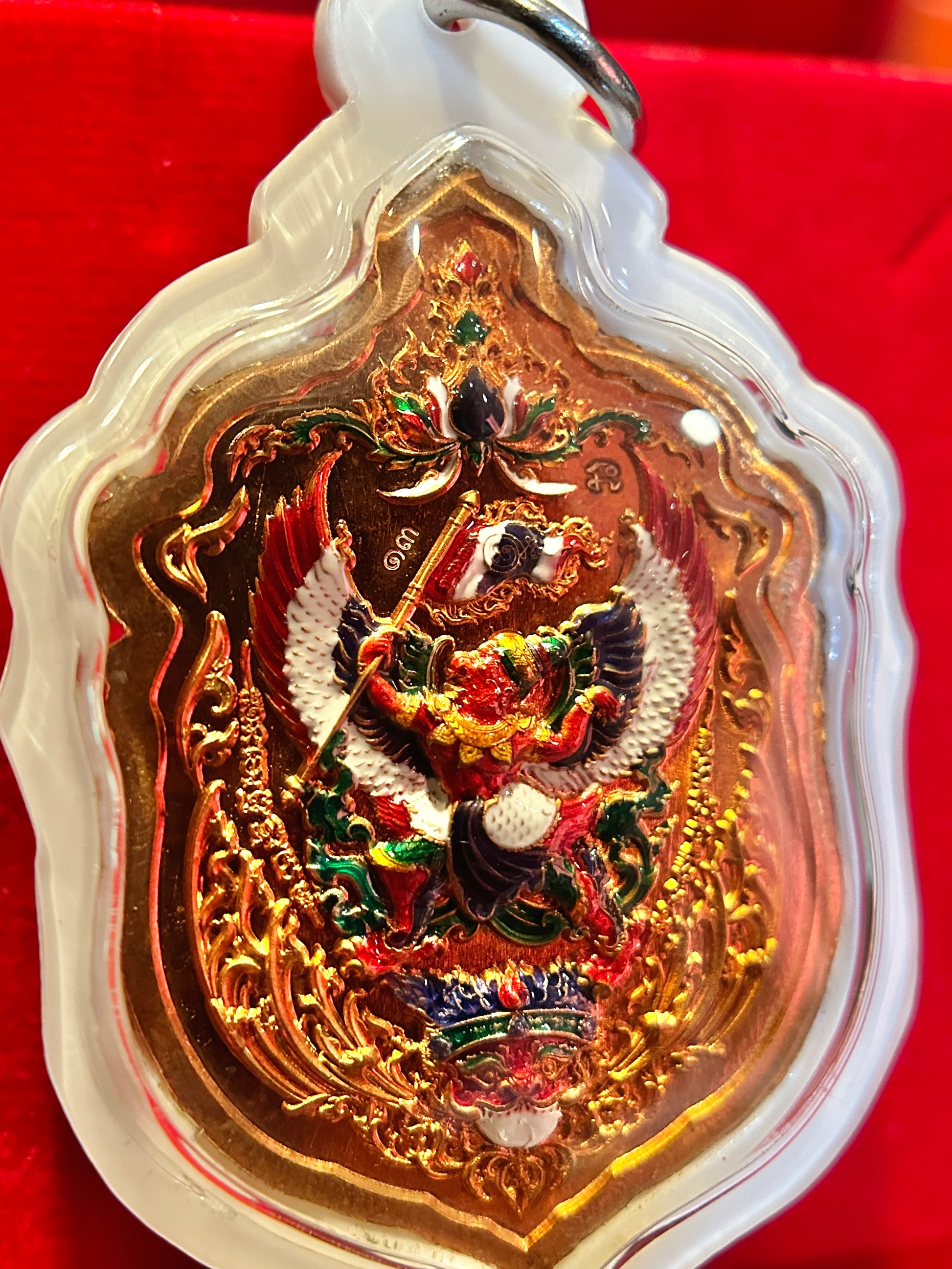 This remarkable edition honors Thailand with the red, white, and blue Thai flag colors incorporated into Tao Wessuwan’s fiery backdrop and woven into Garuda’s powerful wings on the reverse. The national colors symbolize protection (red), purity (white), and stability (blue), amplifying the amulet’s energy with patriotic and spiritual resonance.