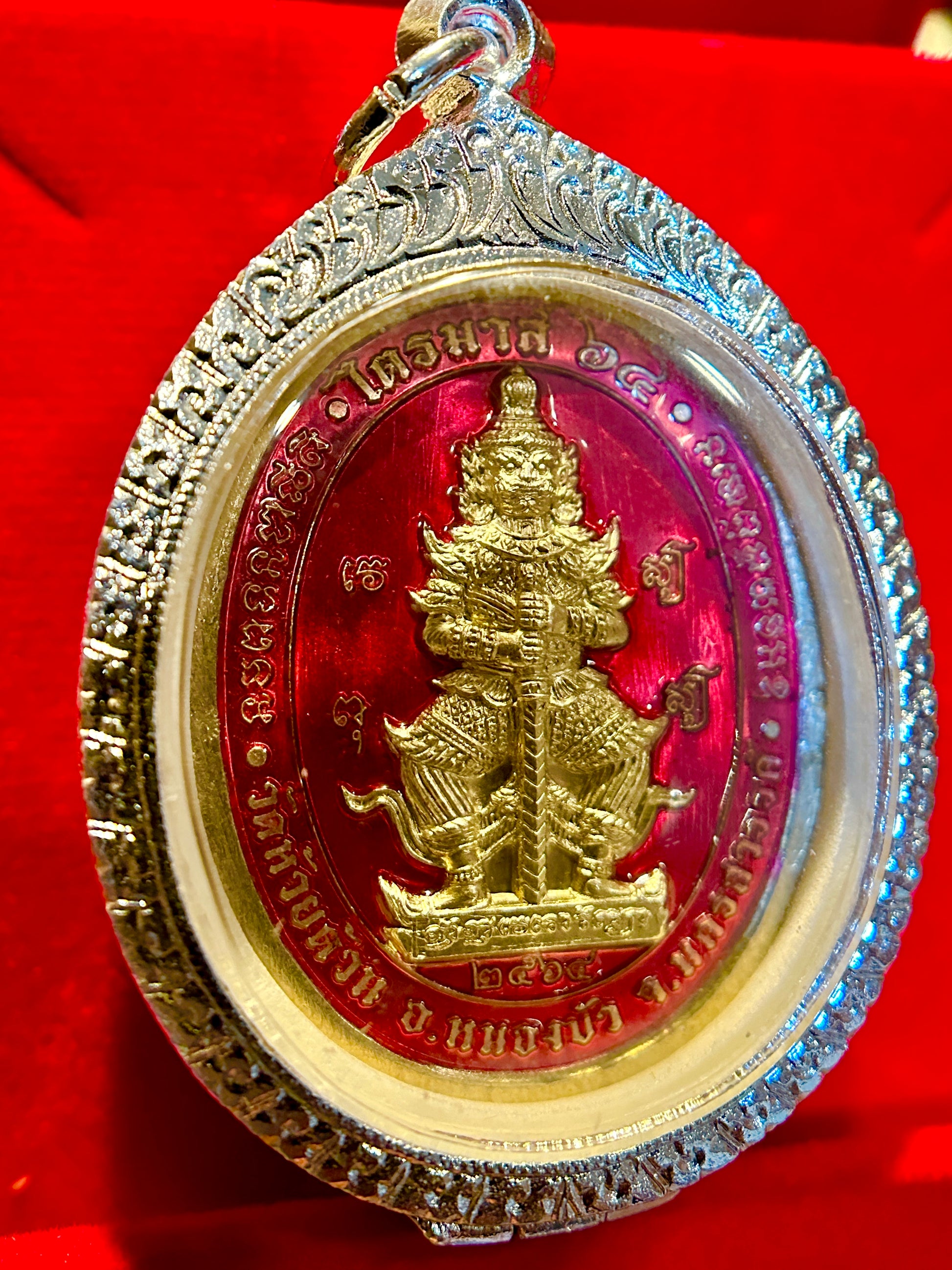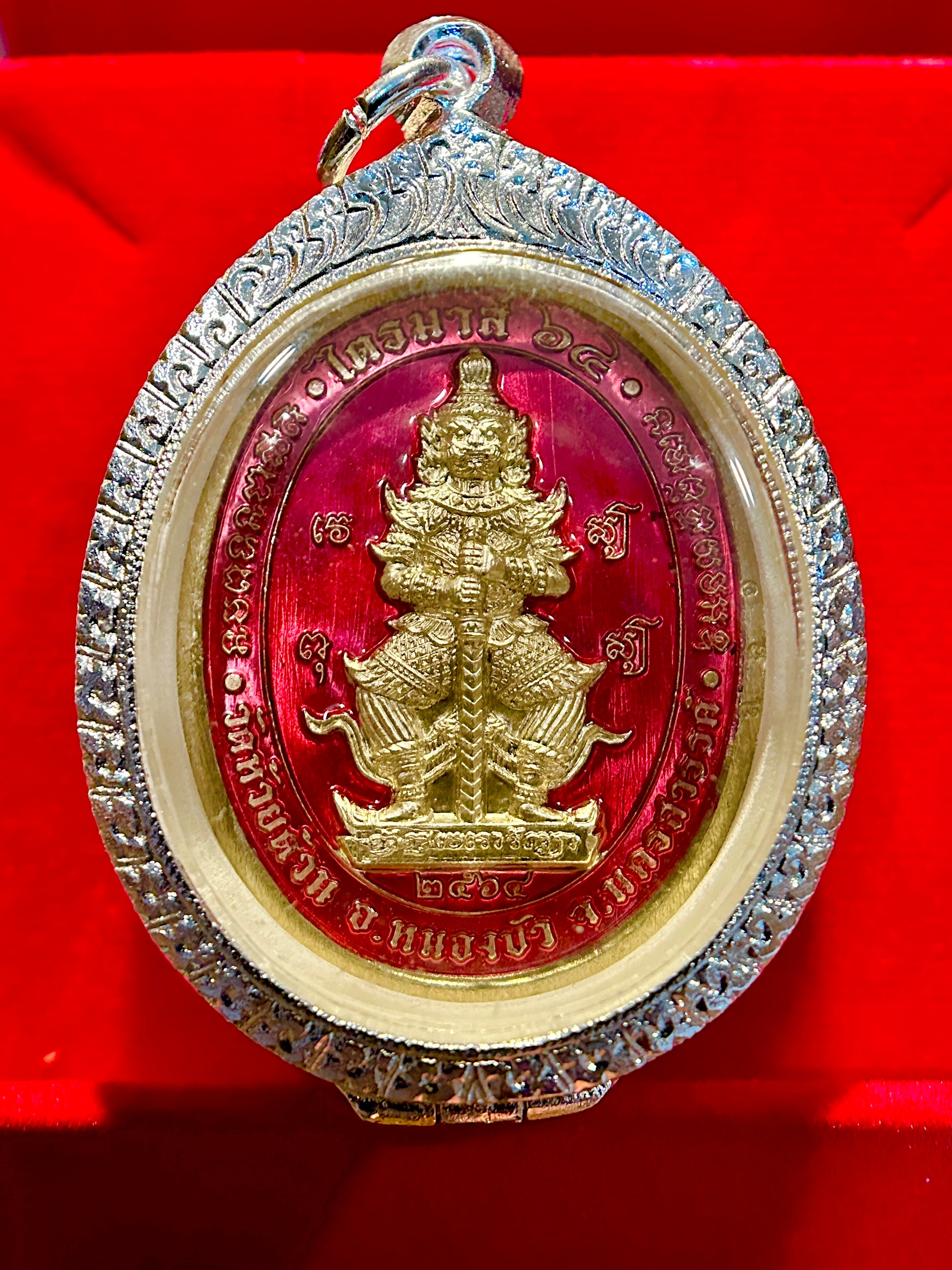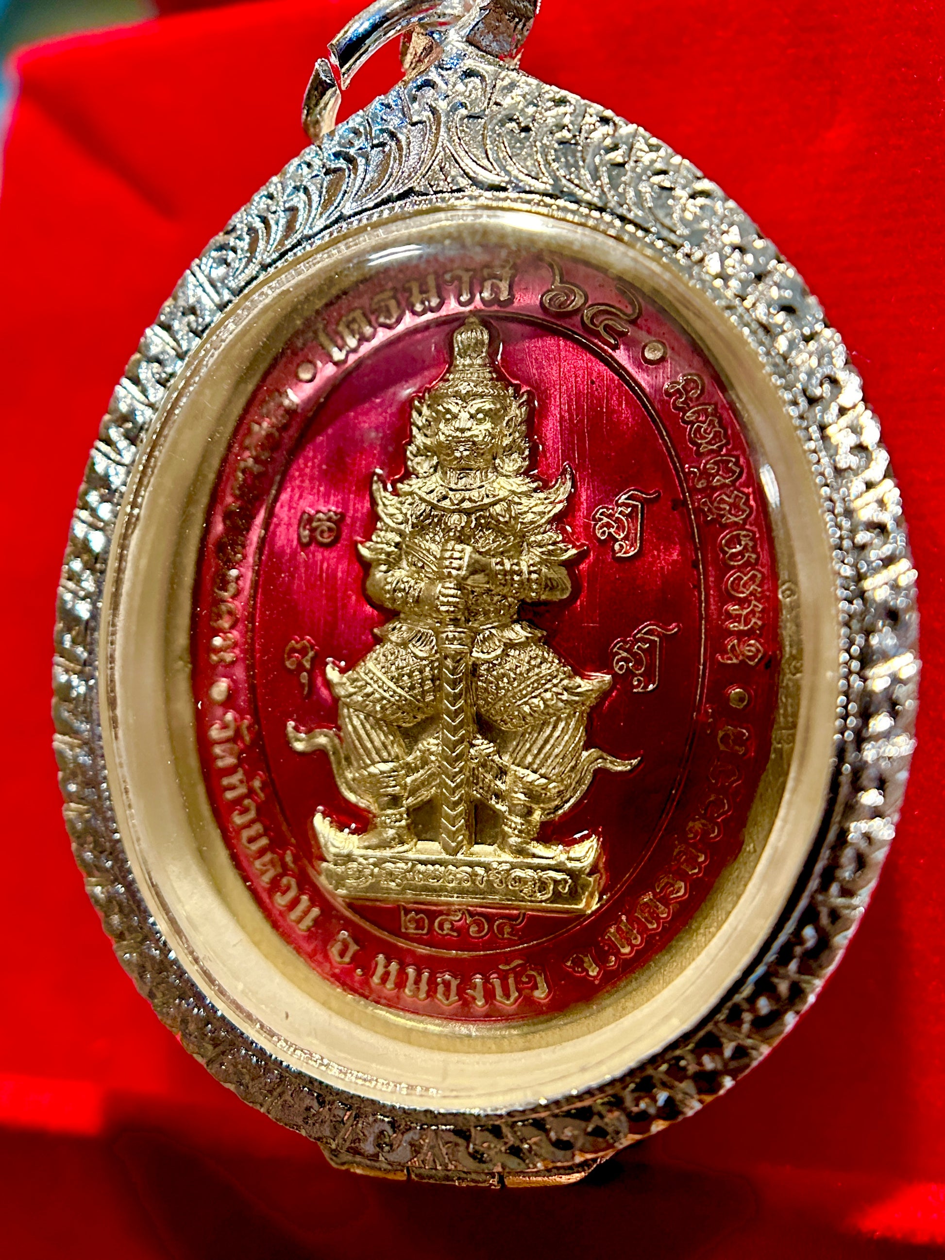 Front: Tao Wessuwan (Vaiśravaṇa), the formidable Guardian King, depicted in gold against a vibrant pink background. His presence shields against negative forces, black magic, and misfortune, while also attracting wealth and authority.