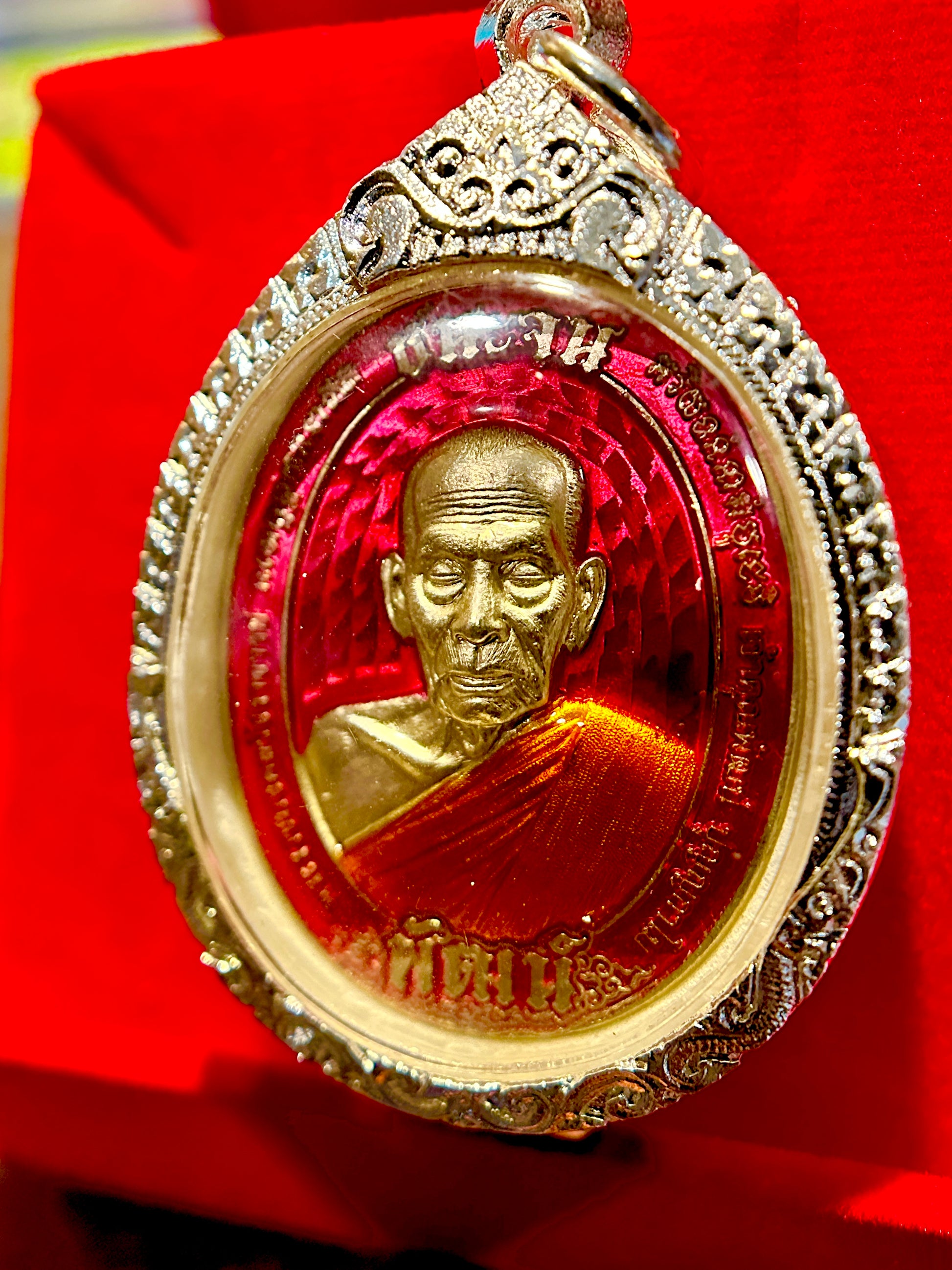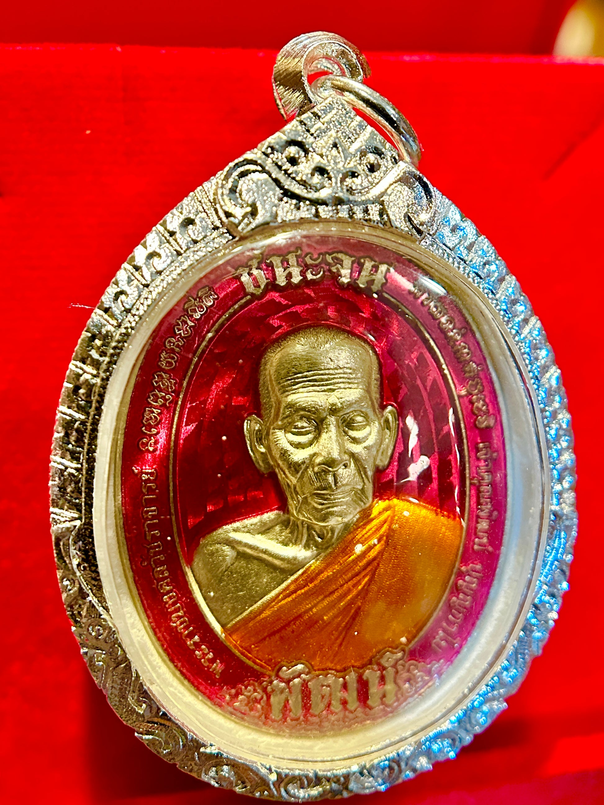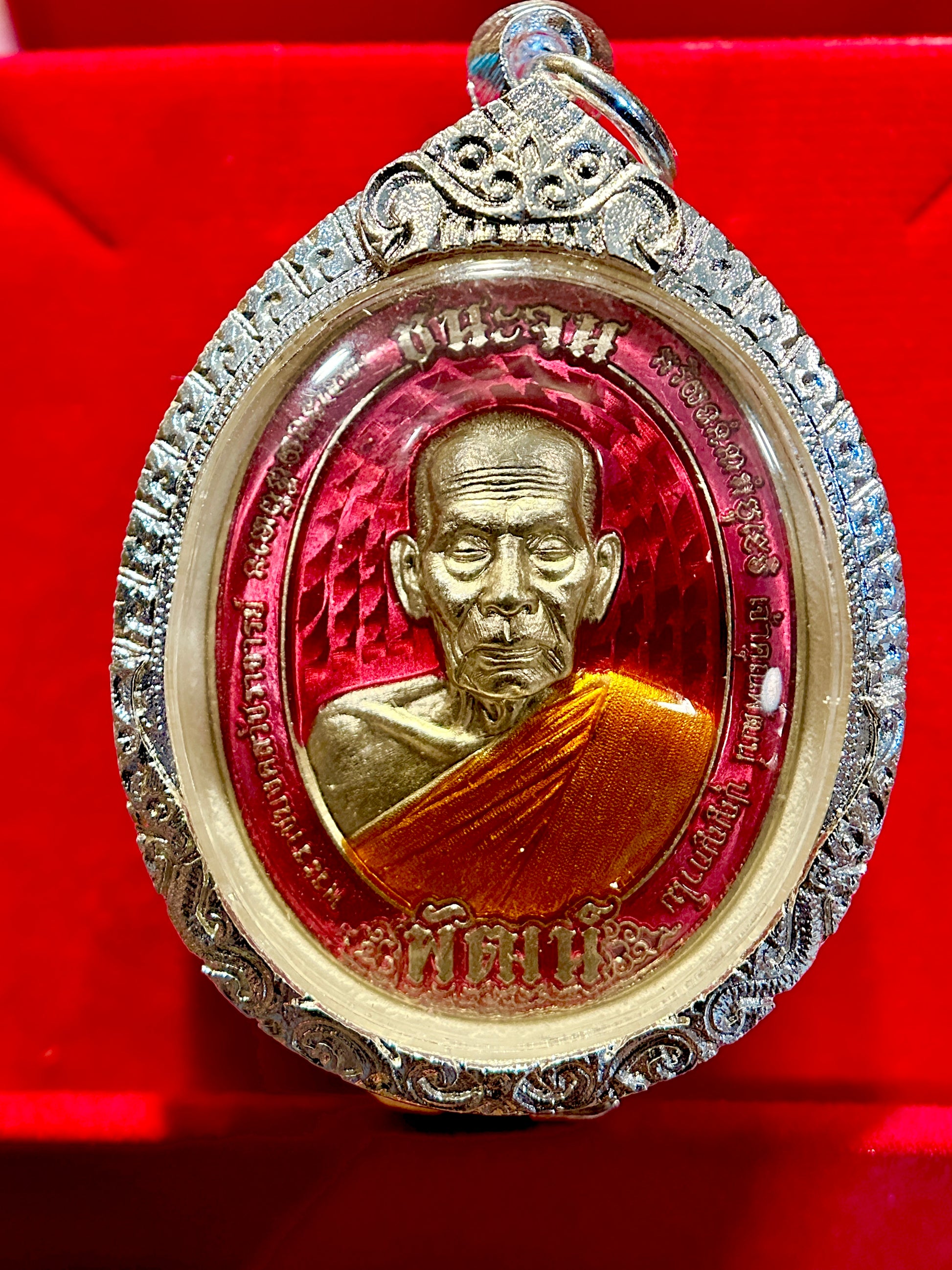 Back: Luang Phor Phat, shown in golden detail with his monk’s robe accented by the pink enamel backdrop. His image carries blessings of wisdom, prosperity, and good fortune for the wearer.