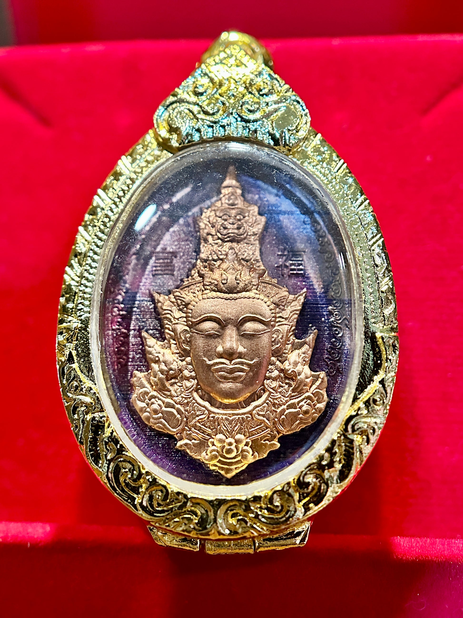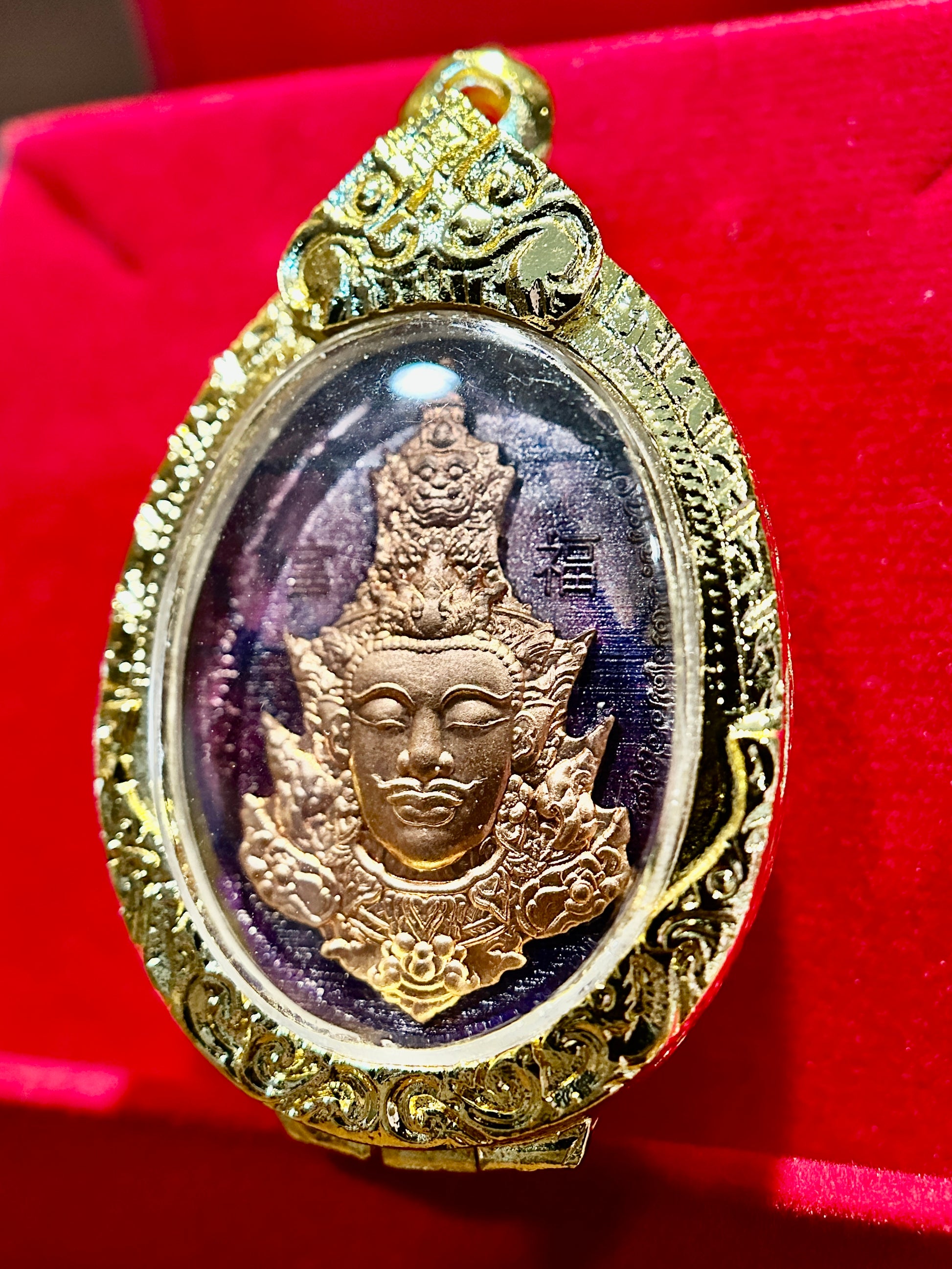 On the front, Phra Phrom (the Thai representation of Brahma) is cast in a radiant copper tone, seated in meditative grace against a deep purple backdrop—symbolizing divine wisdom, clarity of mind, and guidance through life’s crossroads.