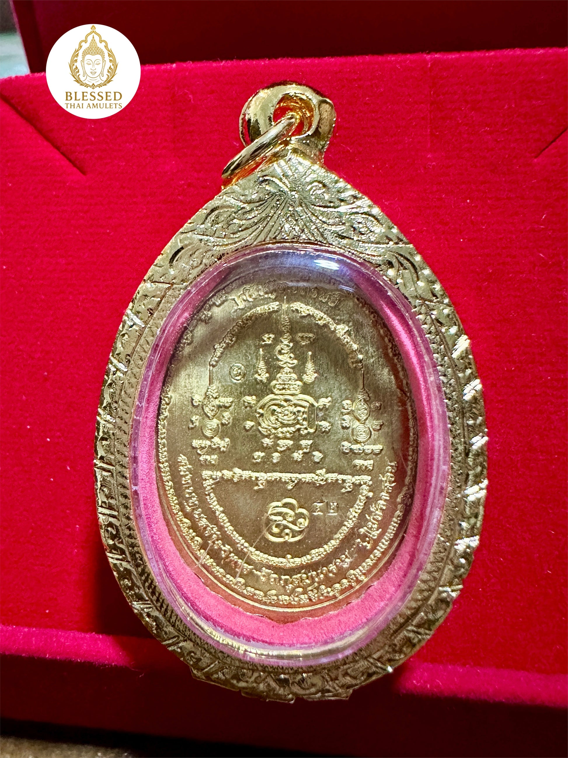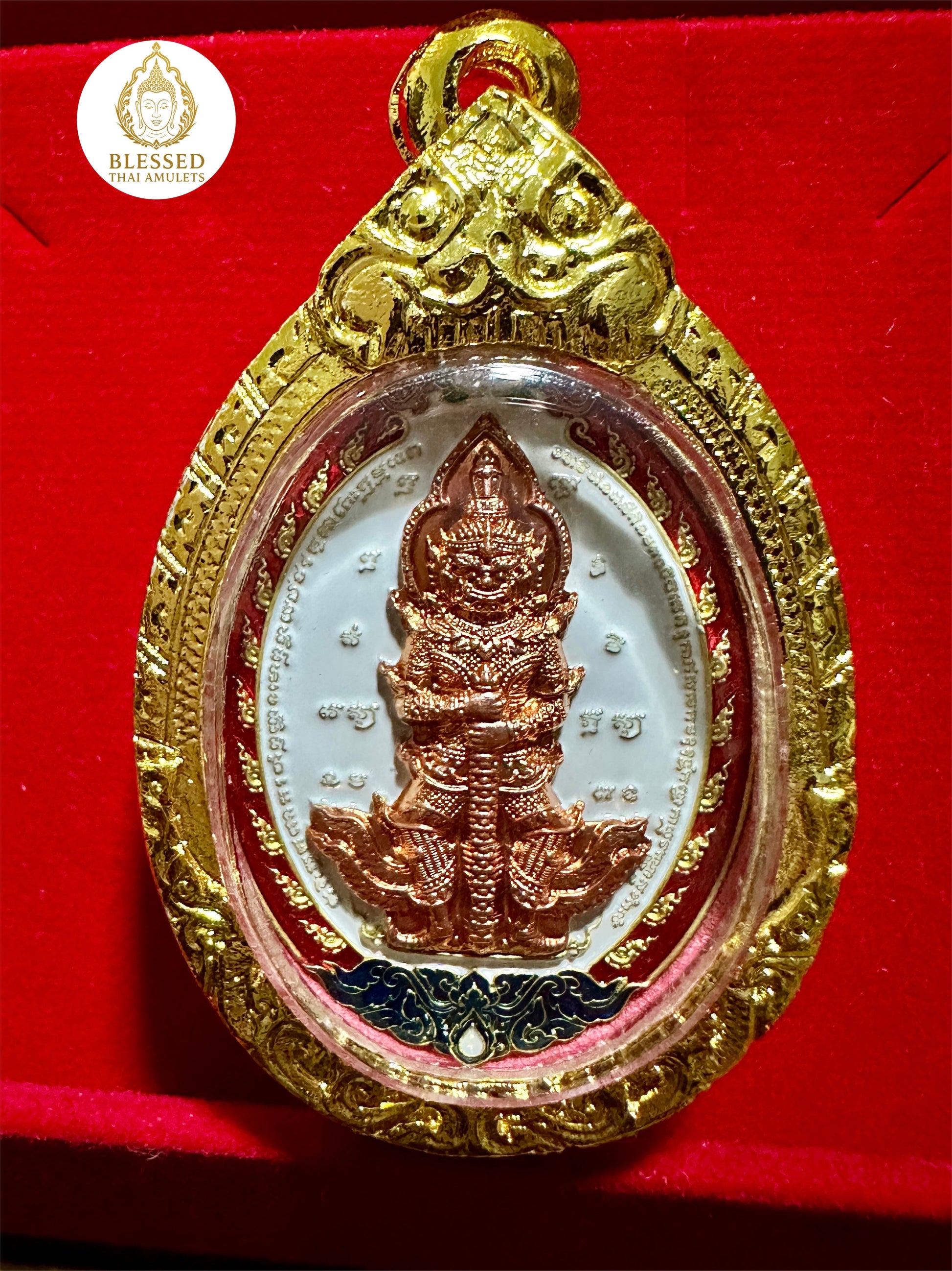 This striking Thai amulet features Tao Wessuwan (ท้าวเวสสุวรรณ), the guardian king of the North and revered protector against evil spirits, crafted in radiant copper relief over a polished white ceramic base. Surrounded by finely etched sacred script and framed in a luxurious gold casing, this piece symbolizes unwavering protection, wealth, and spiritual authority.
