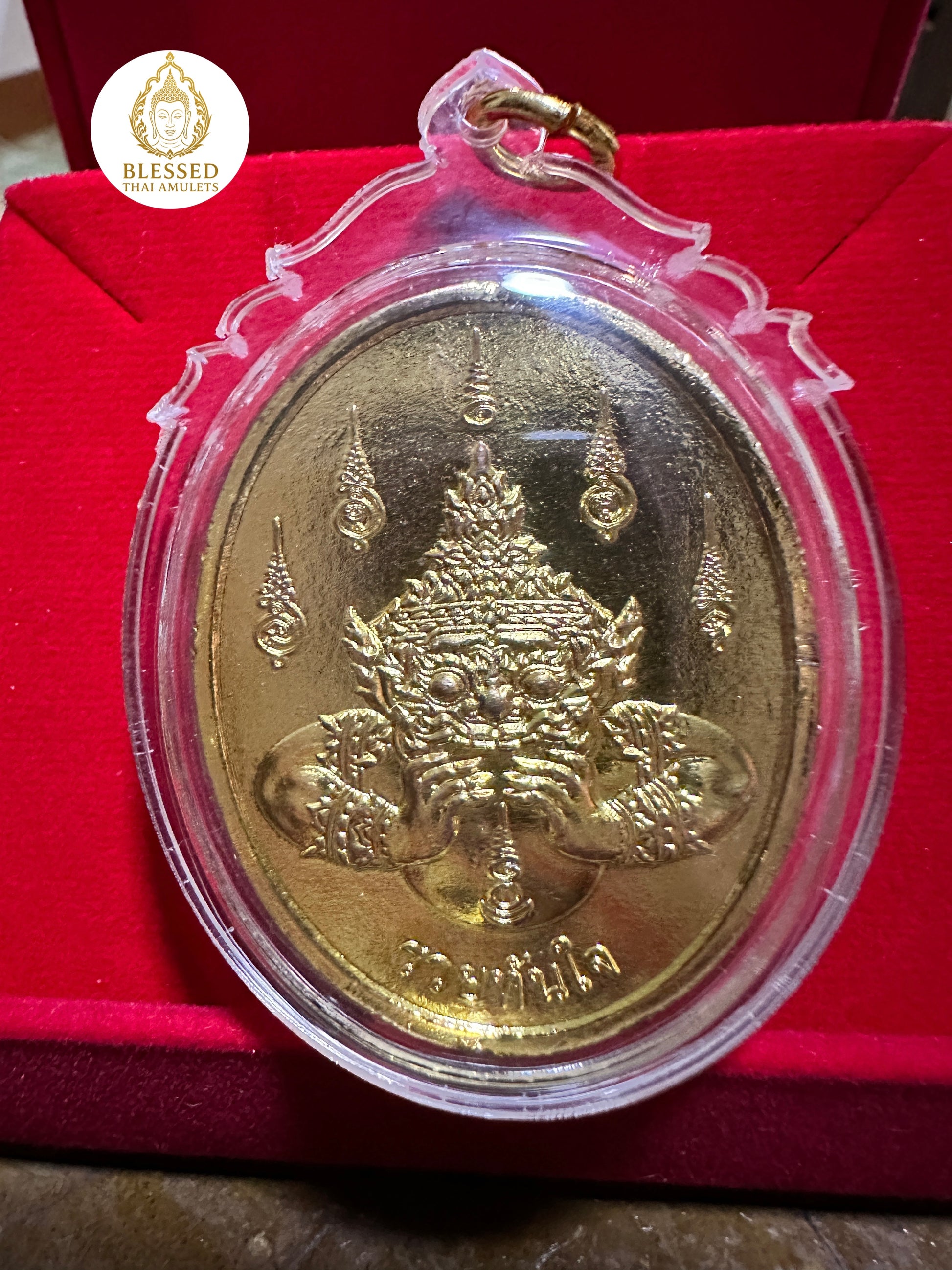 The back of the amulet features the fierce face of Rahu, the celestial deity associated with eclipses and the dispelling of bad luck. His image is surrounded by mystical script and yantra markings believed to enhance spiritual fortitude, dispel negative energy, and attract fortune.