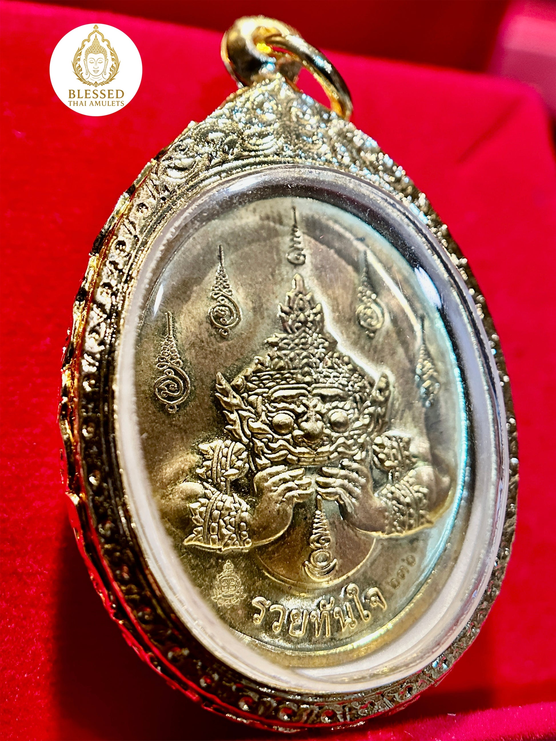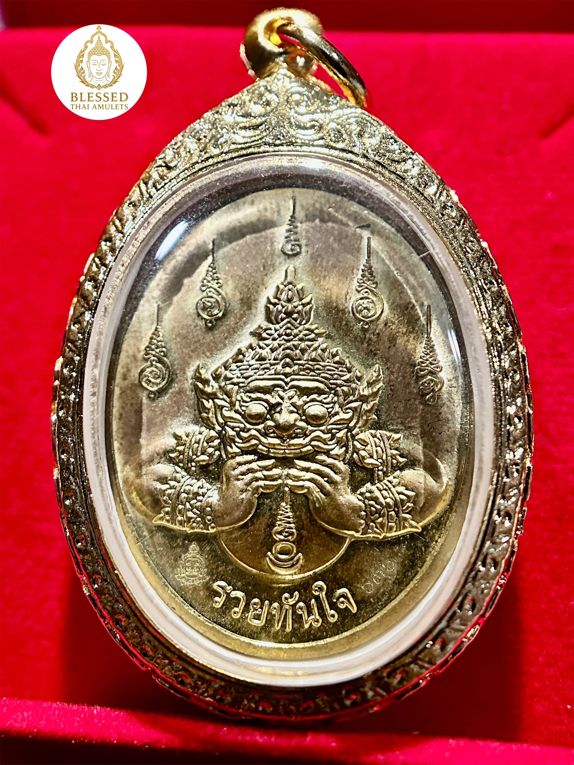(Back) – Gold Rahu with Unalome: The reverse side features the celestial deity Rahu, shown in radiant gold detail. Rahu is worshipped for his ability to swallow darkness and bad luck, making this amulet a powerful shield against negative energies. Surrounding him are Unalome symbols — sacred scripts representing the path to enlightenment and spiritual clarity.
