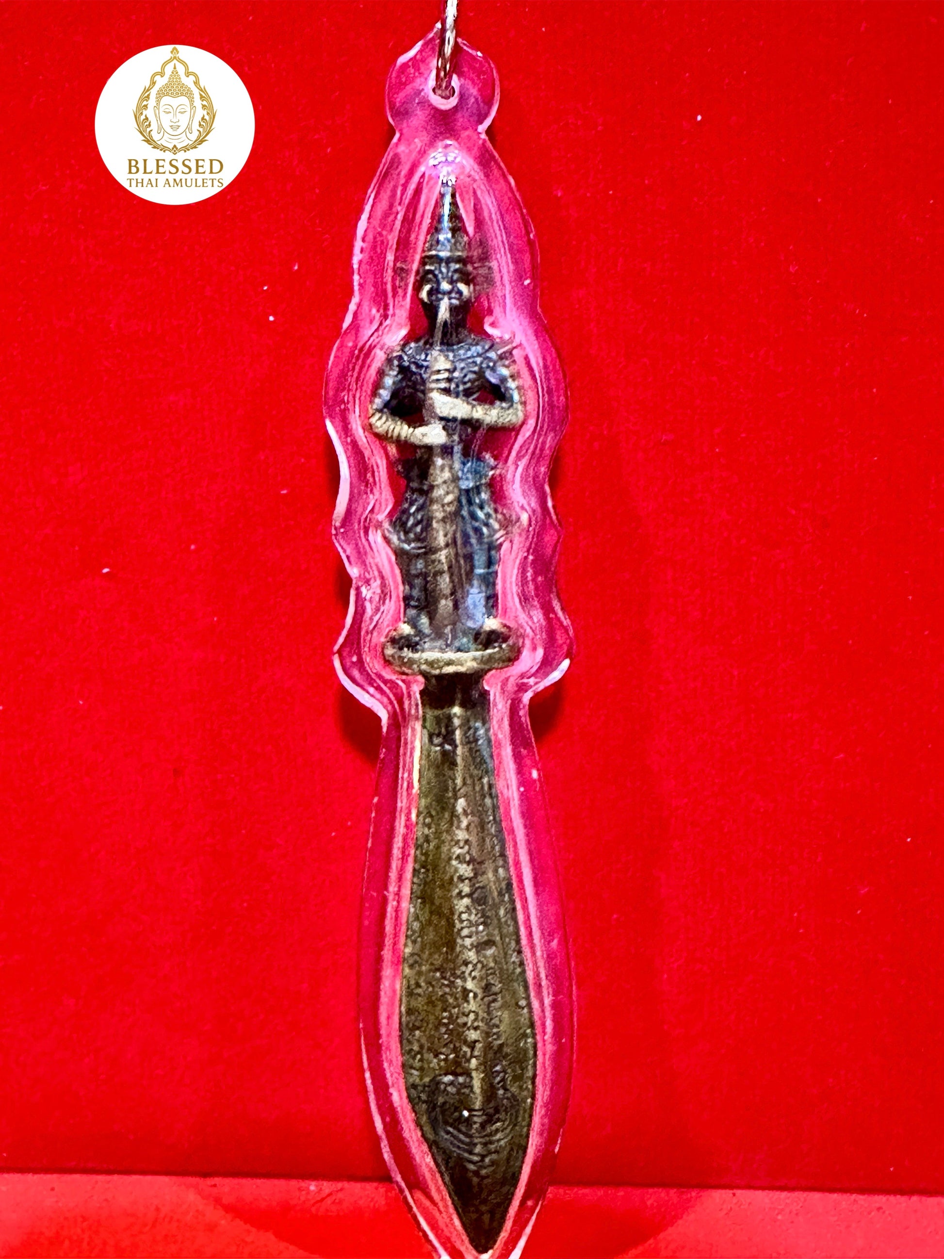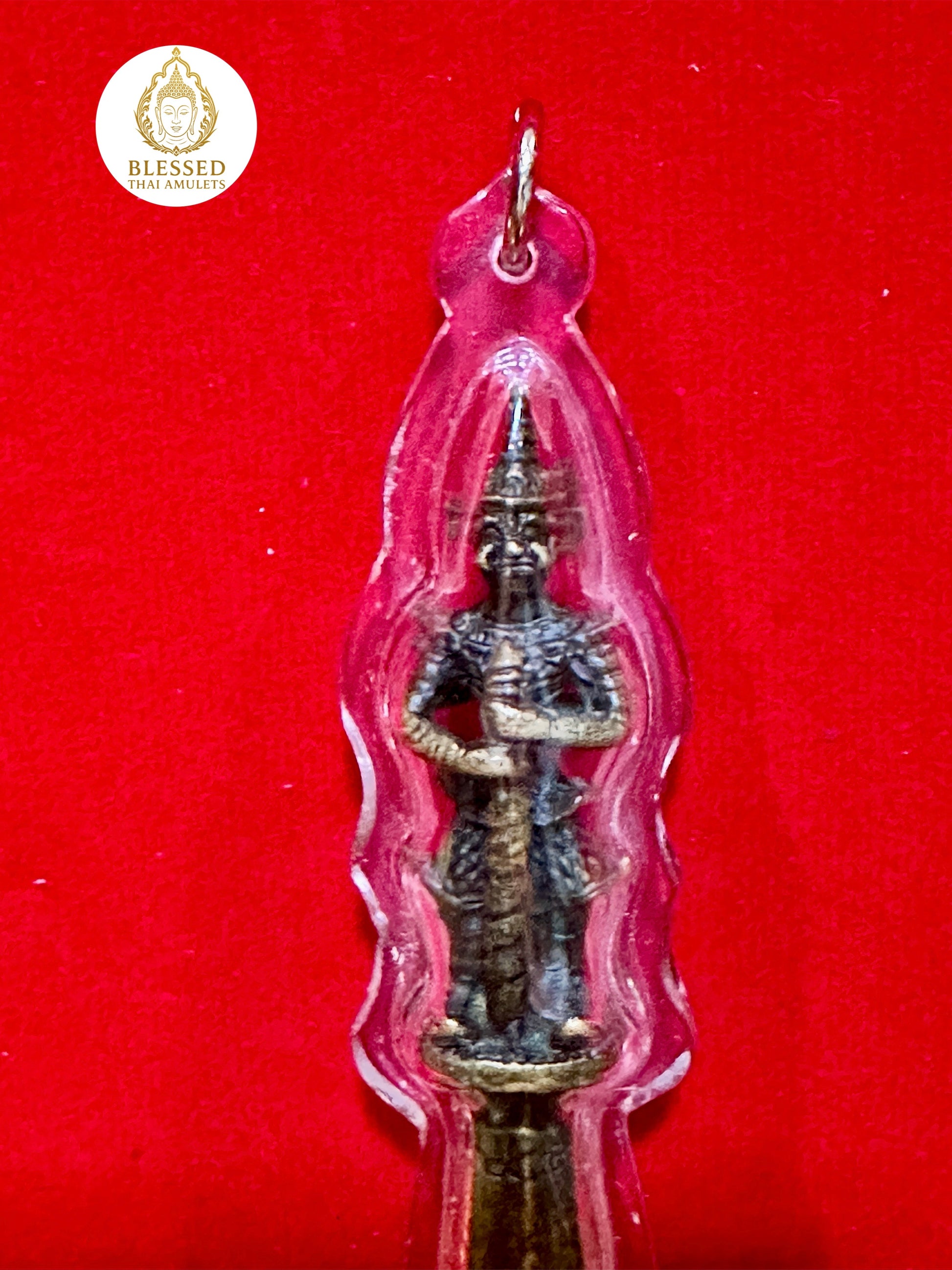 This powerful ritual amulet features Tao Wessuwan standing tall atop a sacred blade inscribed with ancient protective yantras. As the fierce guardian of the North and vanquisher of evil, Tao Wessuwan embodies unshakable authority and the power to repel dark forces. The blade below him channels his energy as a spiritual weapon—cleansing negativity, warding off black magic, and sealing the spiritual threshold around its bearer.