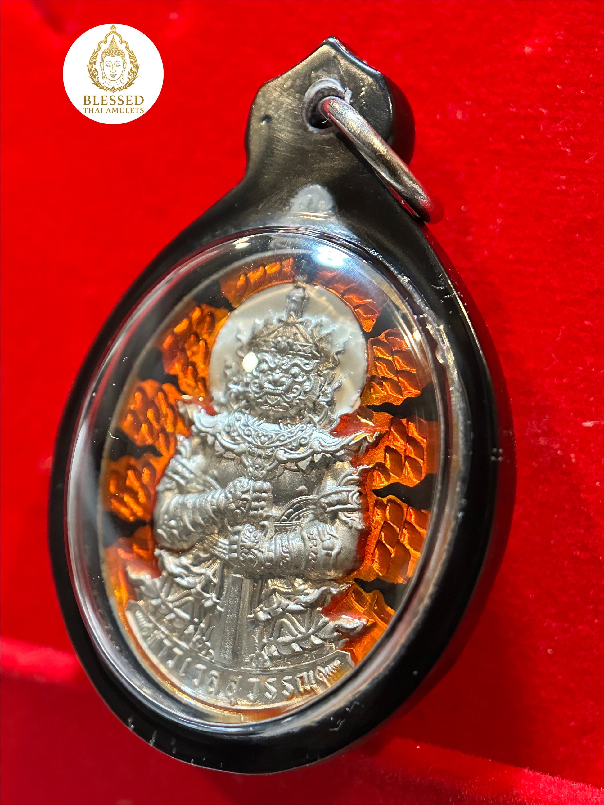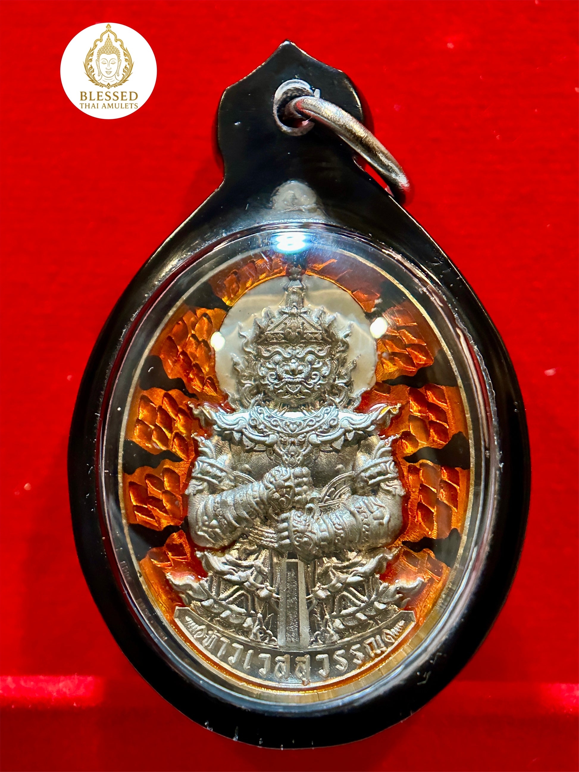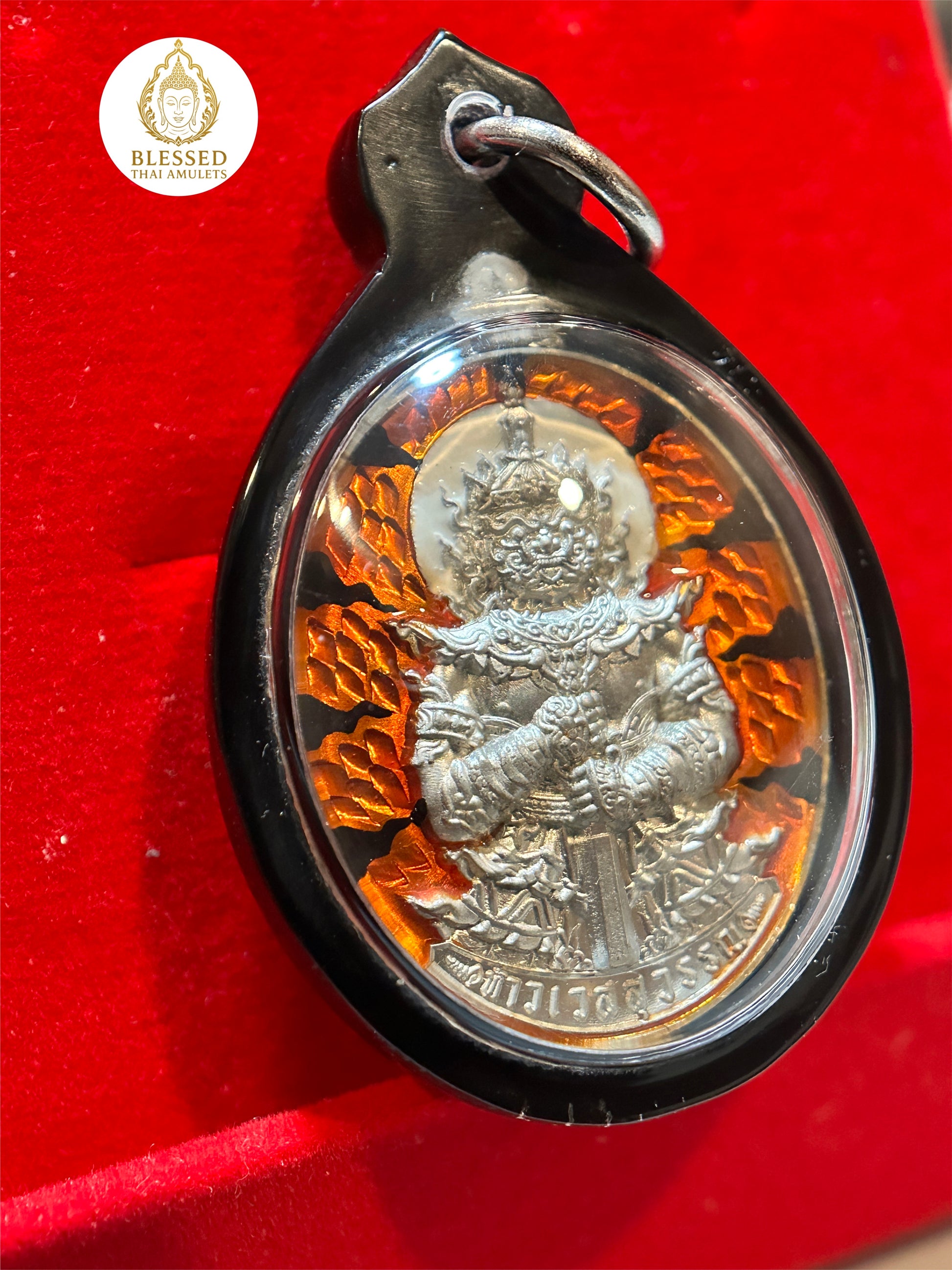 This bold and commanding amulet features Tao Wessuwan—the revered Guardian King and vanquisher of evil—cast in radiant silver and encircled by flaming red-orange banners of power. Known as a fierce protector against malevolent forces, Tao Wessuwan is also invoked for wealth, authority, and spiritual strength.