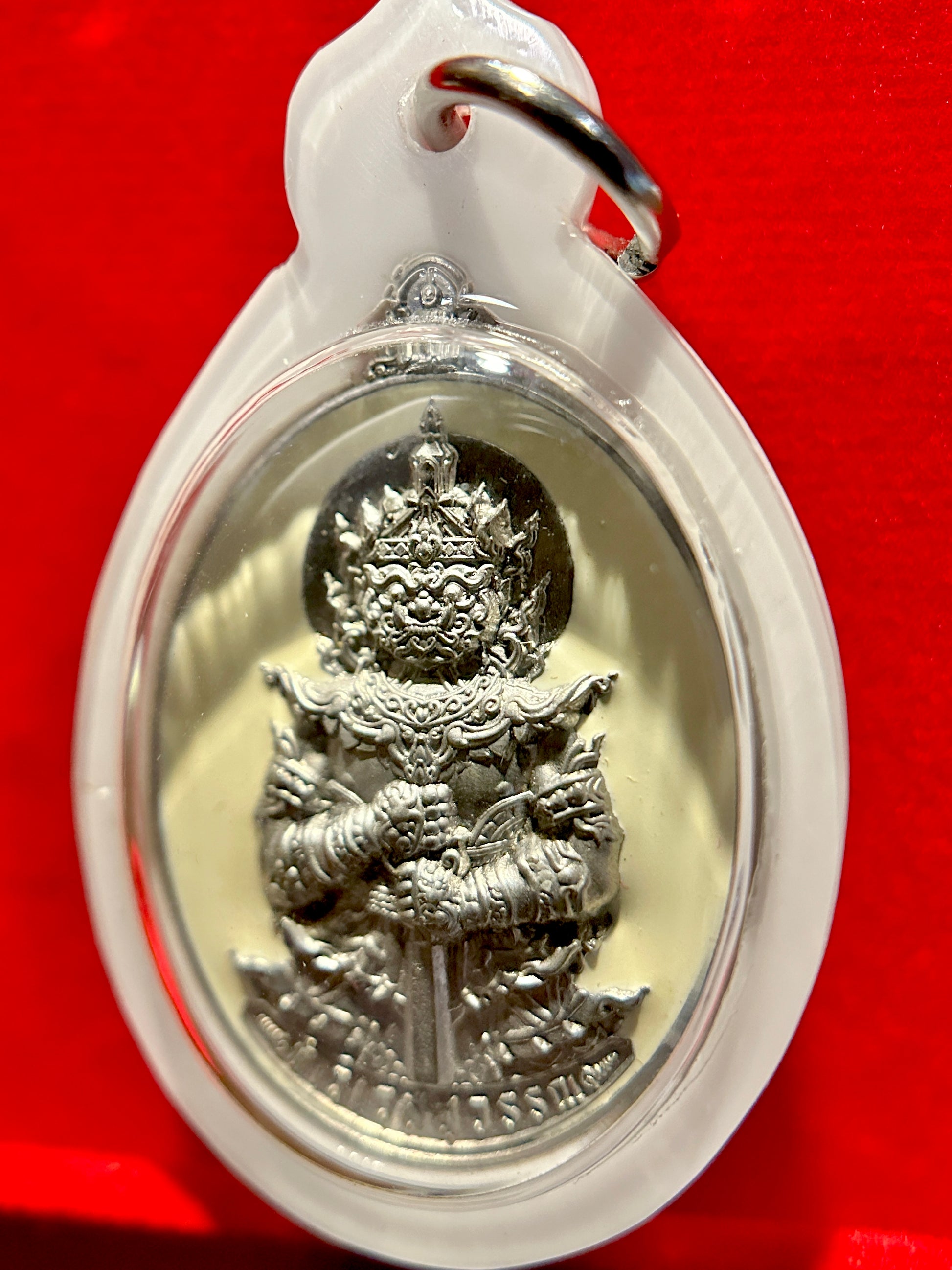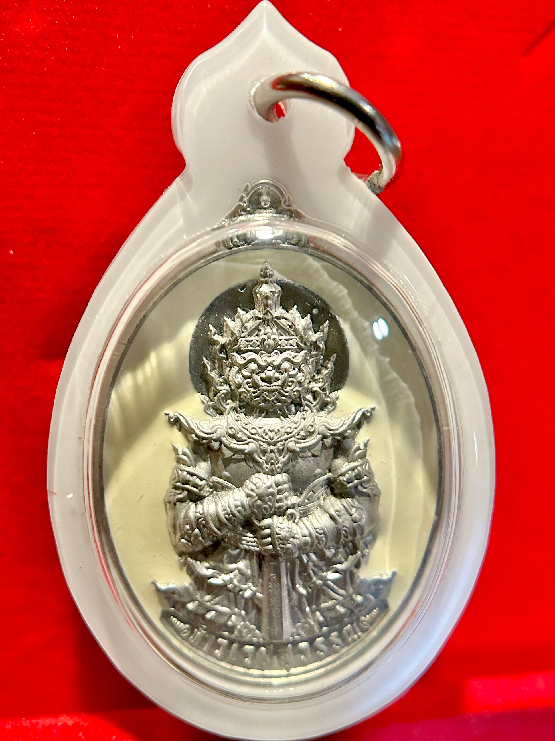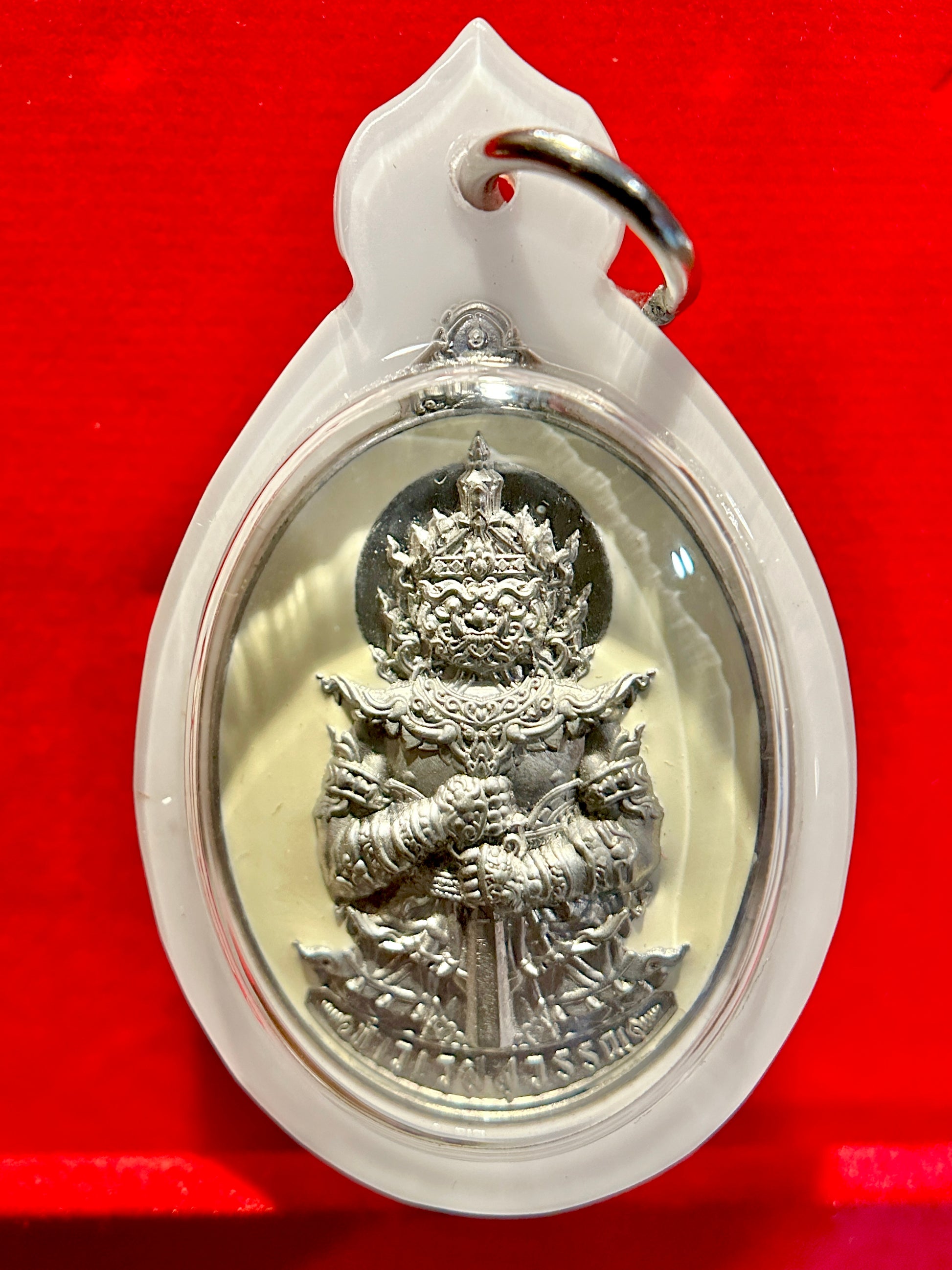 This powerful amulet features Tao Wessuwan (Vaiśravaṇa), the revered King of Yaksha and Guardian of Wealth. Cast in a brilliant silver finish and framed in a white protective case, Tao Wessuwan is depicted standing tall with his sword of authority, radiating an aura of strength and fearlessness. The intricate flame-like motifs surrounding him symbolize purification, burning away negativity and obstacles to clear the path for success, prosperity, and spiritual protection.