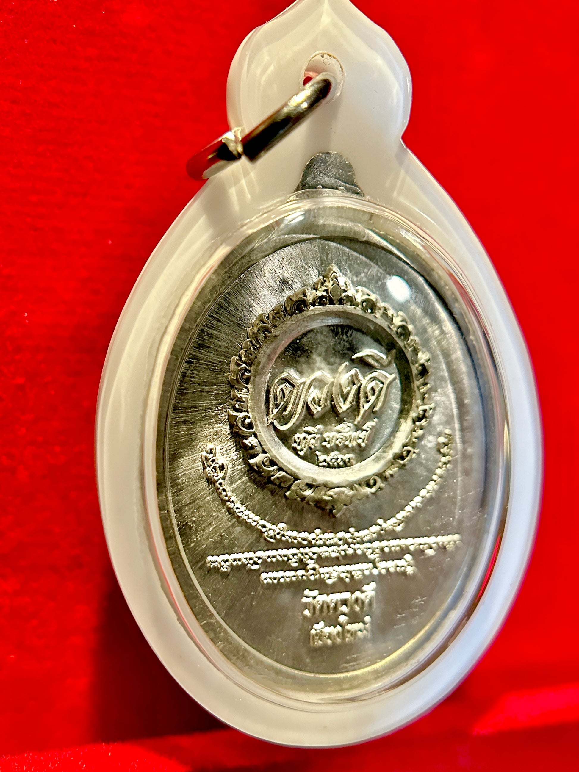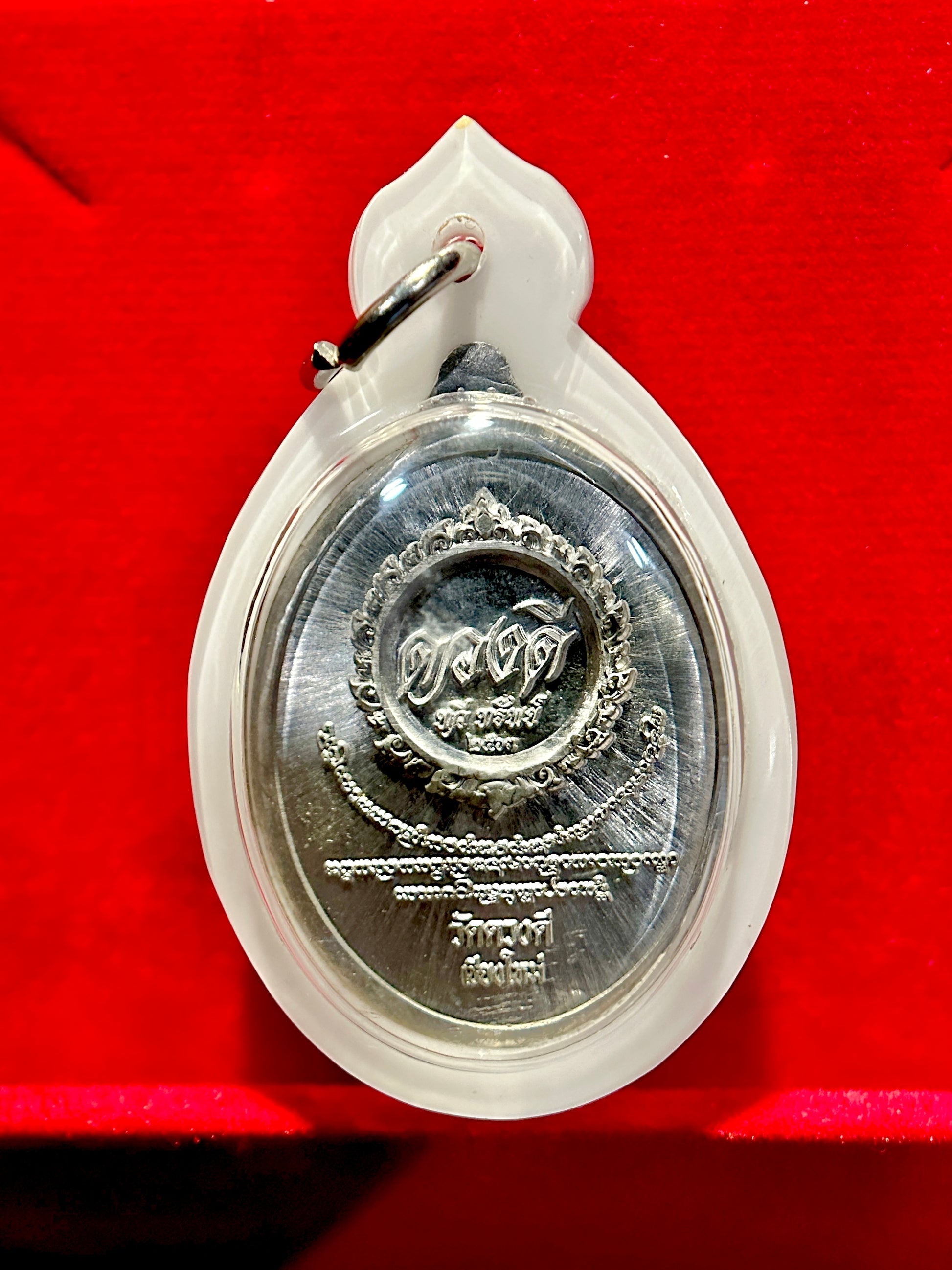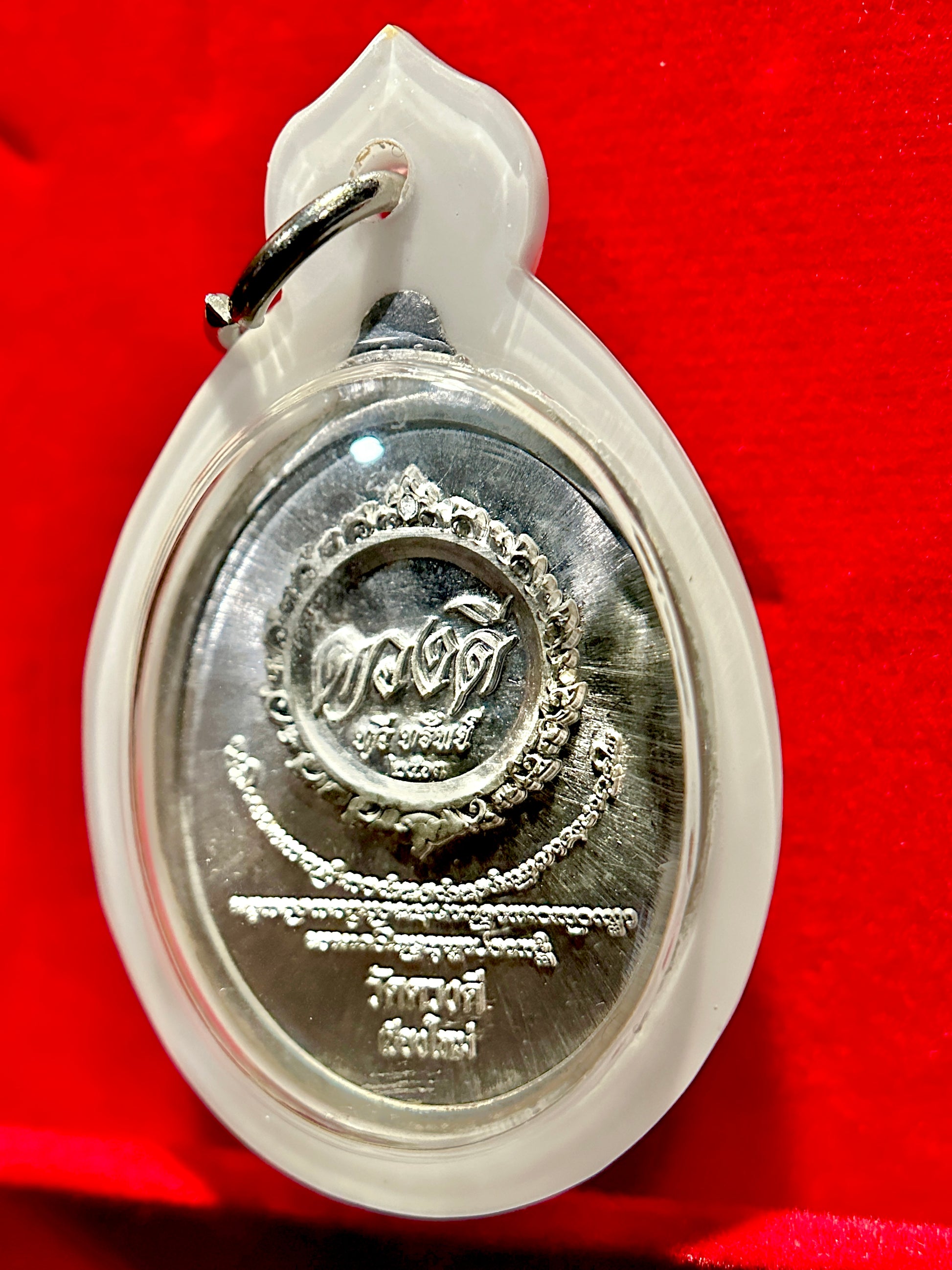 This powerful amulet features Tao Wessuwan (Vaiśravaṇa), the revered King of Yaksha and Guardian of Wealth. Cast in a brilliant silver finish and framed in a white protective case, Tao Wessuwan is depicted standing tall with his sword of authority, radiating an aura of strength and fearlessness. The intricate flame-like motifs surrounding him symbolize purification, burning away negativity and obstacles to clear the path for success, prosperity, and spiritual protection.