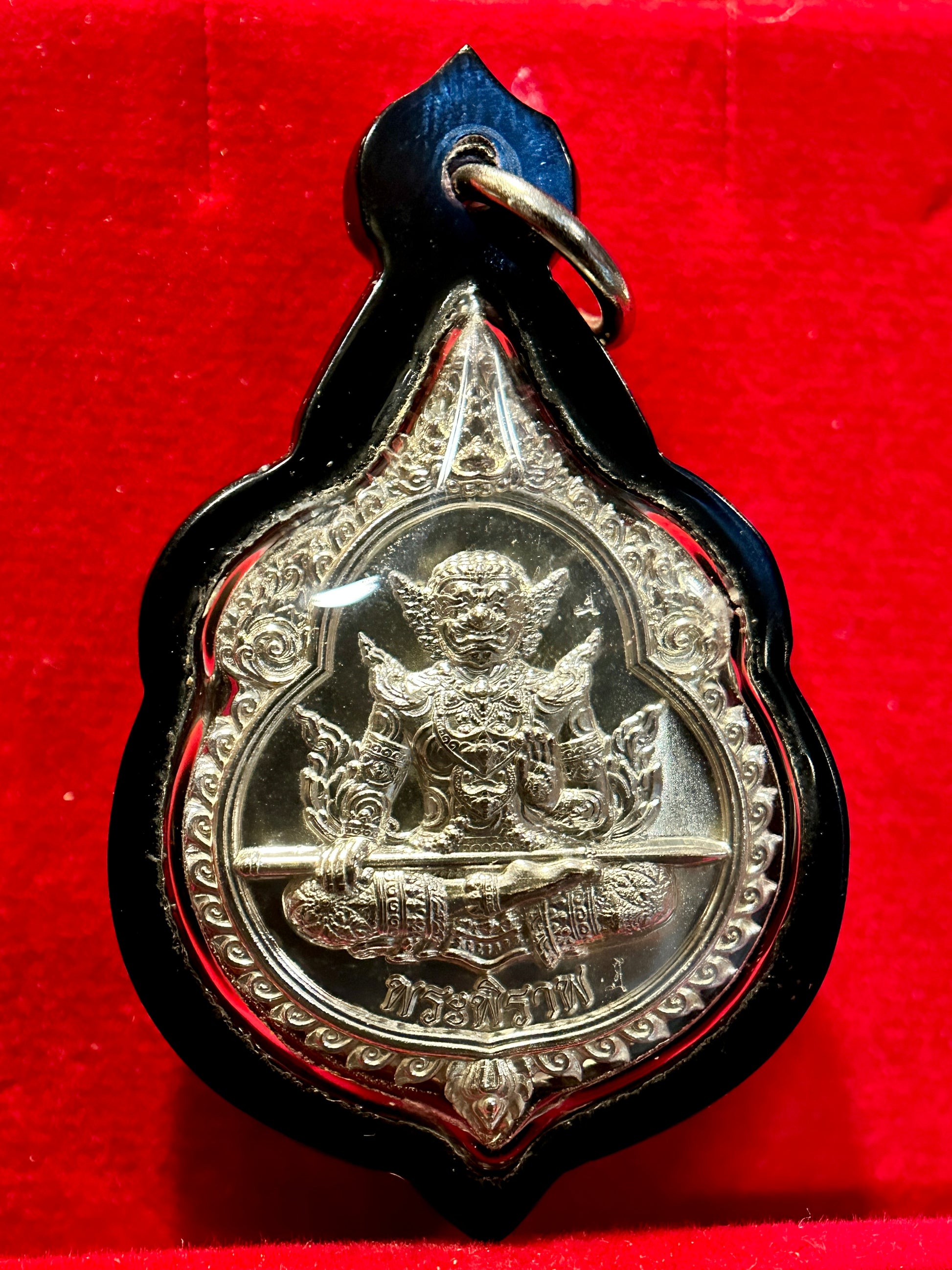 Beautifully cast in silver, Tao Wessuwan sits in full armor holding his staff of authority. This posture represents immovable strength, spiritual protection, and the ability to overcome hidden dangers and harmful energies.
