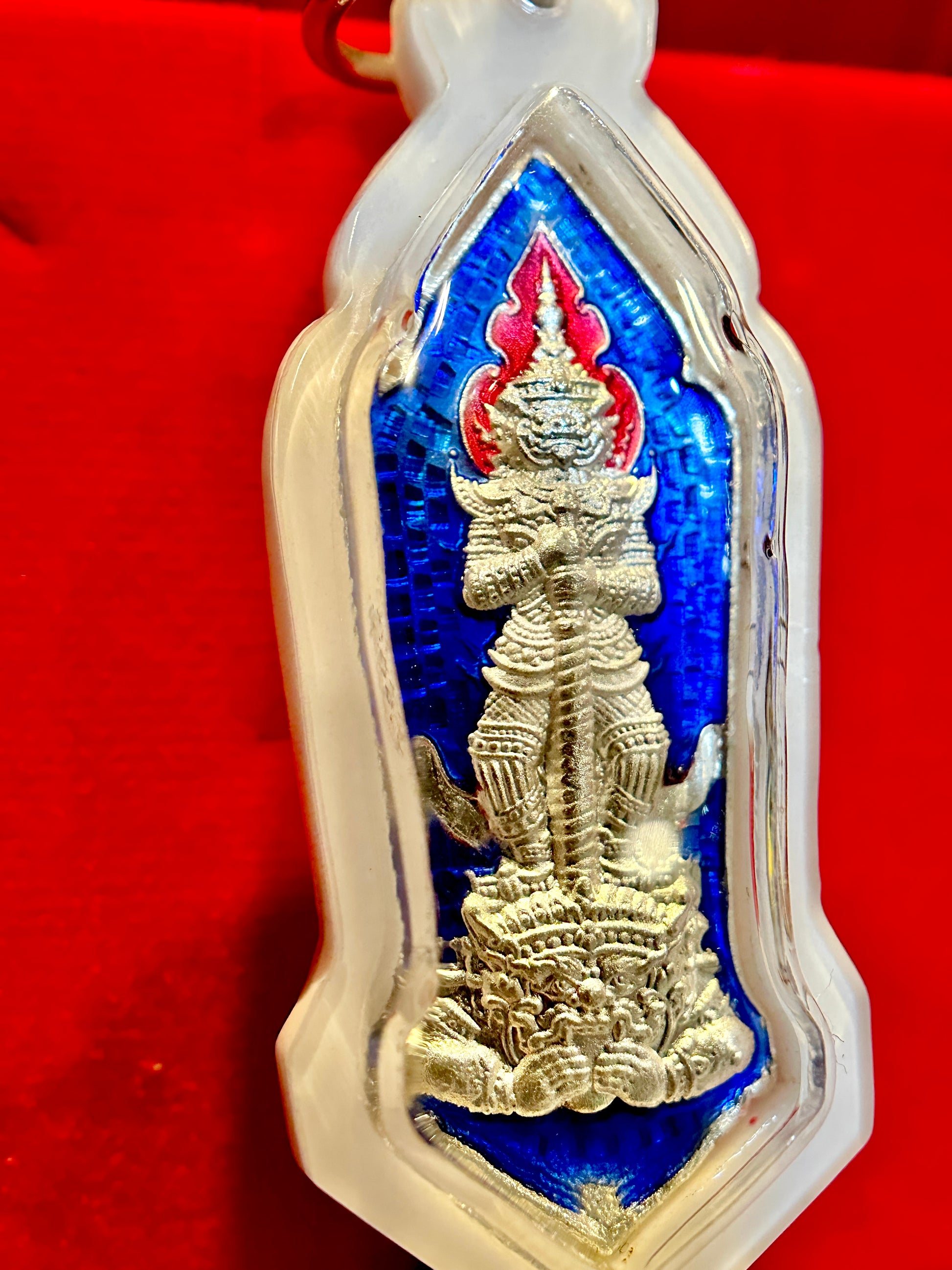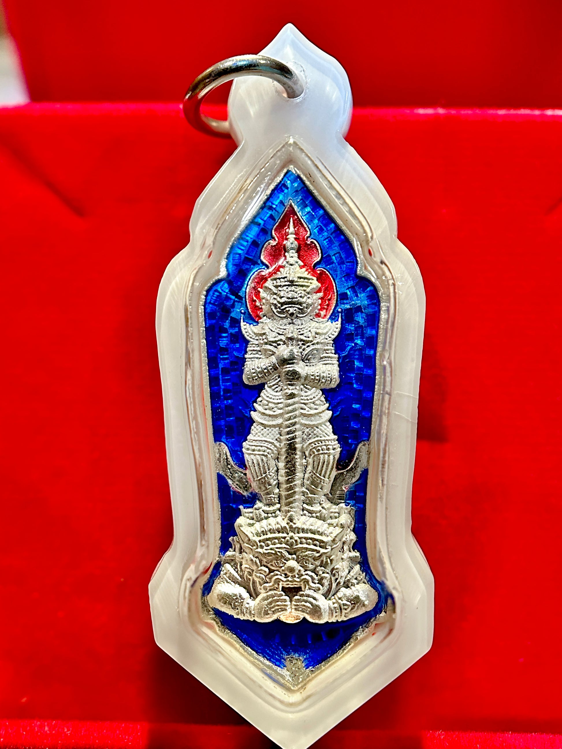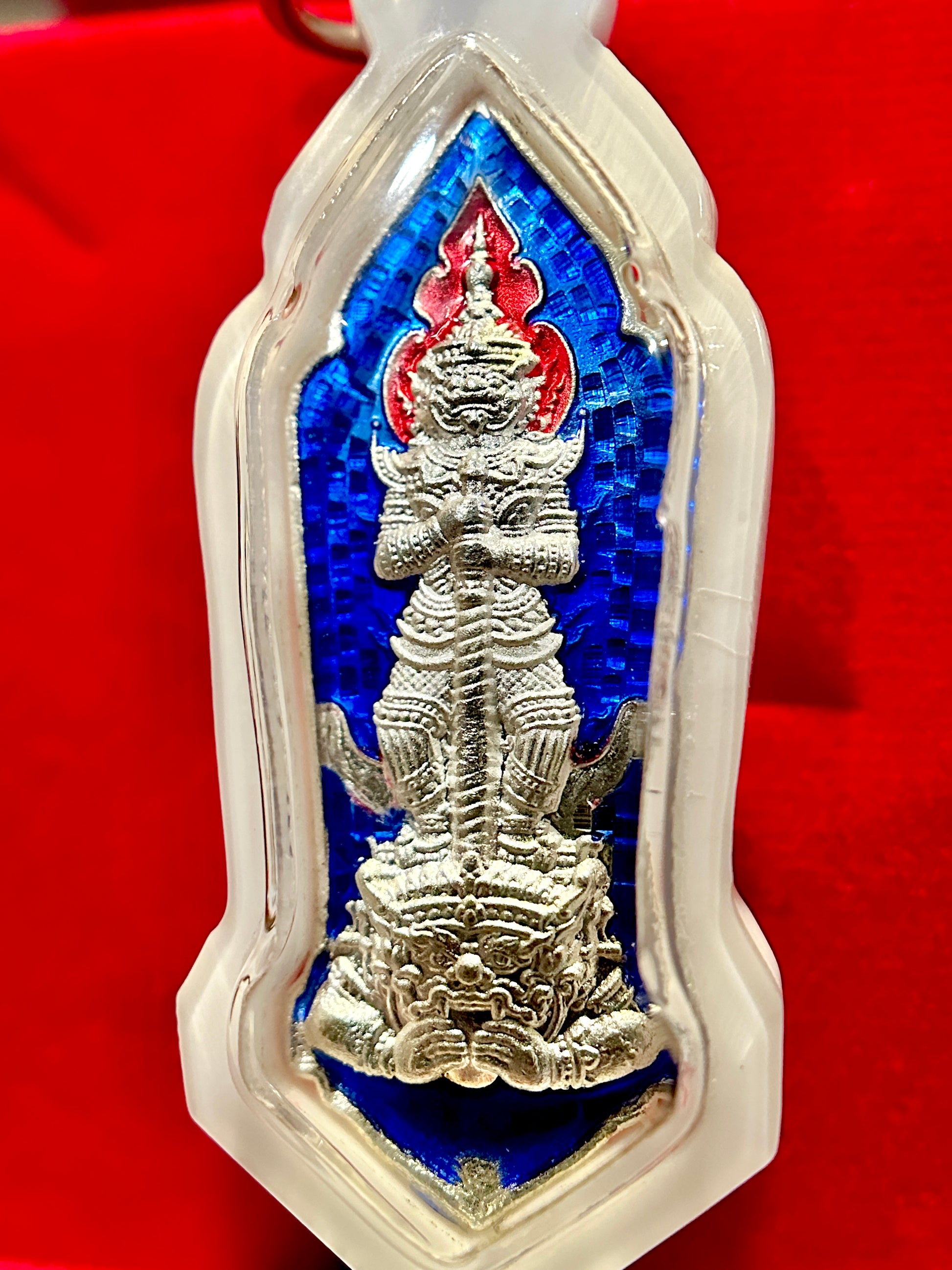 This striking amulet features Tao Wessuwan (Vaiśravaṇa), the mighty King of Giants and Guardian of Wealth, standing tall in radiant silver relief. Against a deep sapphire blue enamel backdrop with fiery red crown detail, his presence radiates strength, authority, and unwavering protection. Known as the vanquisher of evil spirits and guardian of the North, Tao Wessuwan is especially revered for shielding against misfortune, black magic, and negativity.