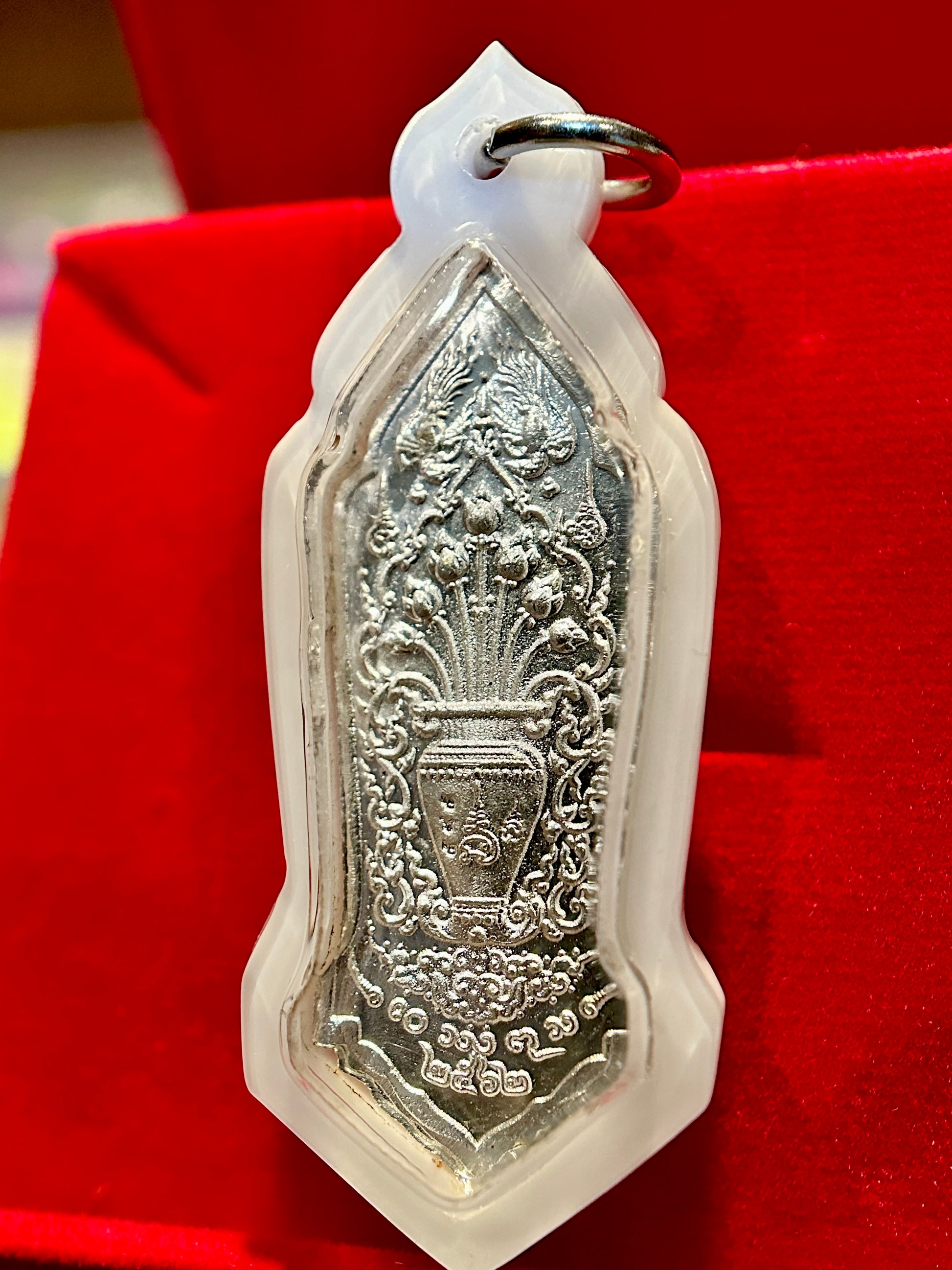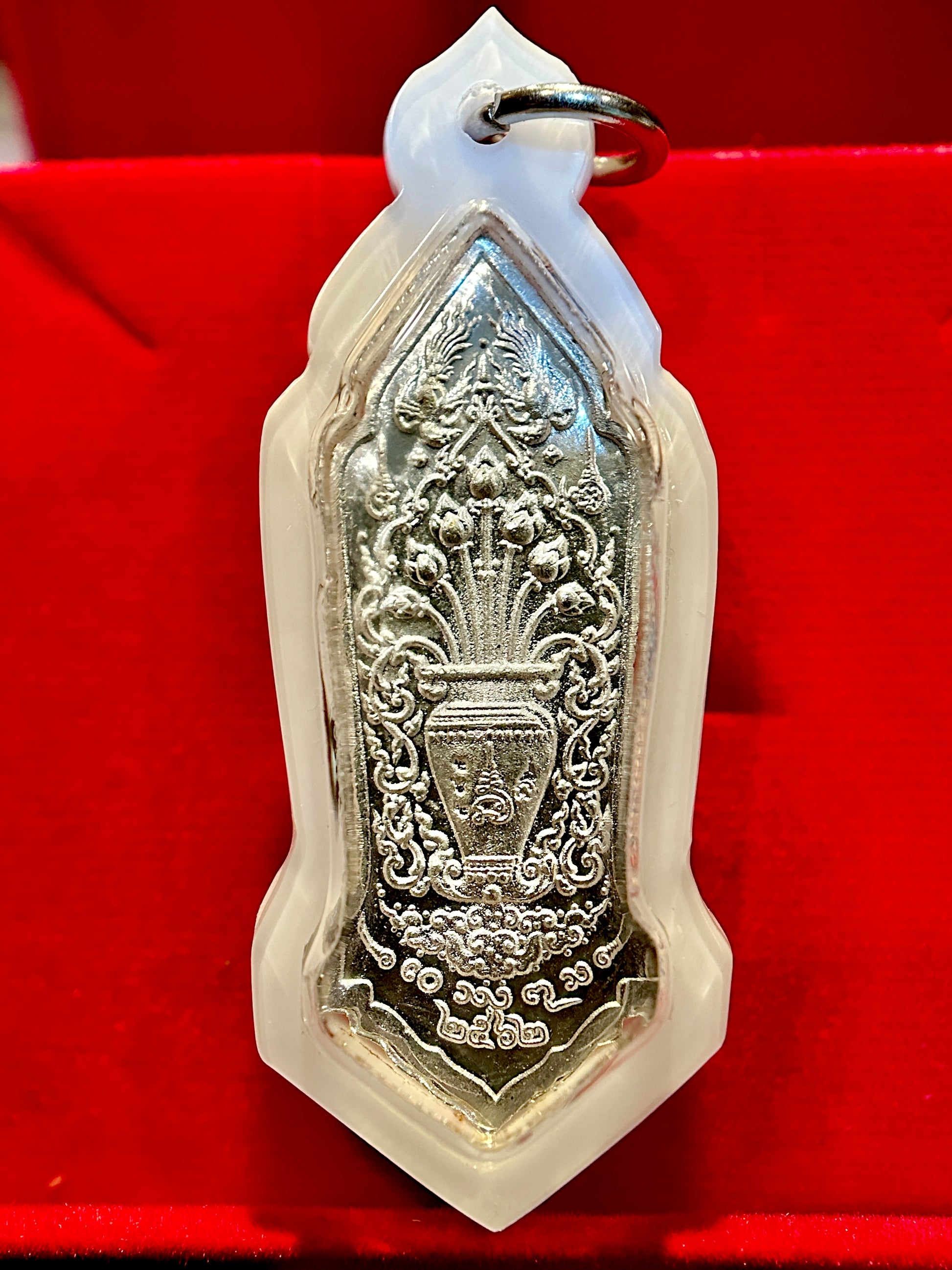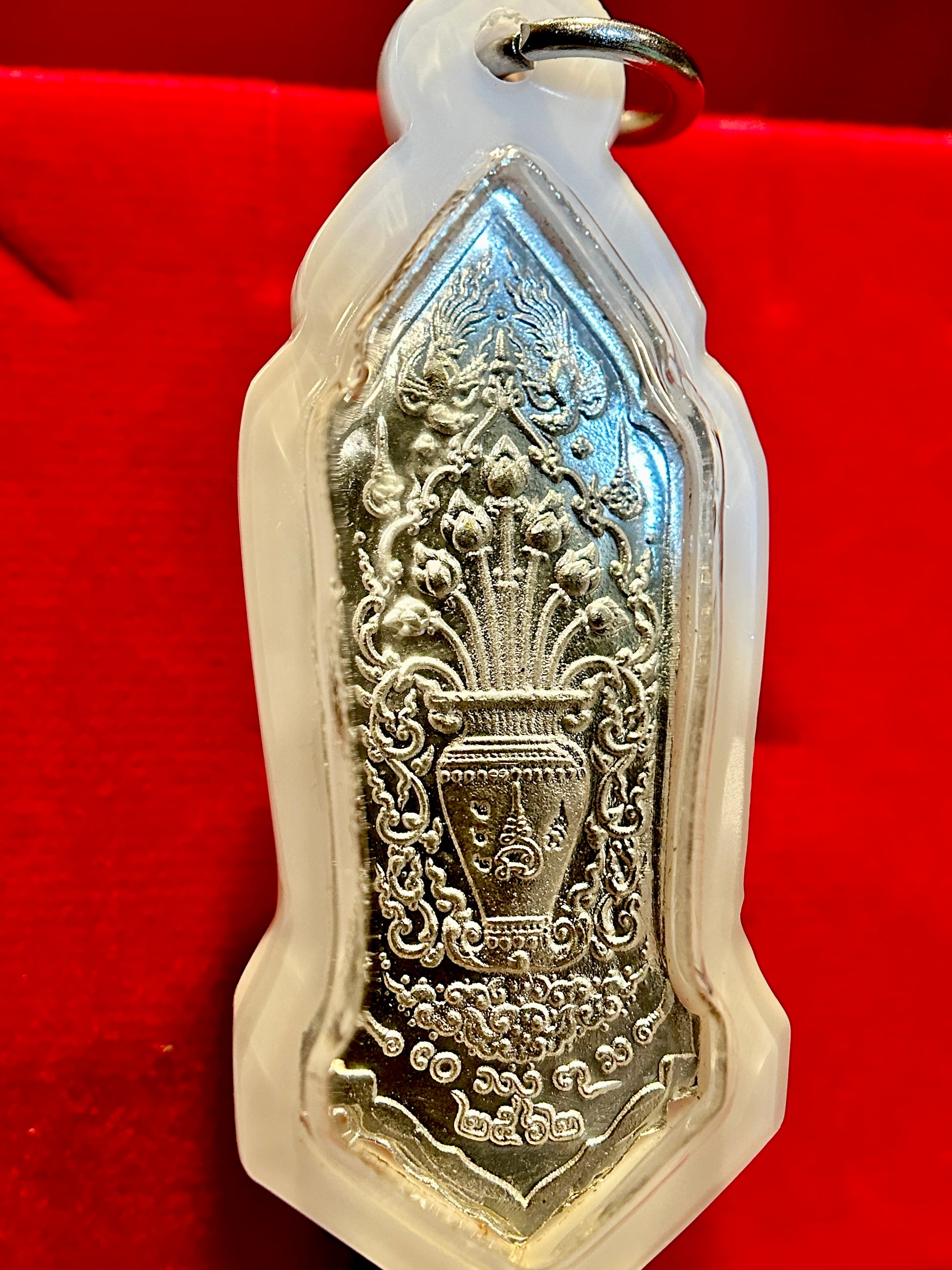 This striking amulet features Tao Wessuwan (Vaiśravaṇa), the mighty King of Giants and Guardian of Wealth, standing tall in radiant silver relief. Against a deep sapphire blue enamel backdrop with fiery red crown detail, his presence radiates strength, authority, and unwavering protection. Known as the vanquisher of evil spirits and guardian of the North, Tao Wessuwan is especially revered for shielding against misfortune, black magic, and negativity.