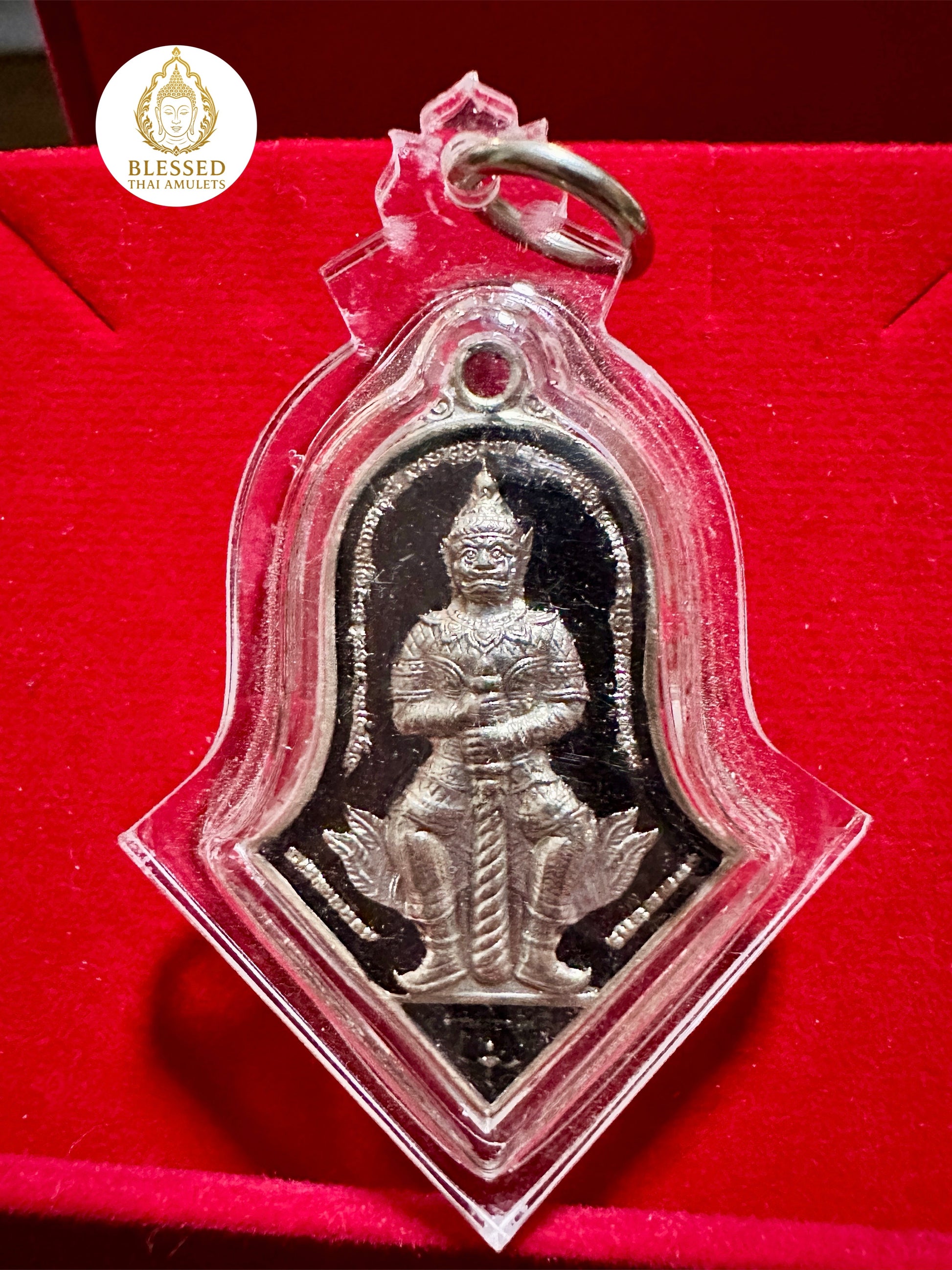 This amulet features a striking depiction of Tao Wessuwan, the fierce guardian of the northern direction and powerful protector against evil spirits and misfortune. Cast in silver-tone relief with a sharp black enamel backdrop, he stands gripping his staff with authority, surrounded by sacred yantras that amplify his strength and commanding presence.