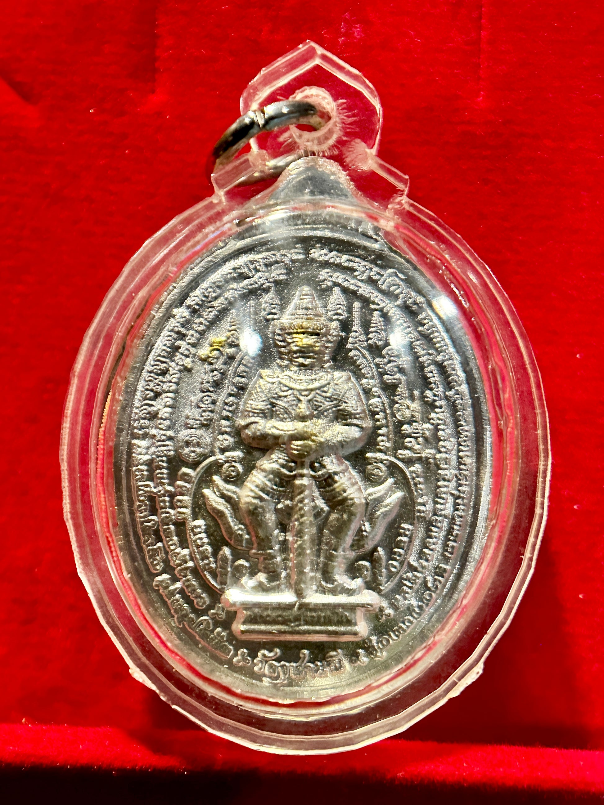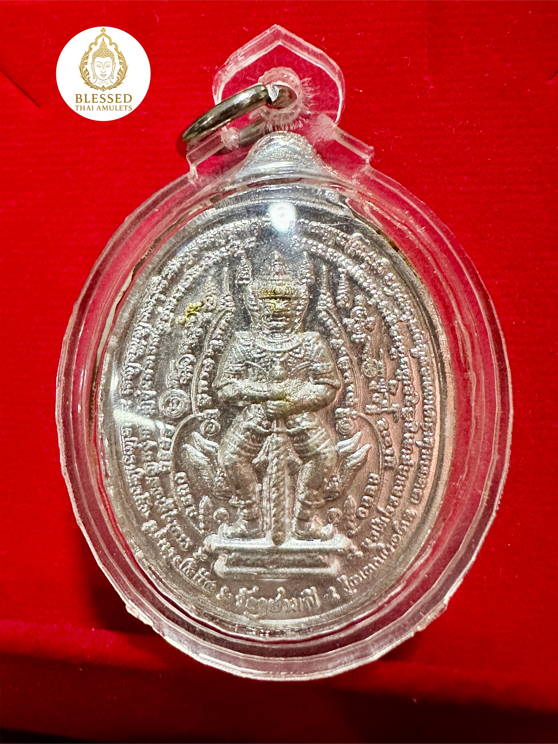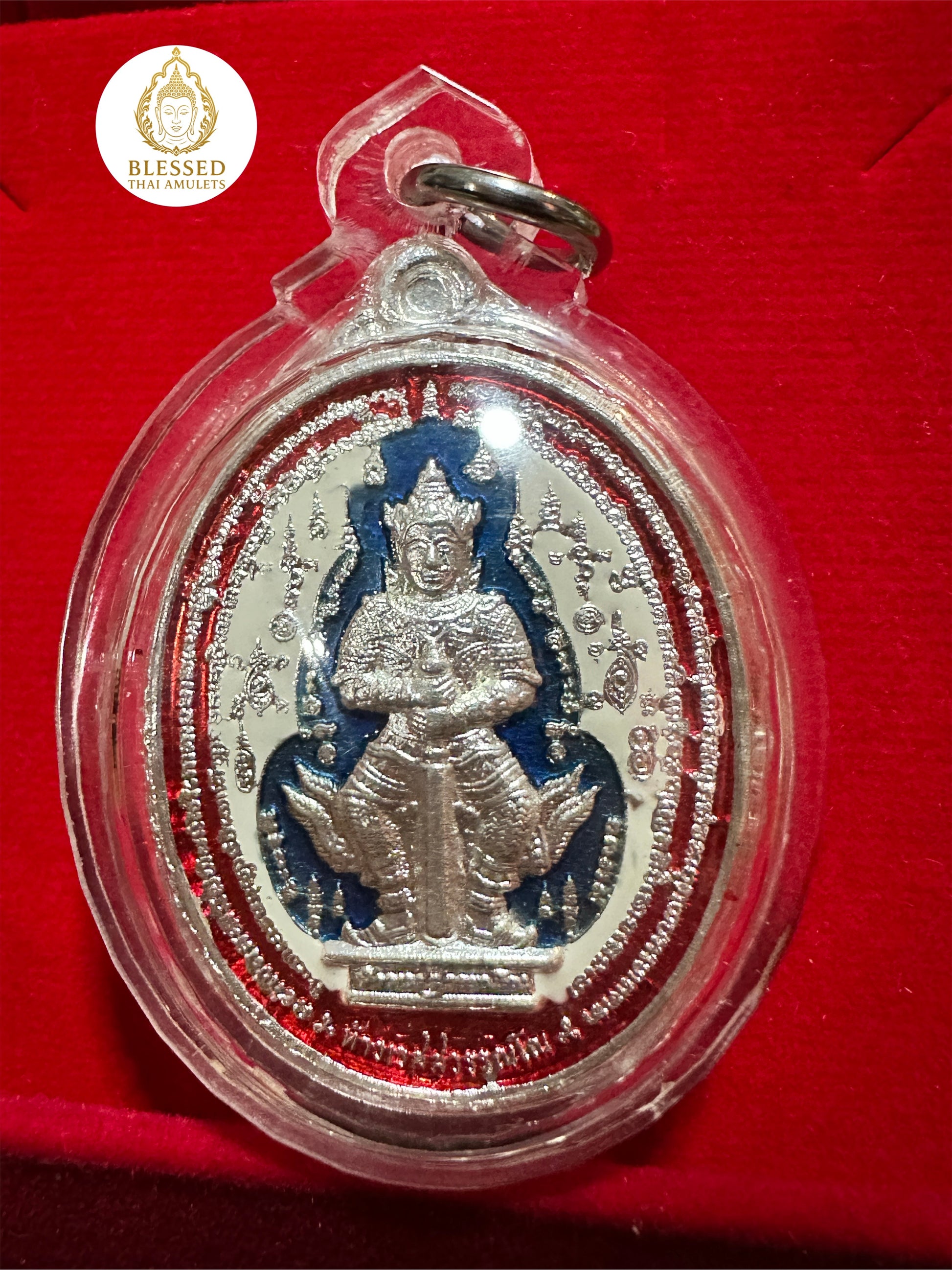 This powerful silver-finish Thai amulet showcases Tao Wessuwan (ท้าวเวสสุวรรณ), the guardian king of the North and vanquisher of evil spirits. Seated in regal form on both the front and back, each side features a unique design—one encircled by red and blue enamel detailing, the other inscribed with sacred protective yantras.