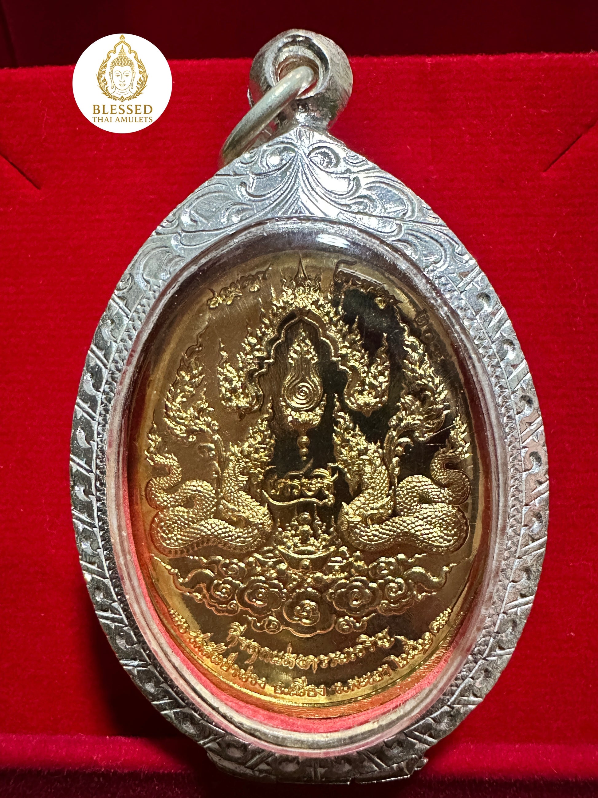 The reverse side of the amulet displays a sacred stupa motif guarded by twin Nagas, surrounded by detailed clouds and yantras—representing the presence of divine protection and spiritual ascension. This side enhances the amulet’s energy of stability, reverence, and connection to higher realms.