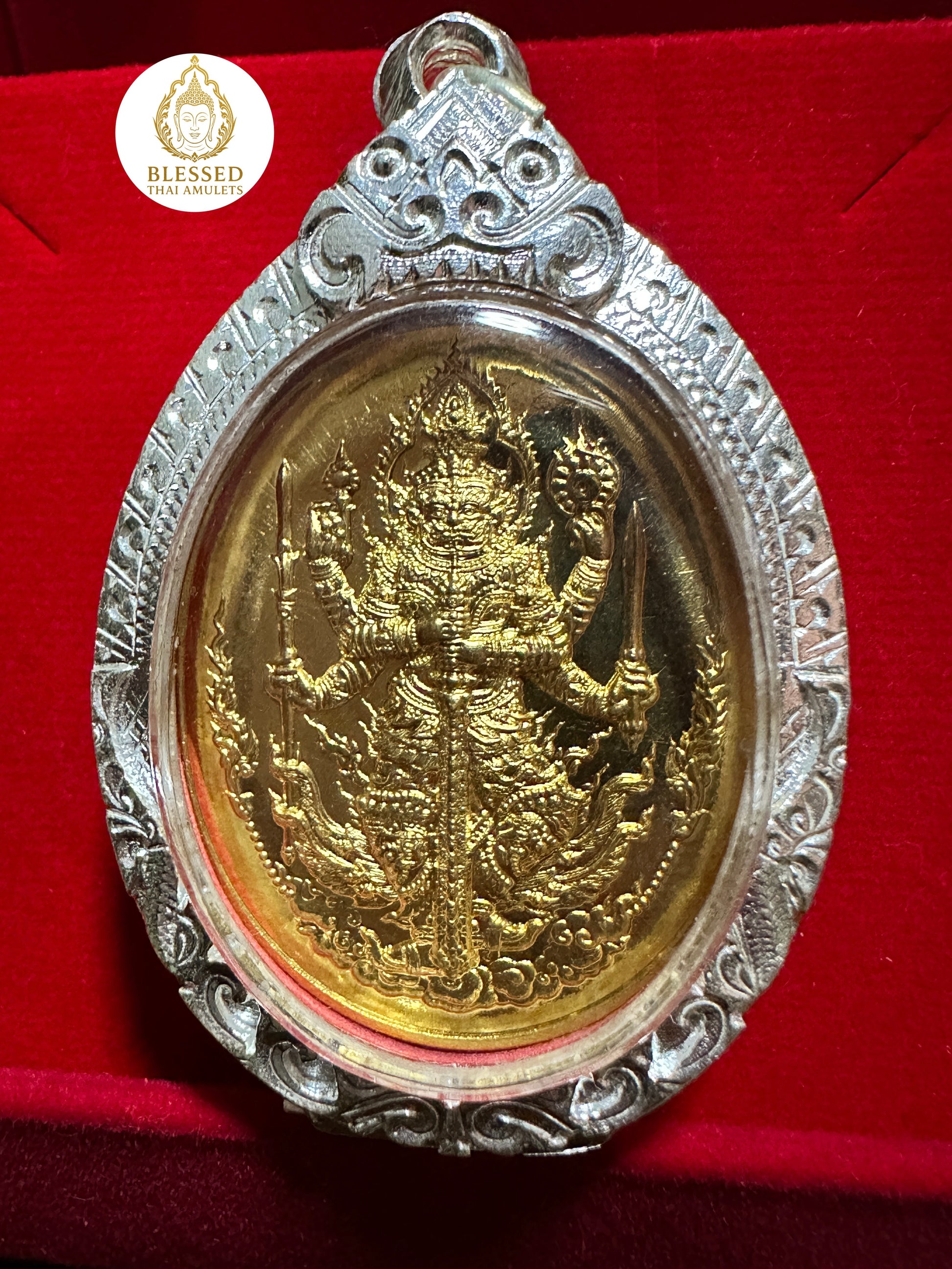 Standing above twin Nagas, Tao Wessuwan’s golden form radiates strength and cosmic authority. The intricate detail and symmetry in this piece reflect not only craftsmanship but a deep spiritual resonance with the energies of protection, discipline, and fearless leadership.