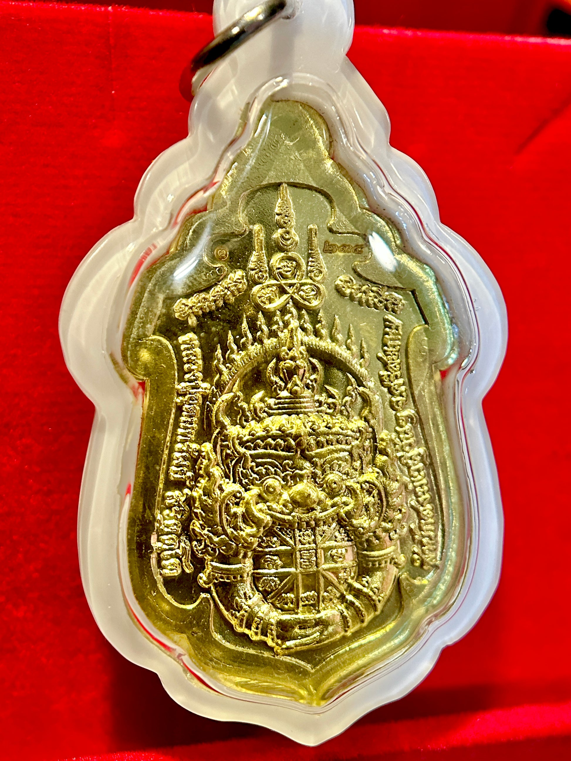 This version shines with a brilliant white enamel backdrop accented by red and blue highlights, framing the golden form of Tao Wessuwan, the King of Giants and Guardian of Wealth. The front radiates purity and divine protection, while the reverse features Rahu, the celestial devourer, etched in gold for protection against misfortune. Encased in a clear white-edged case, this piece stands out for its radiant, flame-like brilliance.