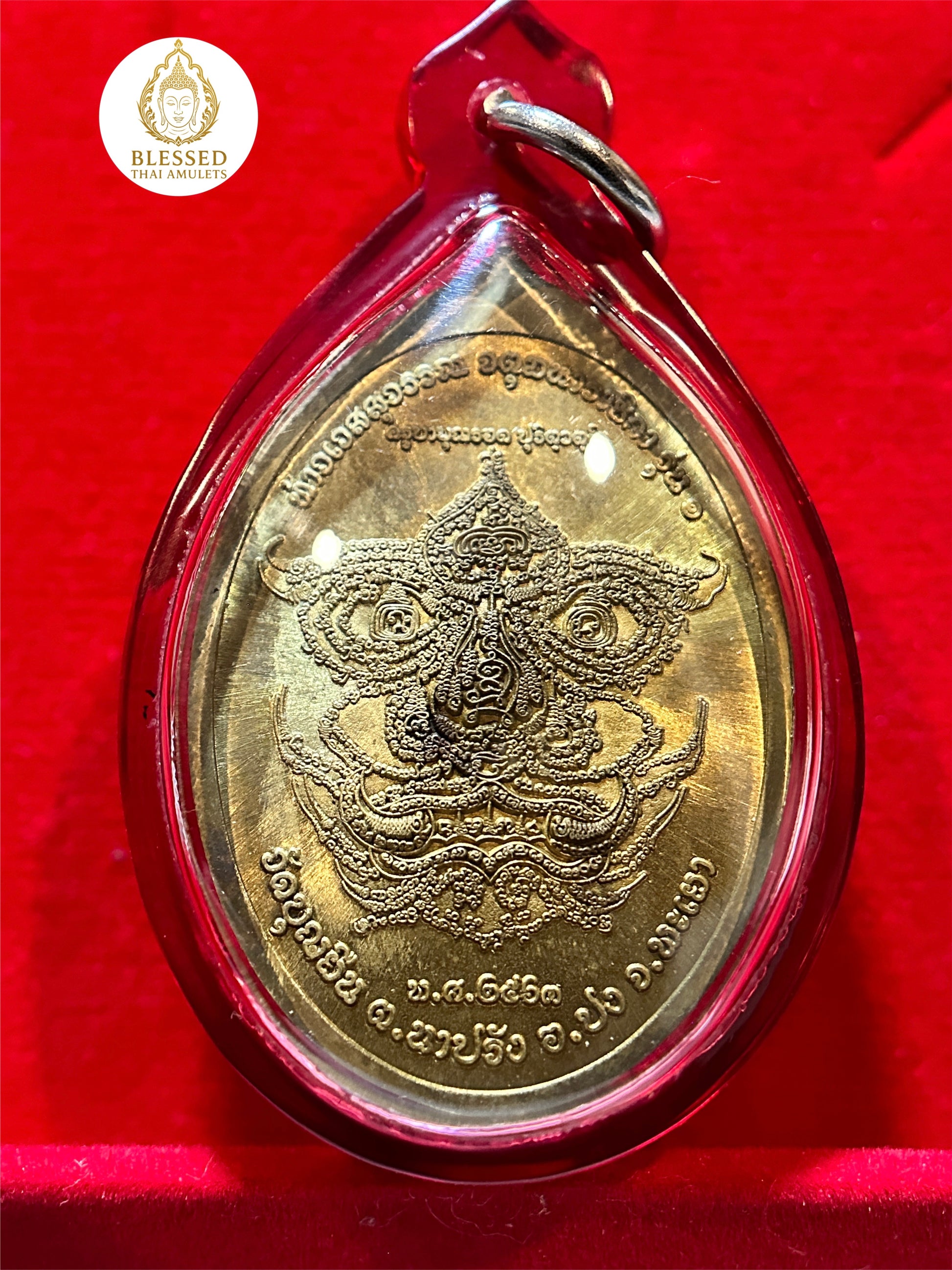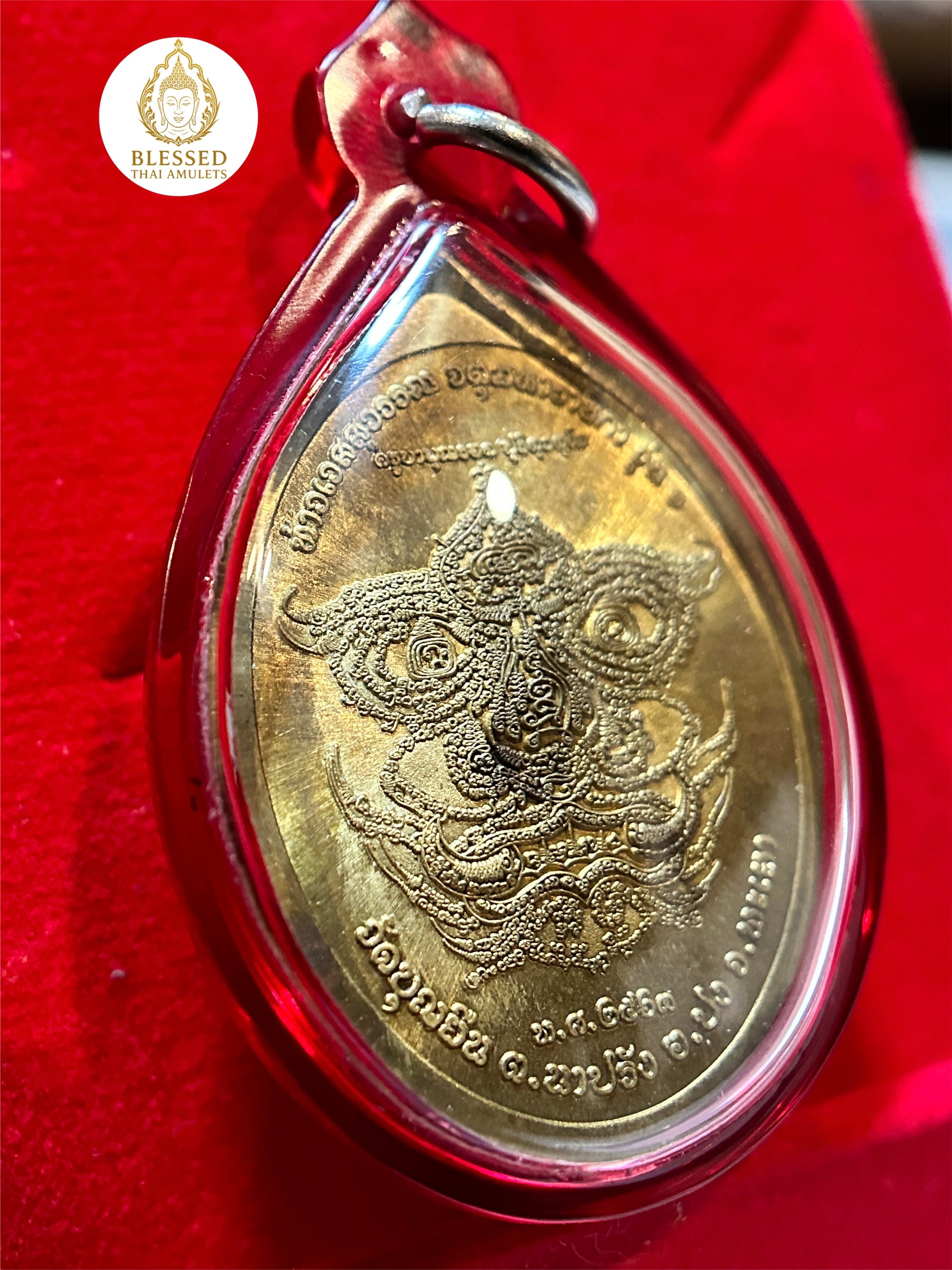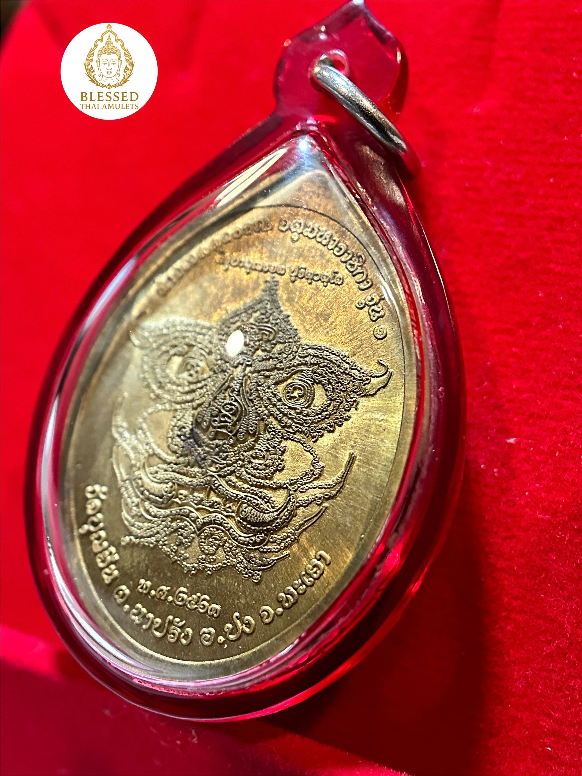 The reverse side displays a sacred mantra configuration shaped in the likeness of a Yaksha’s face—an intricate design that merges visual symbolism with ancient protective chants, intensifying the amulet’s spiritual potency.