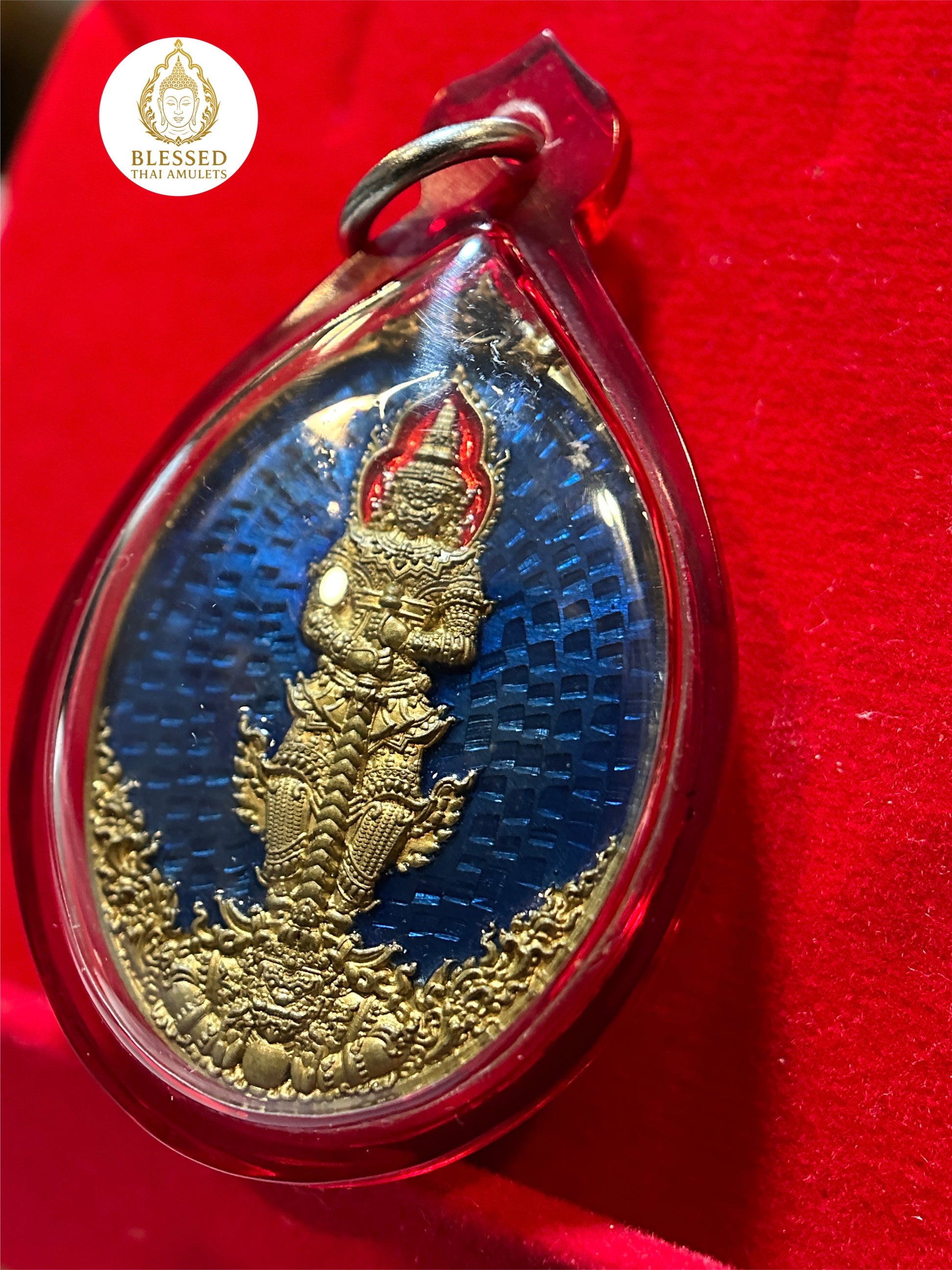 This striking red-and-gold amulet features Tao Wessuwan, the powerful guardian of the north and vanquisher of evil spirits. Standing atop a mythological base, Tao Wessuwan is rendered in gold detail with a vibrant red crown and deep blue textured backdrop—symbolizing protection, authority, and spiritual defense.