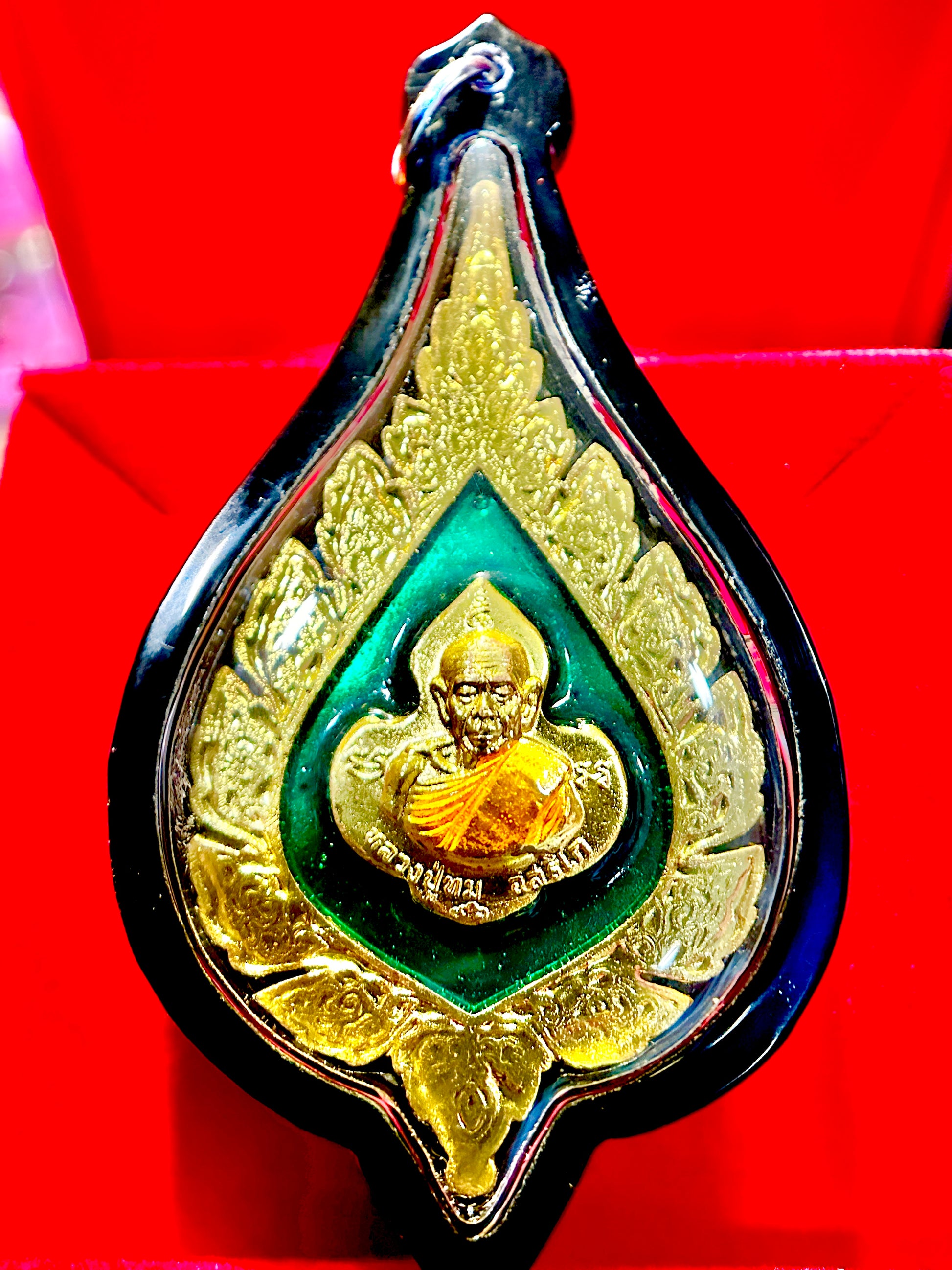 From Blessed Thai Amulets, this striking teardrop-shaped amulet features a highly revered Thai monk, cast in radiant gold relief. Symbolizing spiritual guidance, inner peace, and sacred protection — making the amulet a powerful charm for everyday strength and spiritual grounding.