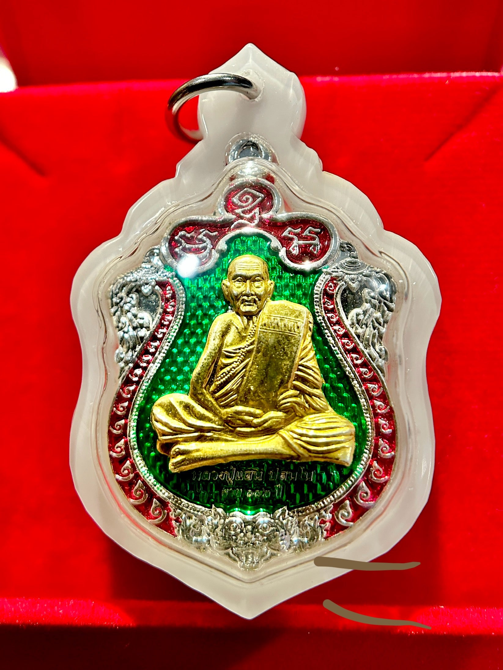This sacred shield-shaped amulet from Blessed Thai Amulets features a highly revered Thai monk, seated in meditation and holding a sacred text. His calm posture and golden form reflect spiritual wisdom, inner peace, and the transmission of blessings. The backdrop is a vibrant emerald green enamel, framed in red and silver, symbolizing growth, vitality, and divine presence.