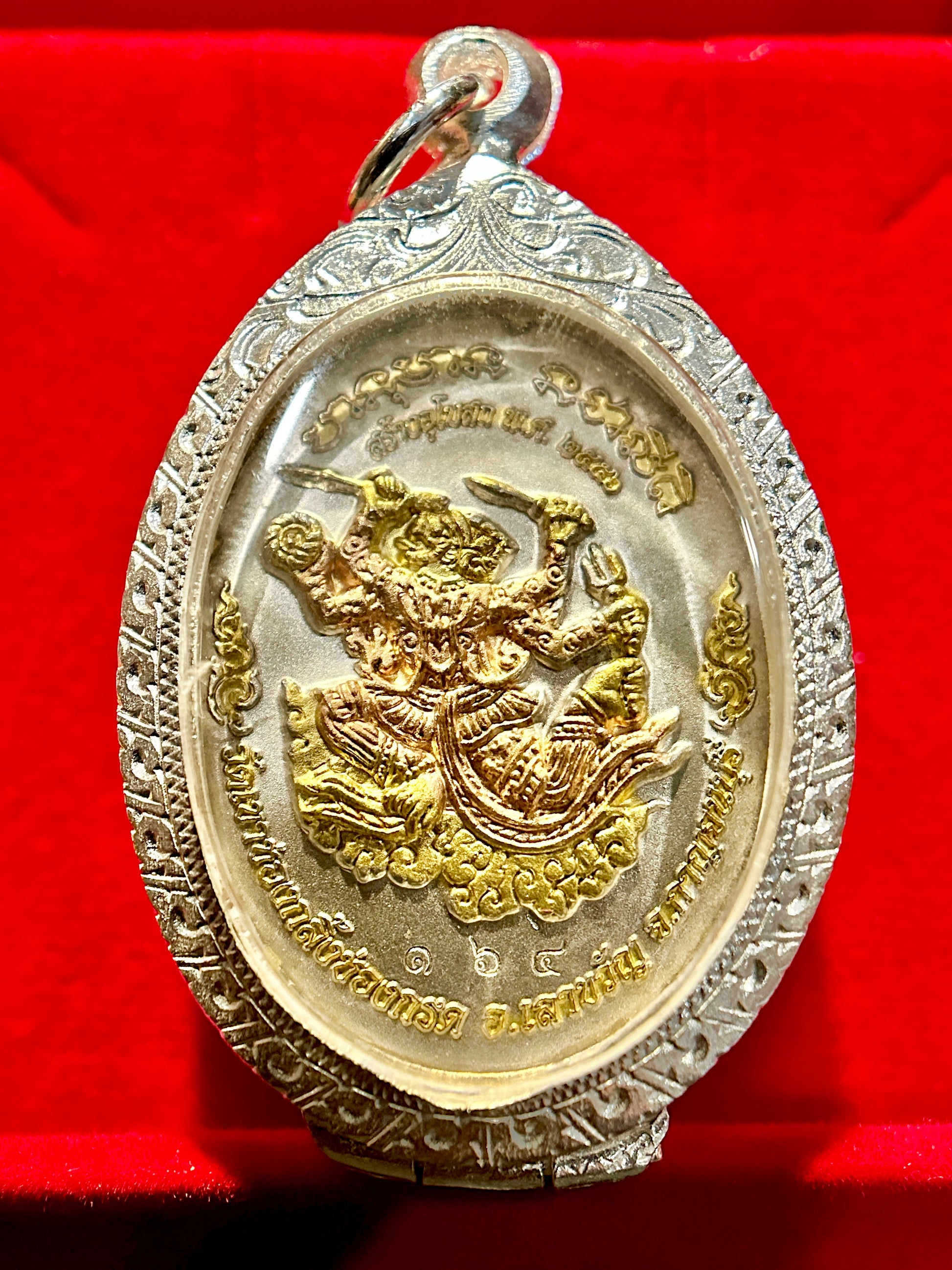 This dual-sided amulet combines the protective power of Thao Wirunhok, one of the Four Heavenly Kings, with the courage and victory energy of Hanuman.