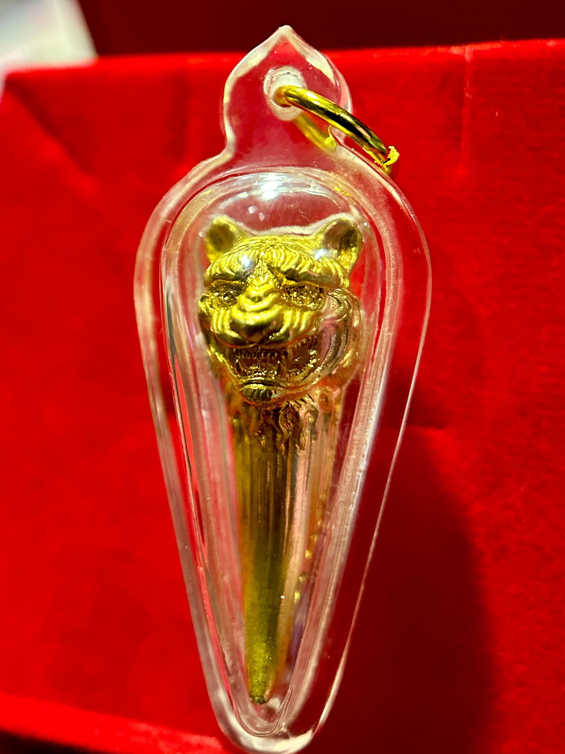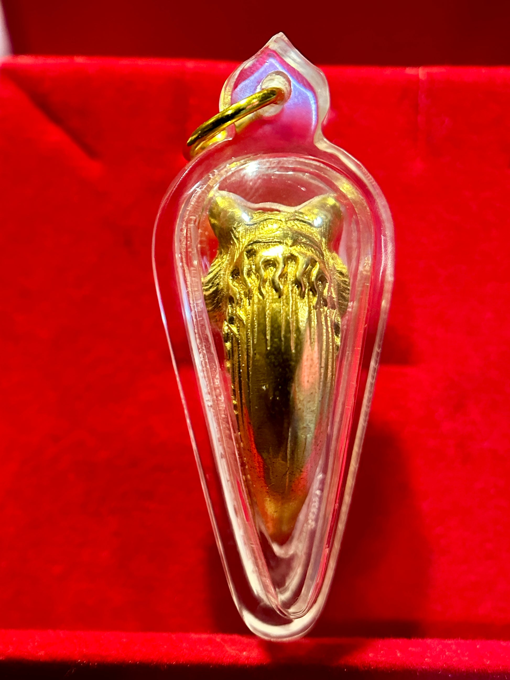 This amulet features a stylized tiger head emerging from the top of an elongated fang-shaped form, rendered in a rich gold finish and sealed within a clear protective casing. The design draws directly from traditional Thai tiger symbolism, where the tiger is revered as the embodiment of raw power, courage, dominance, and fearlessness.