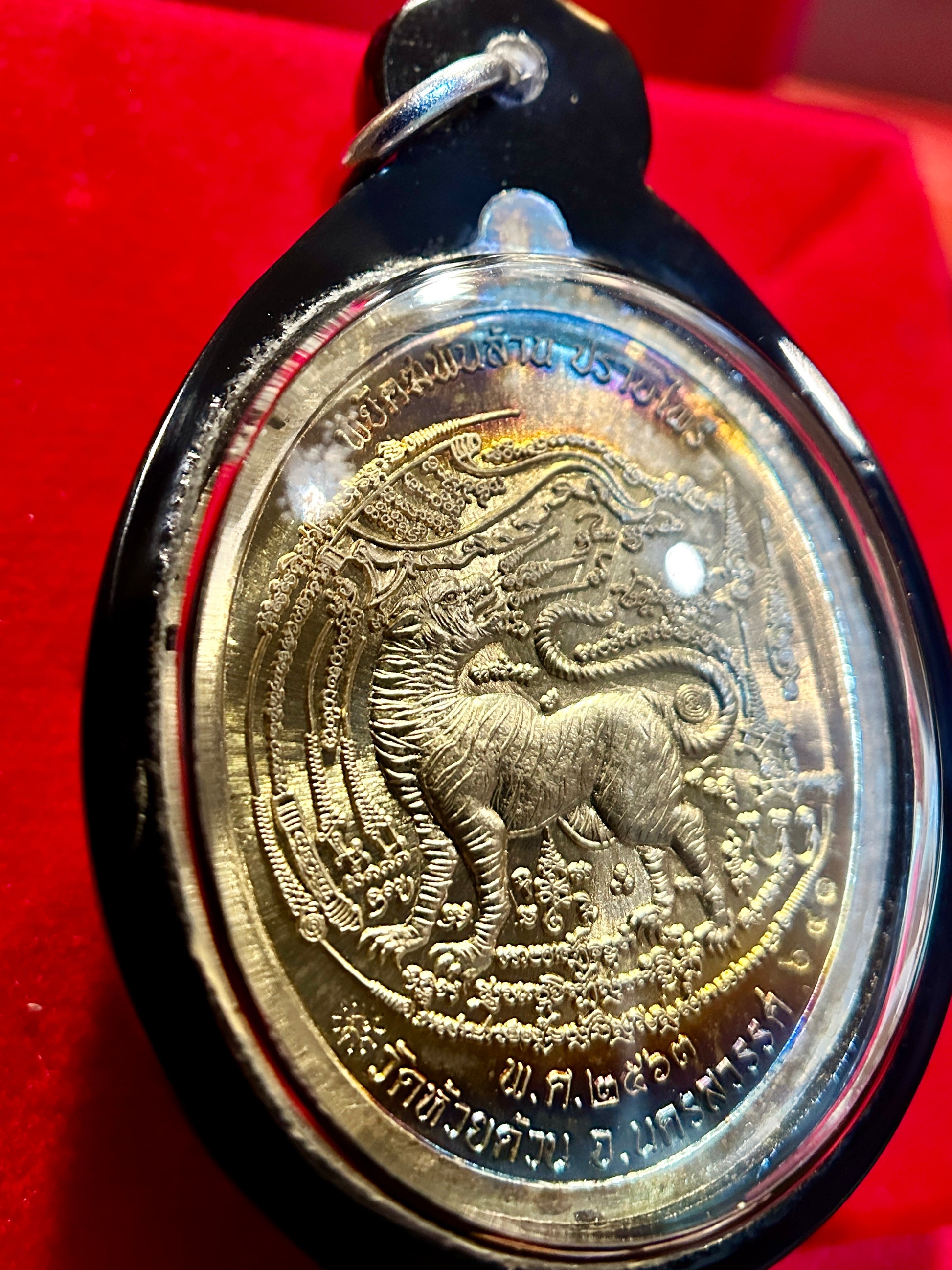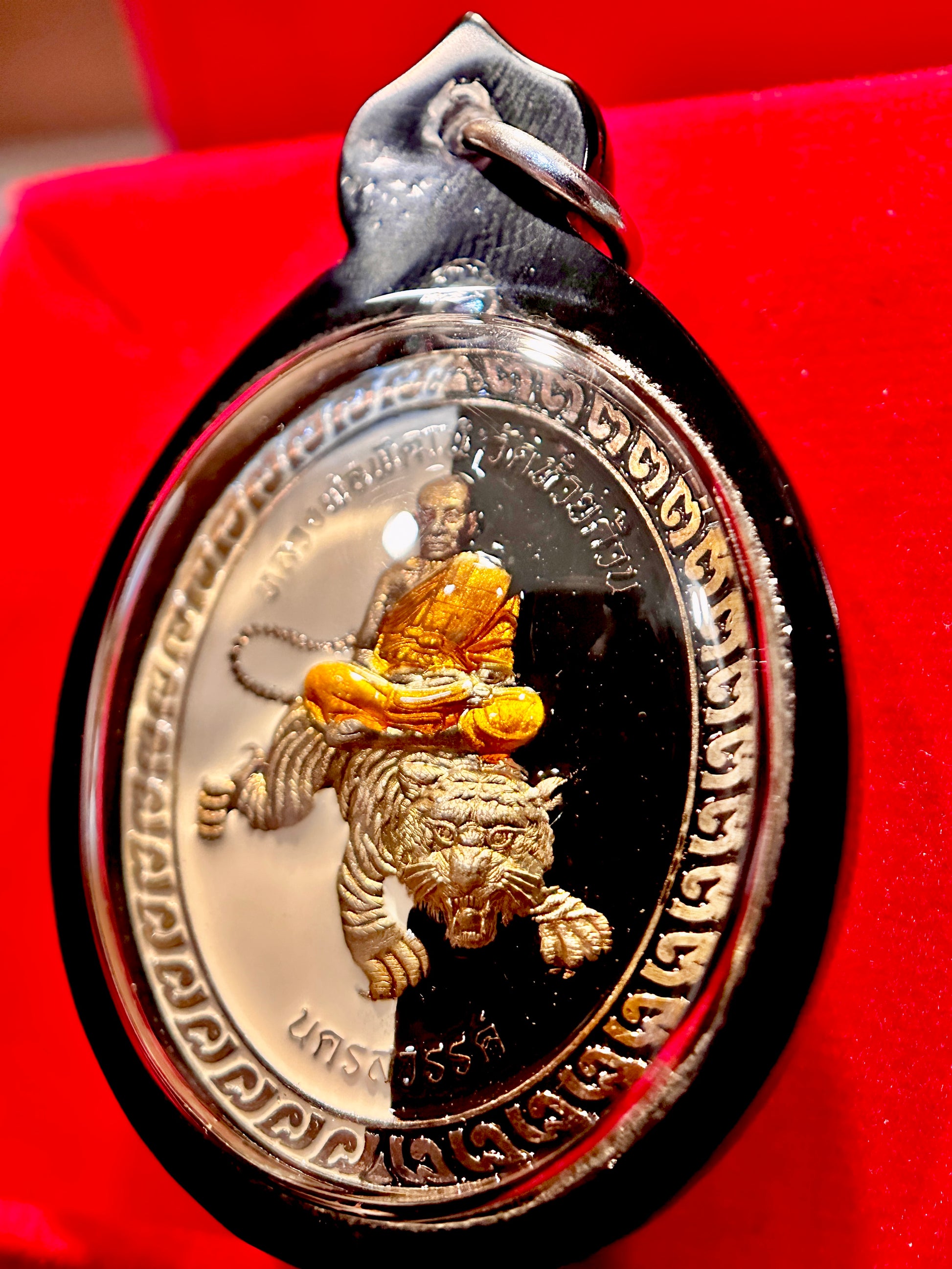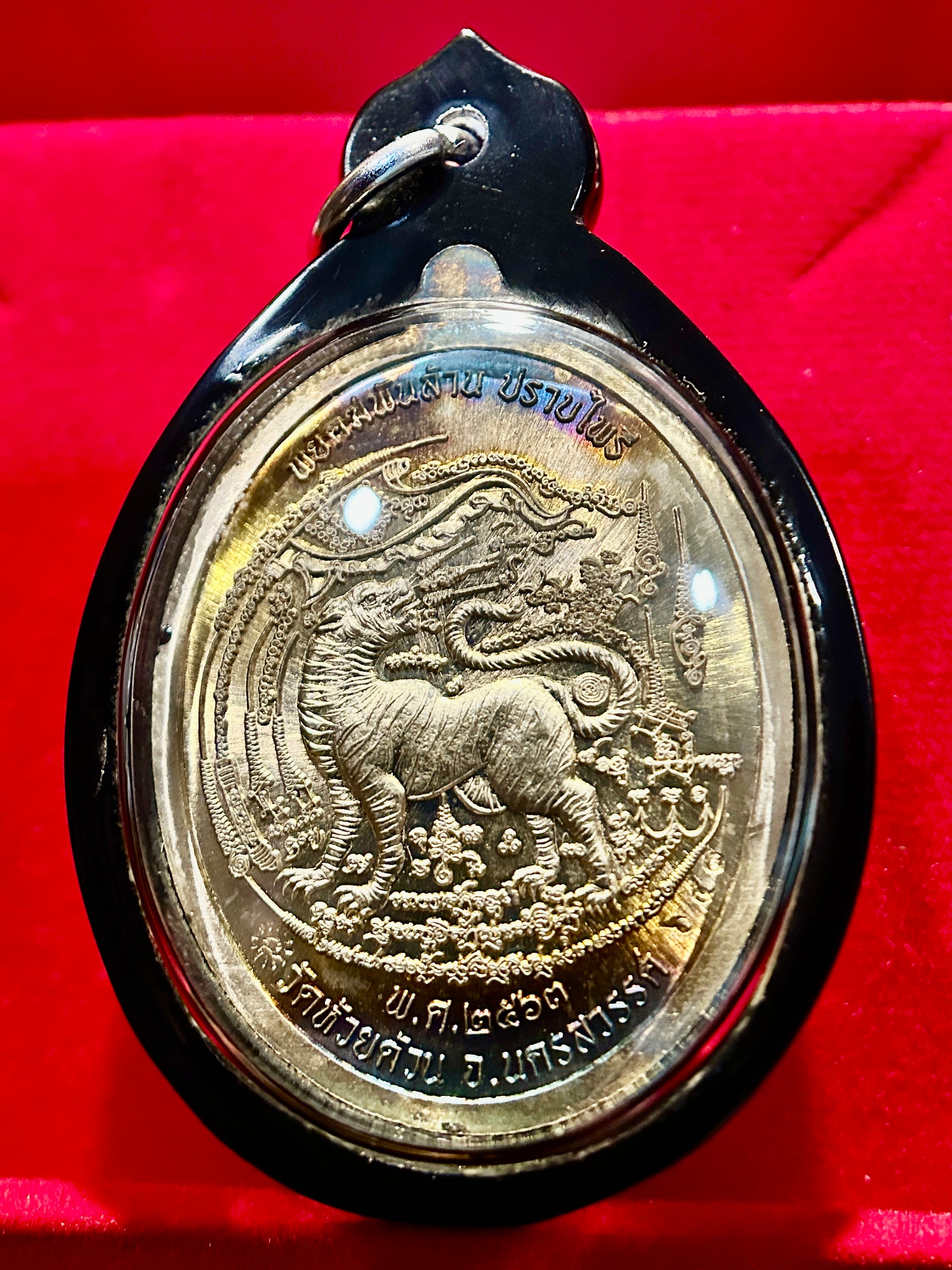 This distinctive amulet features Luang Phor Phat of Wat Huai Duan seated atop a fierce tiger, but with a rare and symbolic twist — the front is divided into two contrasting halves, white and black. This dual-tone design represents the harmony of opposing forces: light and darkness, mercy and might, spiritual purity and worldly power. It embodies the belief that true strength comes from mastering both sides of life’s path.