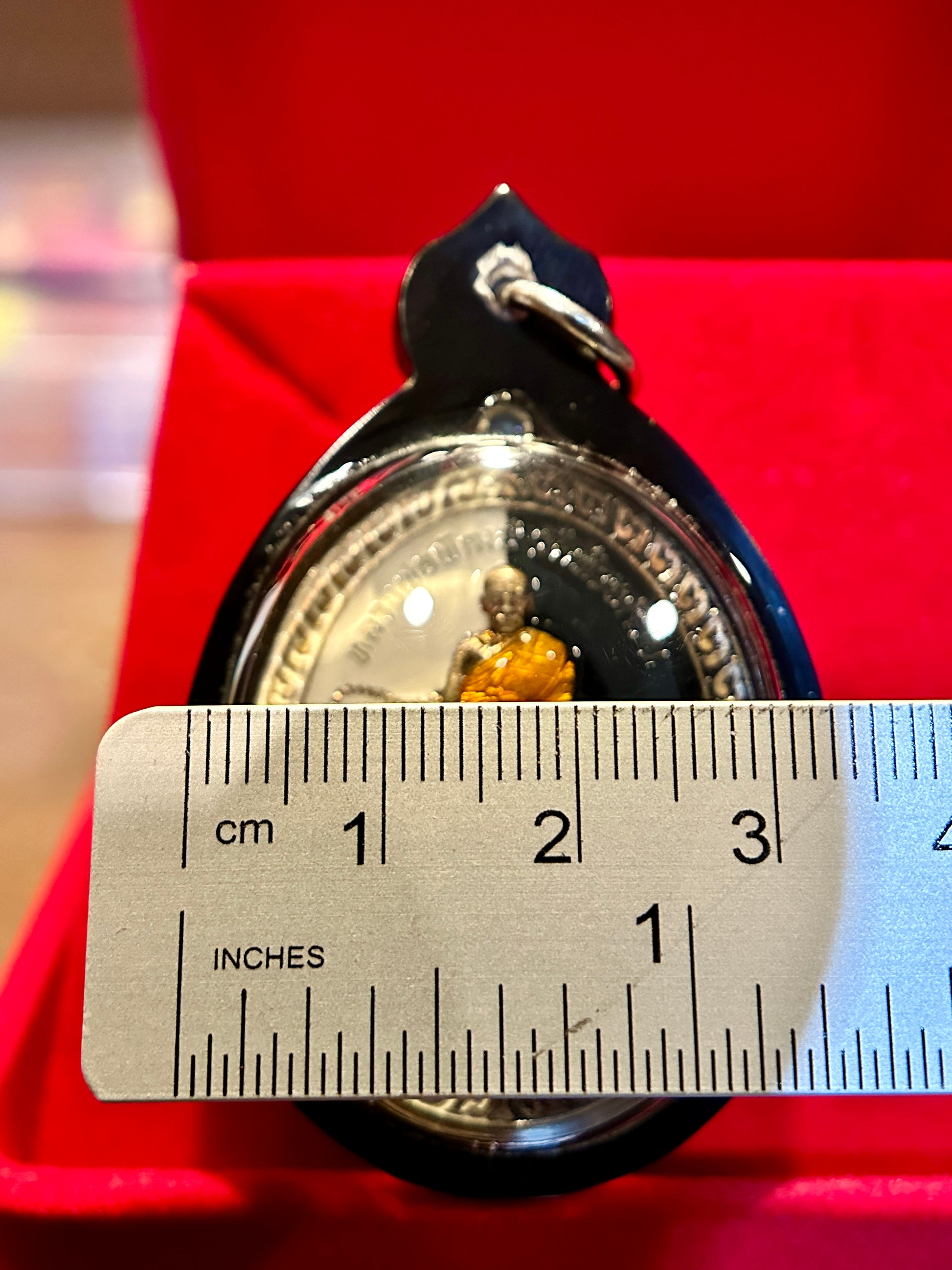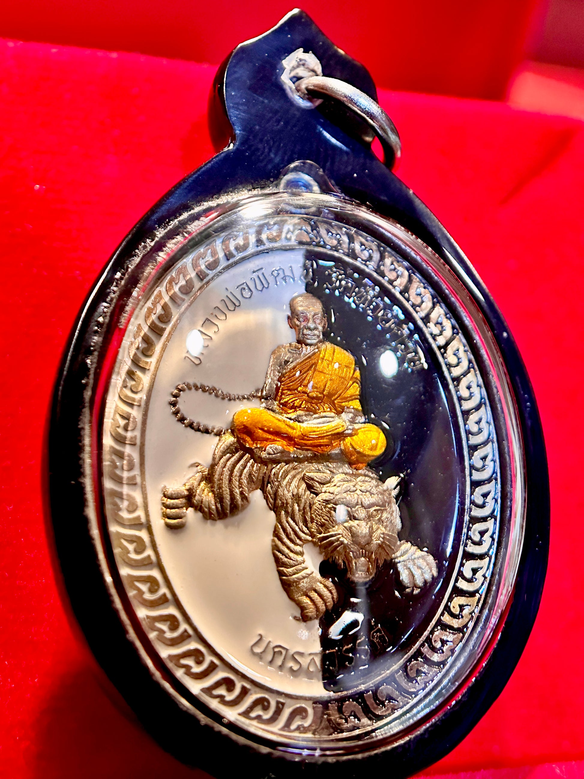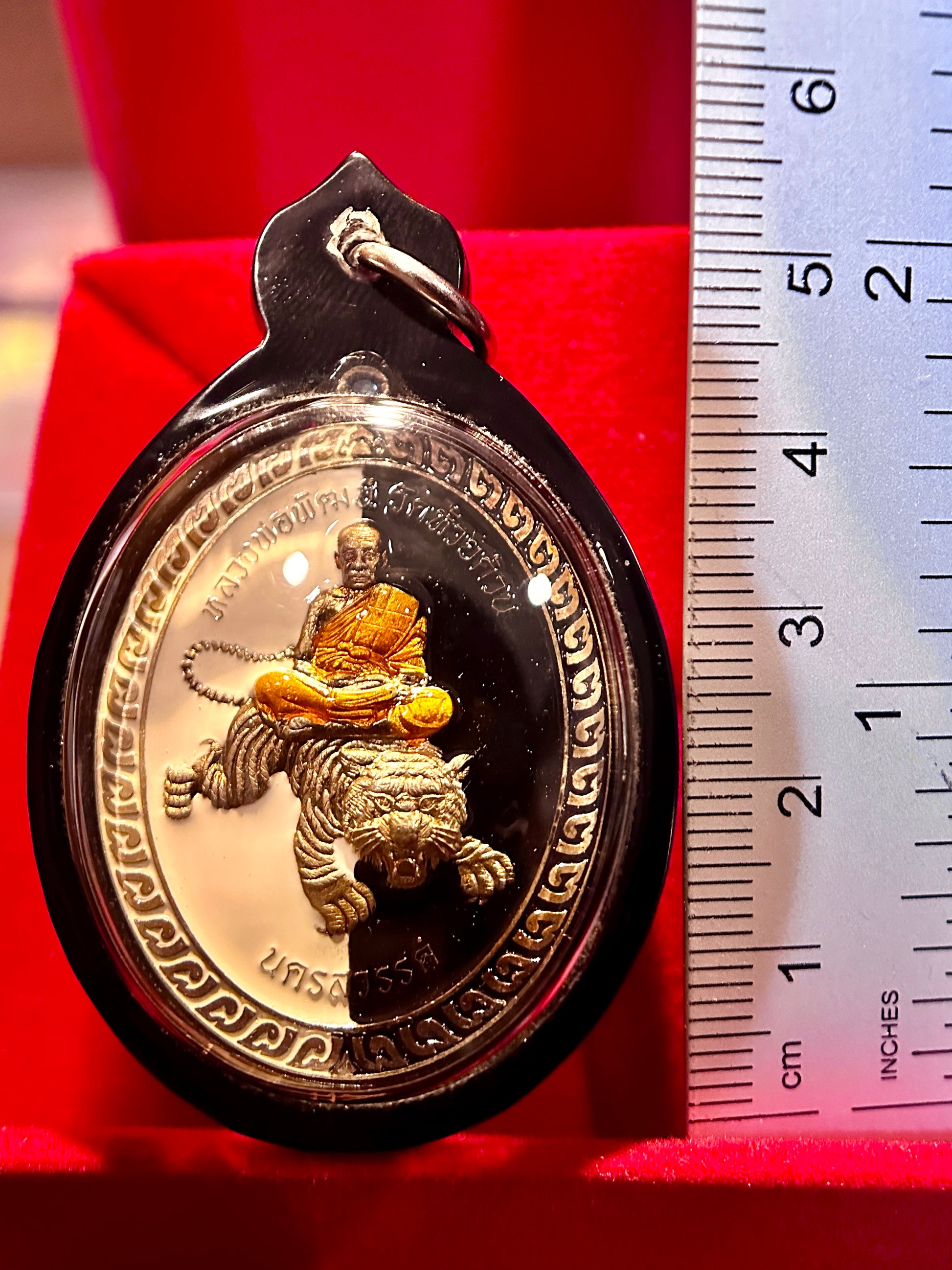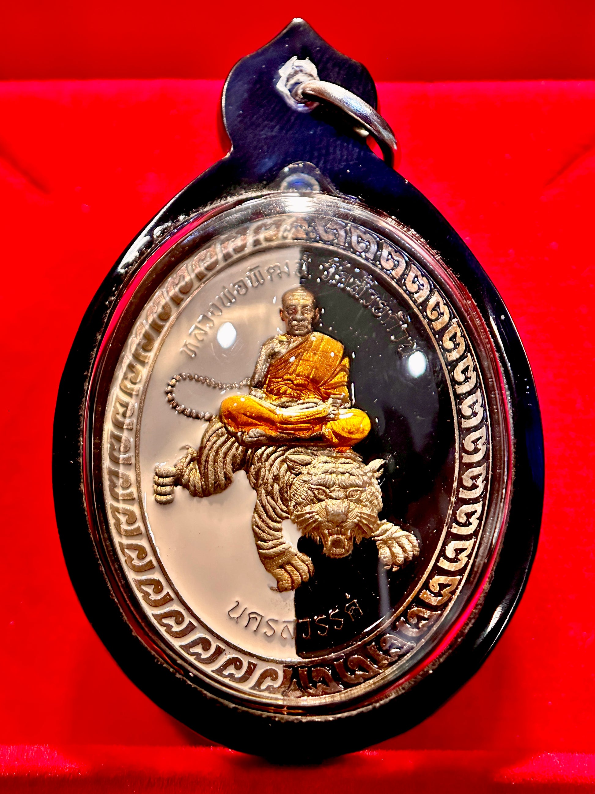 This distinctive amulet features Luang Phor Phat of Wat Huai Duan seated atop a fierce tiger, but with a rare and symbolic twist — the front is divided into two contrasting halves, white and black. This dual-tone design represents the harmony of opposing forces: light and darkness, mercy and might, spiritual purity and worldly power. It embodies the belief that true strength comes from mastering both sides of life’s path.