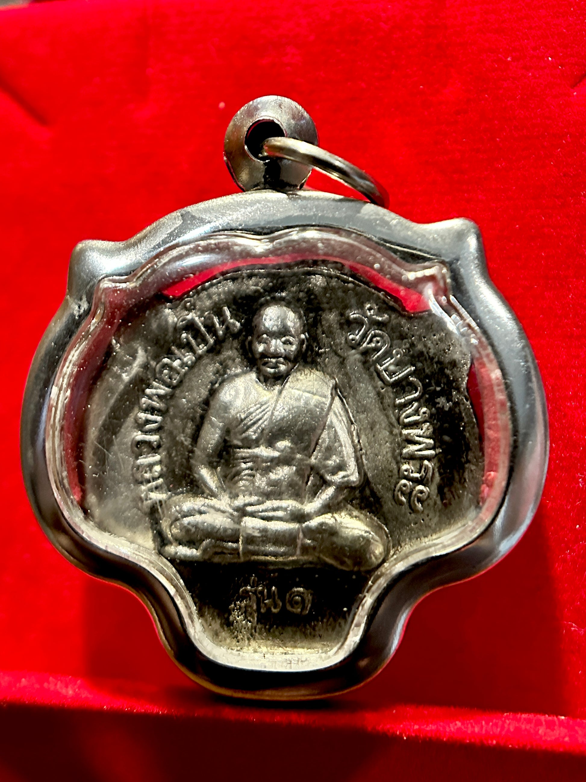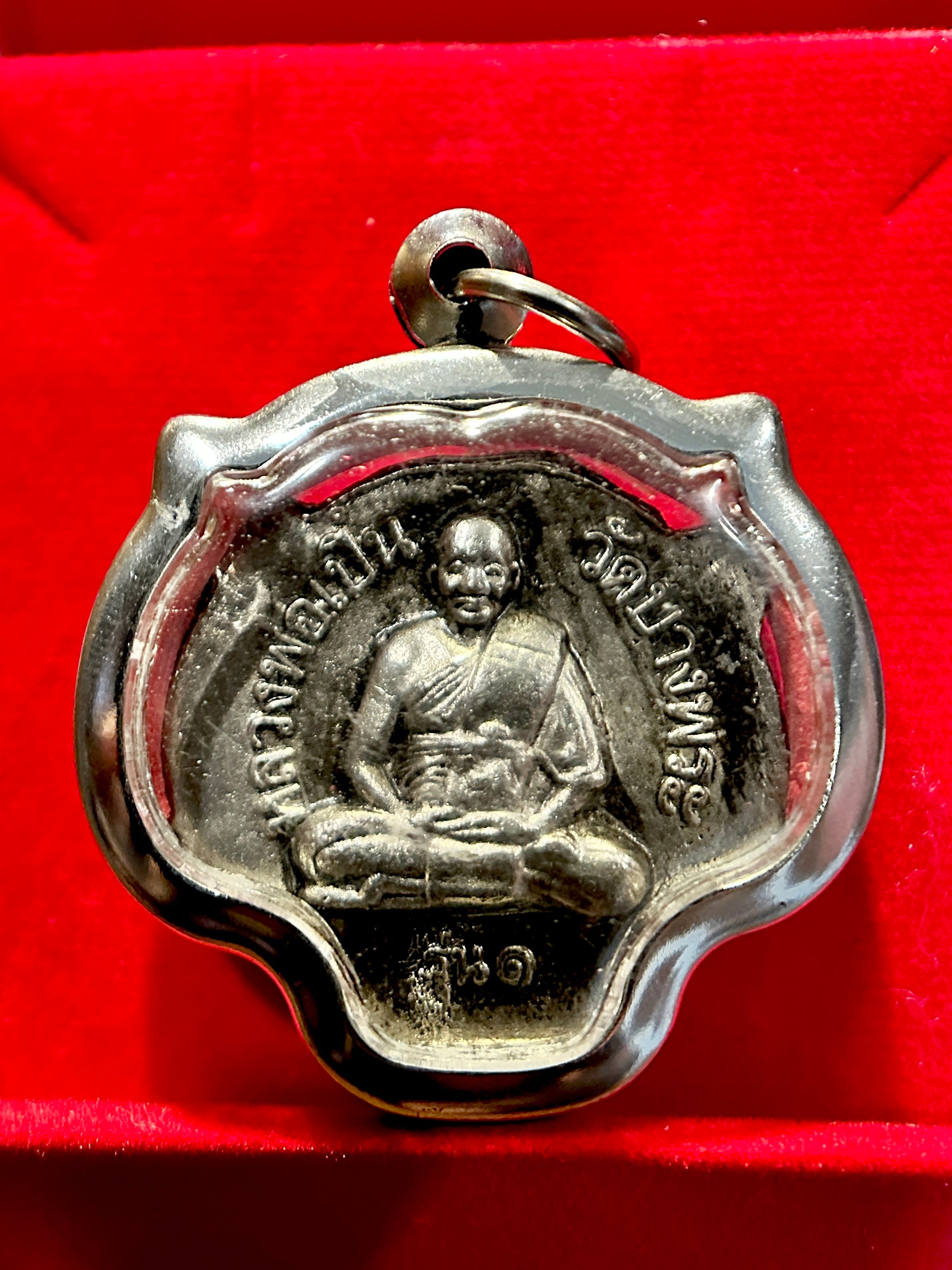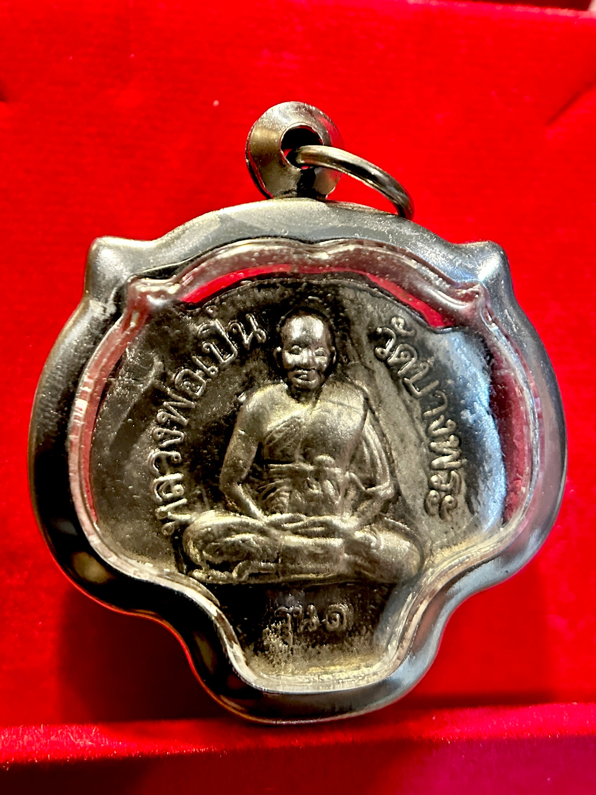 The reverse shows a highly respected monk in meditation posture, surrounded by protective inscriptions. This side enhances the amulet’s sacred charge—offering blessings for safety, peace of mind, and spiritual growth. The inscription likely credits the temple or lineage, grounding the piece in Thai Buddhist tradition.