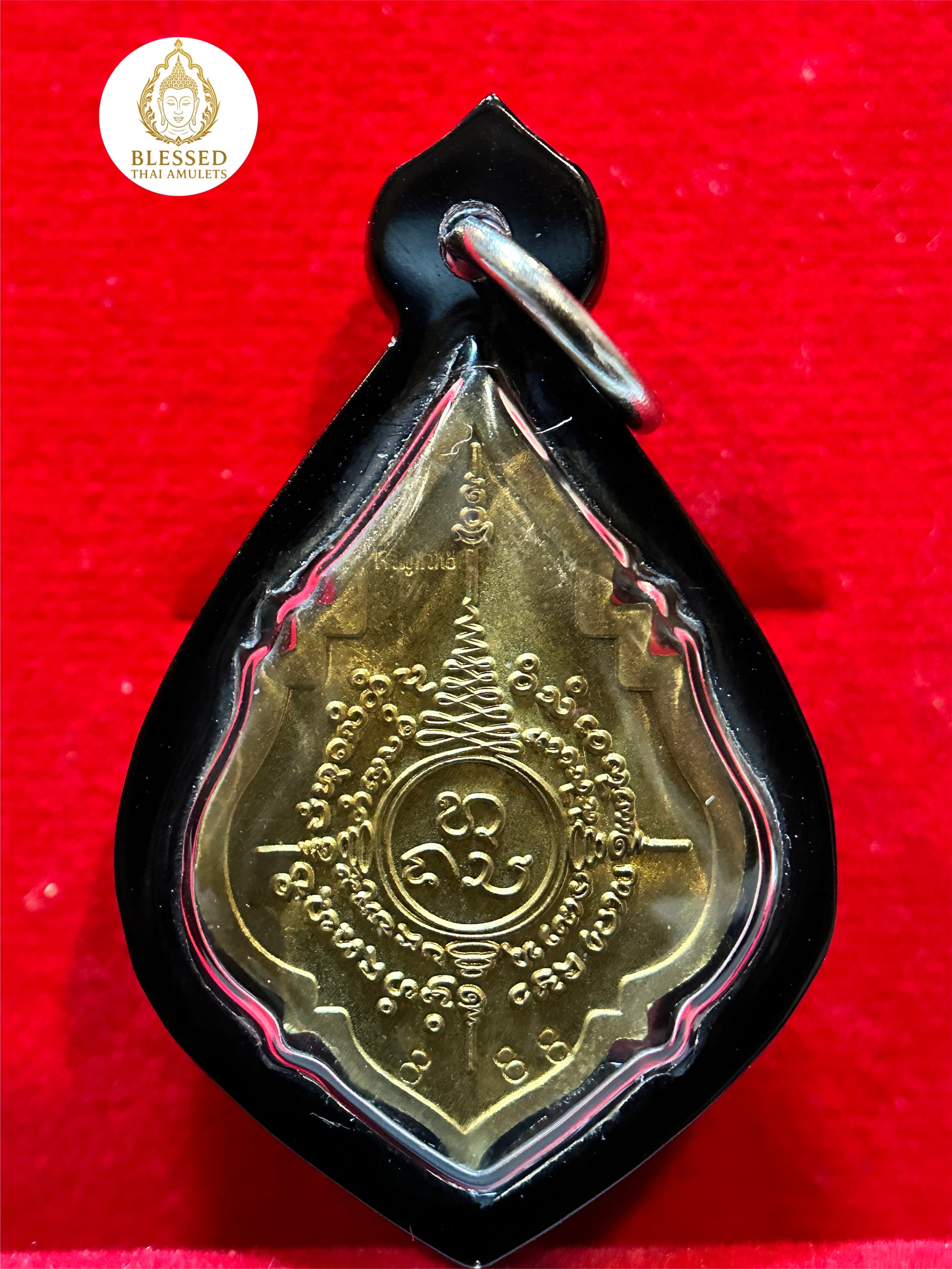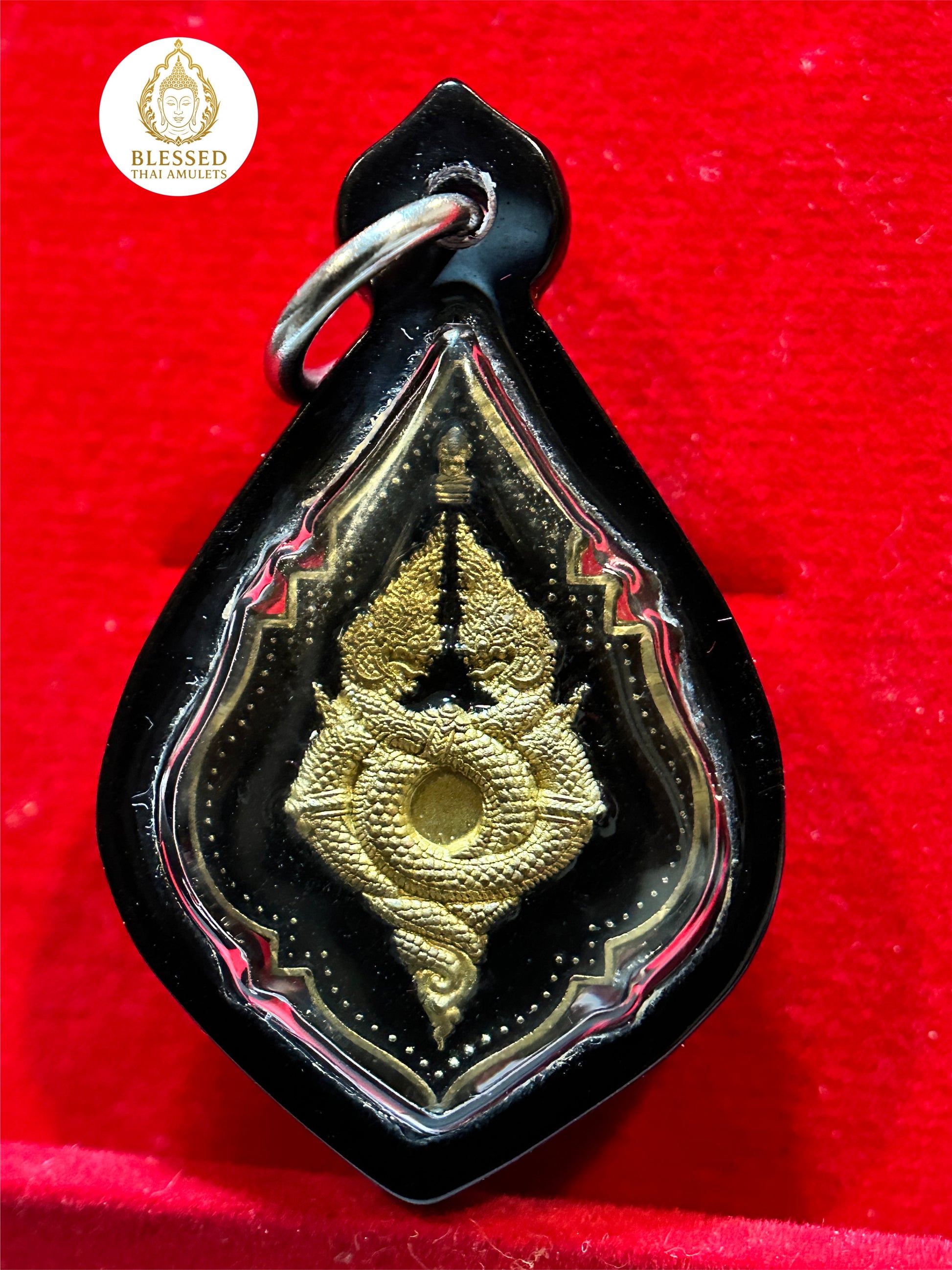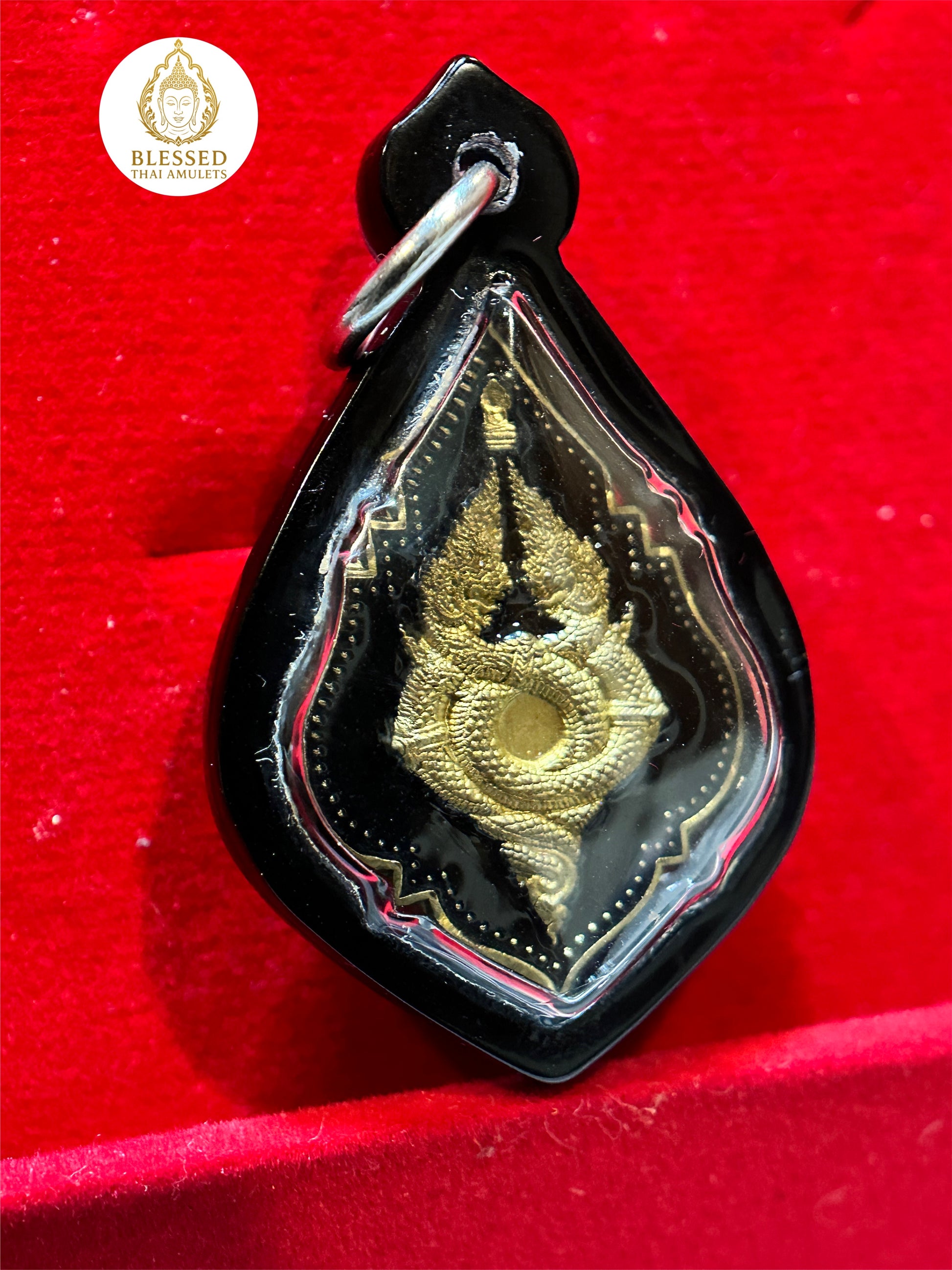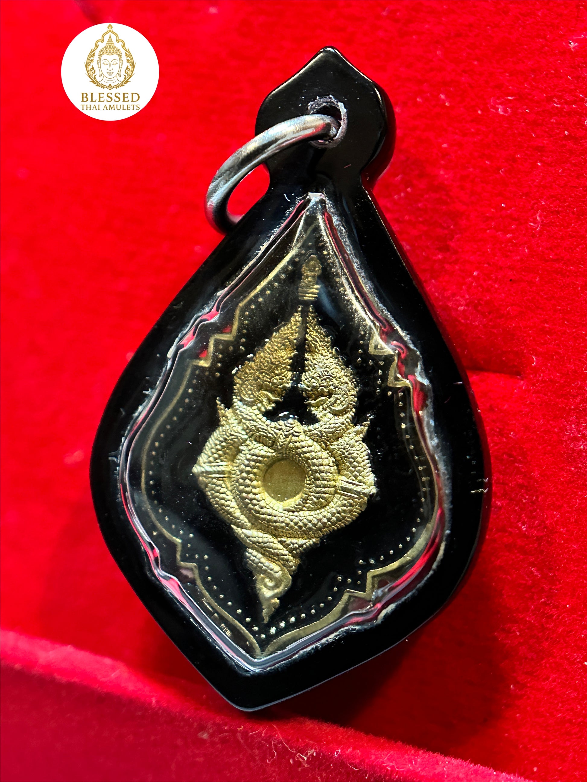 This striking Thai amulet features two golden Nagas intertwined in a protective embrace around a central “Eye” symbol, representing heightened awareness and spiritual vigilance. Set against a deep black backdrop and housed in a distinctive shield-shaped casing, the front design radiates mystical elegance and power. The reverse side is etched with sacred yantra inscriptions and protective mantras, enhancing its spiritual potency. A rare and powerful piece for protection, intuition, and spiritual clarity.