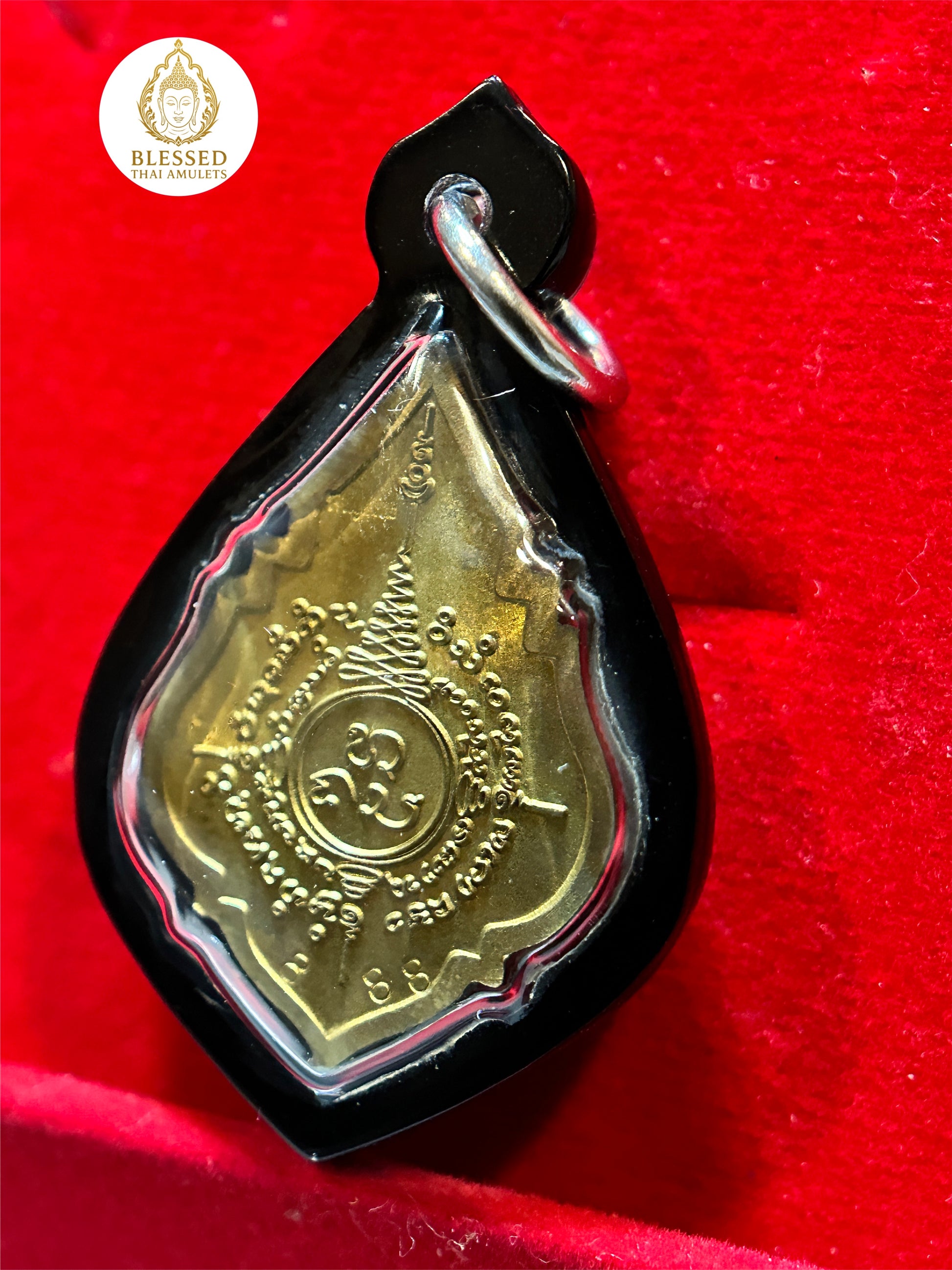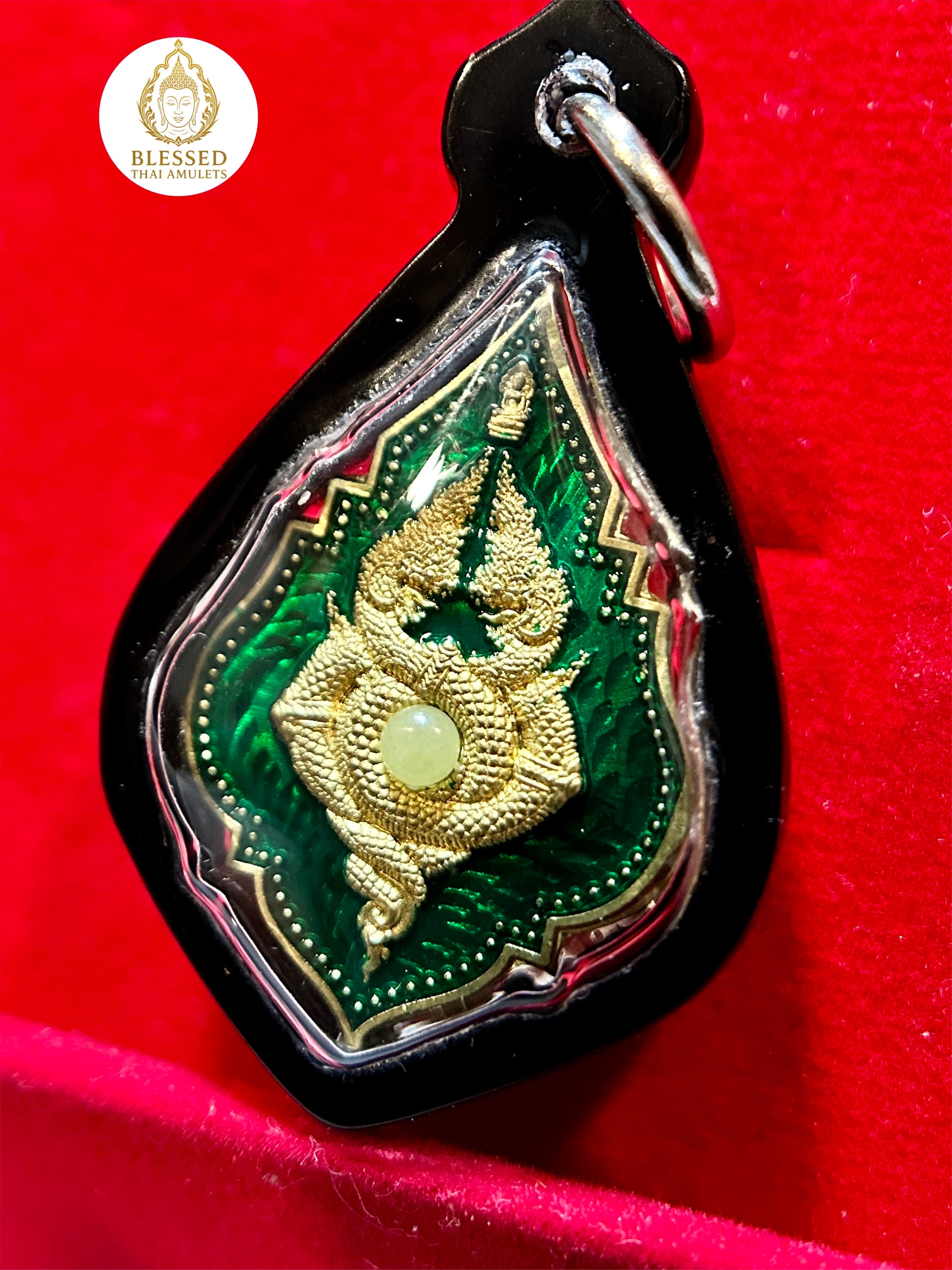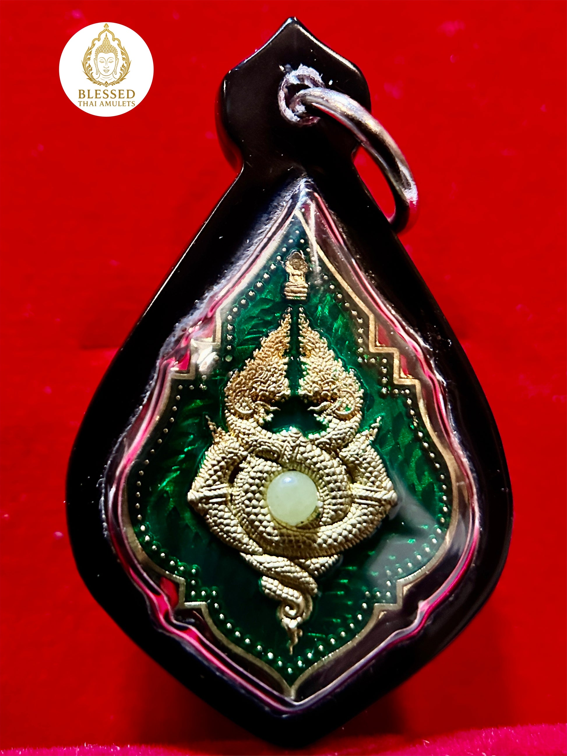 This striking Thai amulet features two golden Nagas intertwined in a protective embrace around a central “Eye” symbol, representing heightened awareness and spiritual vigilance. Set against a deep green backdrop and housed in a distinctive shield-shaped casing, the front design radiates mystical elegance and power. The reverse side is etched with sacred yantra inscriptions and protective mantras, enhancing its spiritual potency. A rare and powerful piece for protection, intuition, and spiritual clarity.