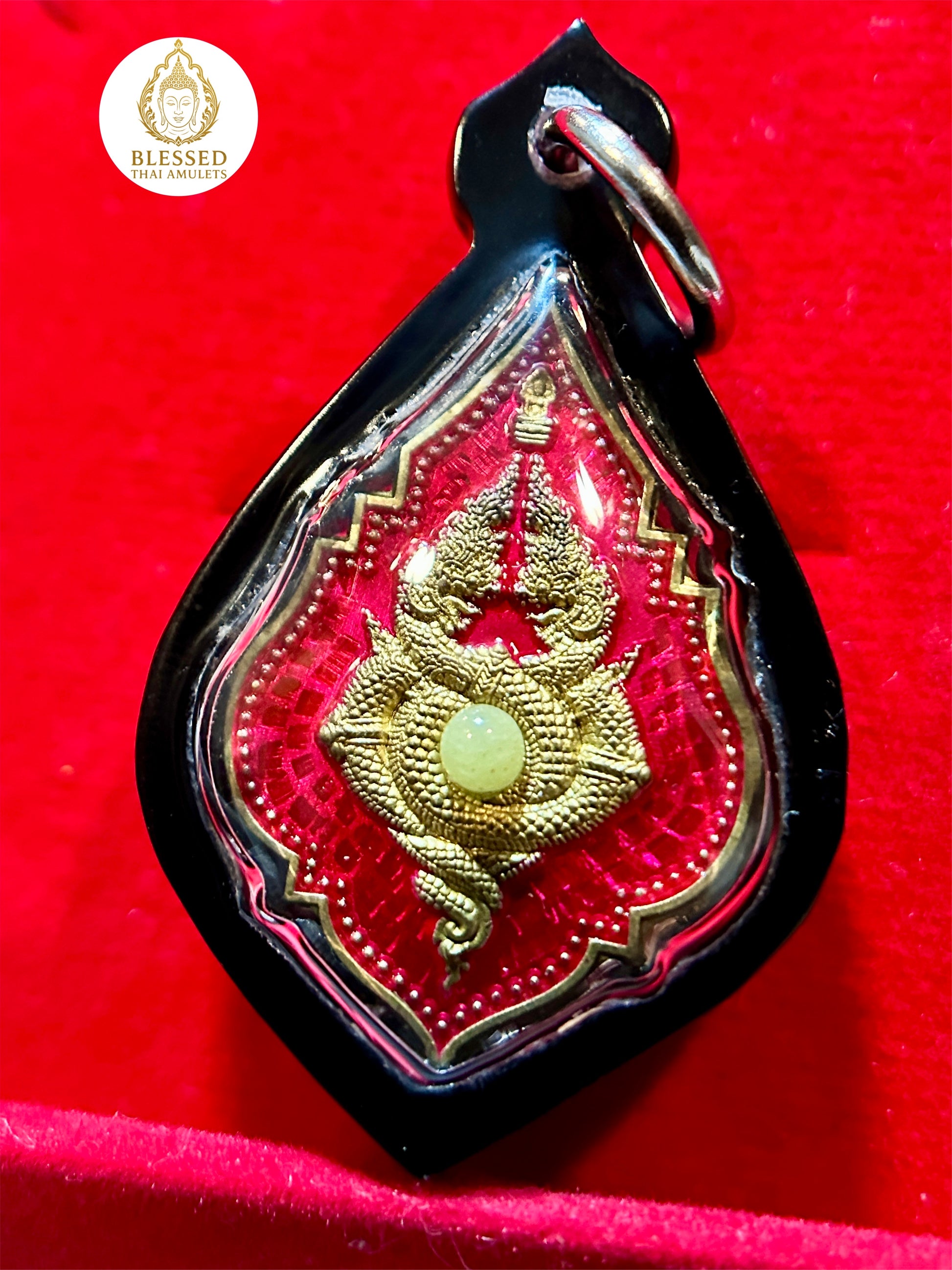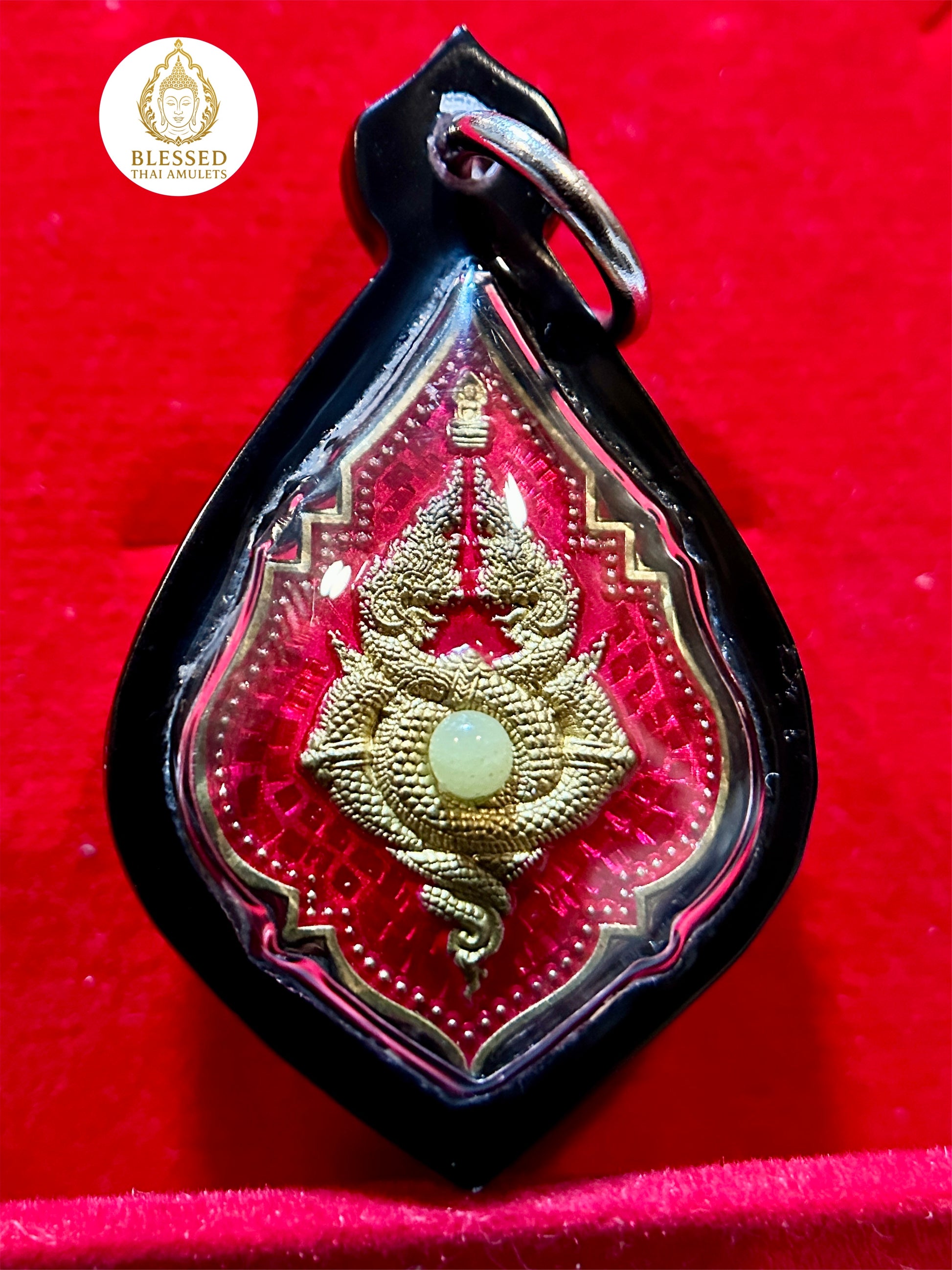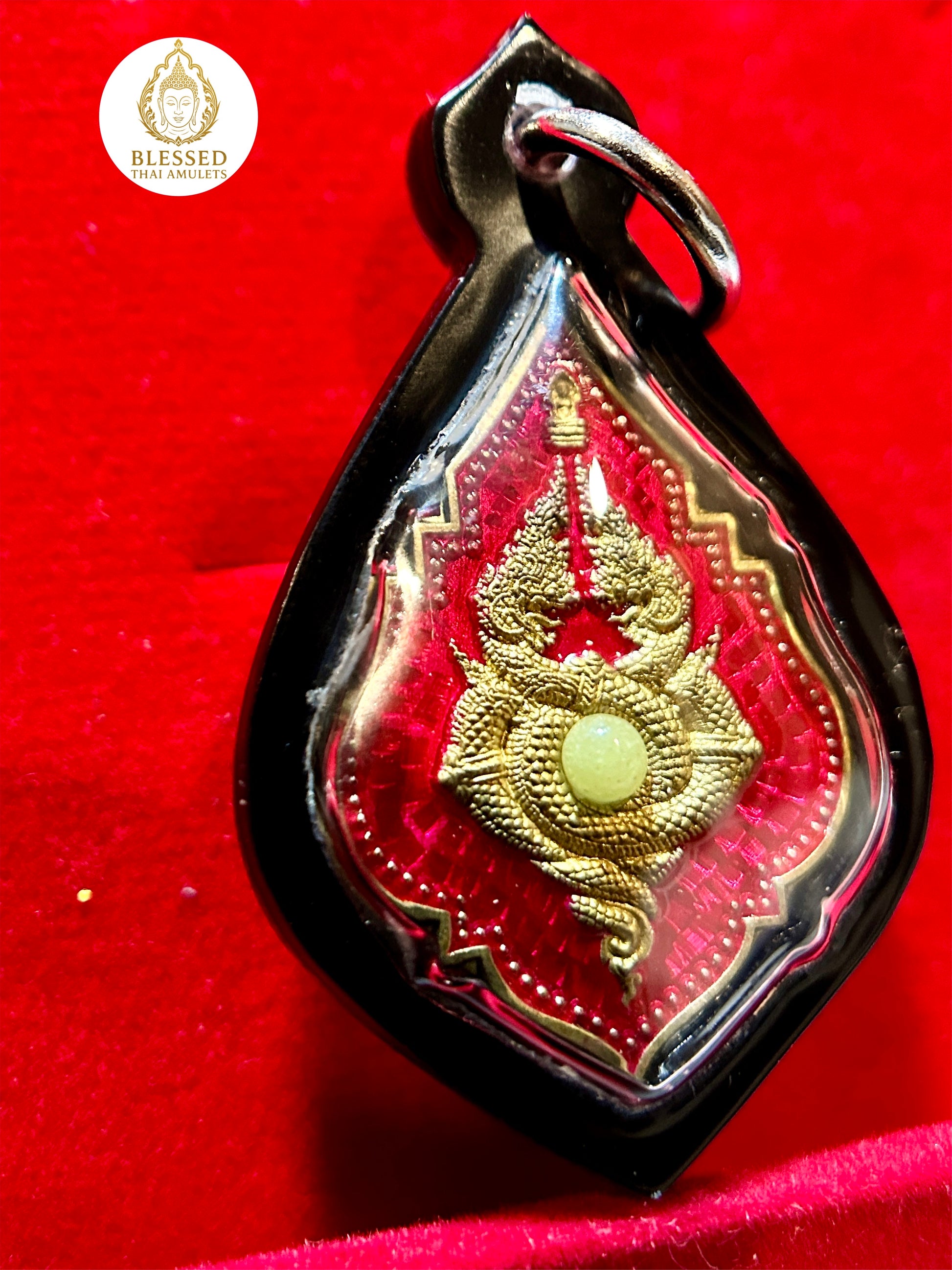 This striking Thai amulet features two golden Nagas intertwined in a protective embrace around a central “Eye” symbol, representing heightened awareness and spiritual vigilance. Set against a deep pink backdrop and housed in a distinctive shield-shaped casing, the front design radiates mystical elegance and power. The reverse side is etched with sacred yantra inscriptions and protective mantras, enhancing its spiritual potency. A rare and powerful piece for protection, intuition, and spiritual clarity.