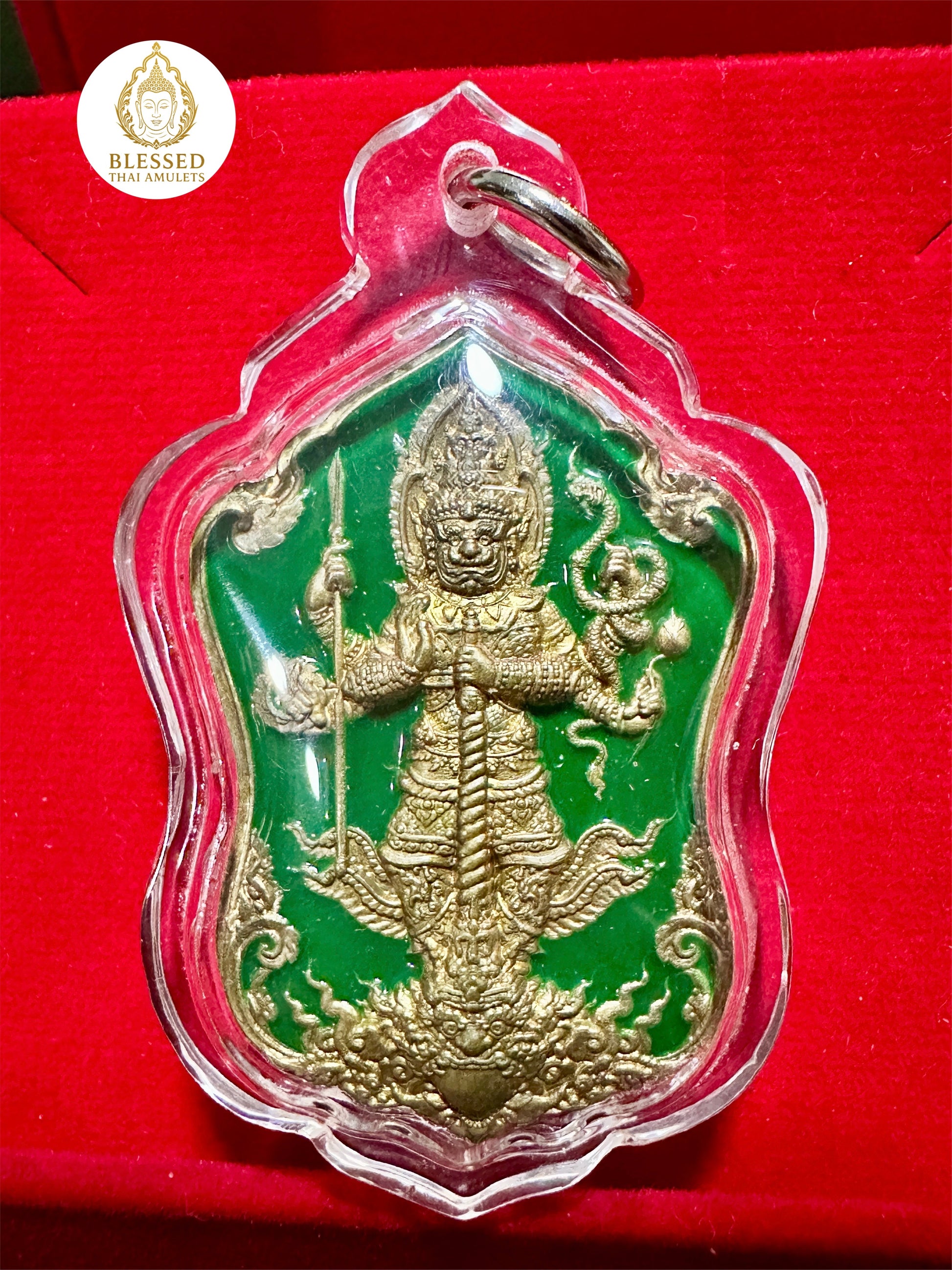 This striking Thai amulet features Tao Wessuwan (ท้าวเวสสุวรรณ), the powerful guardian of the North and King of the Yaksha. Known in Thai Buddhist tradition as a divine protector against evil spirits, black magic, and misfortune, Tao Wessuwan is revered for his ability to shield devotees from spiritual harm and attract wealth and authority.