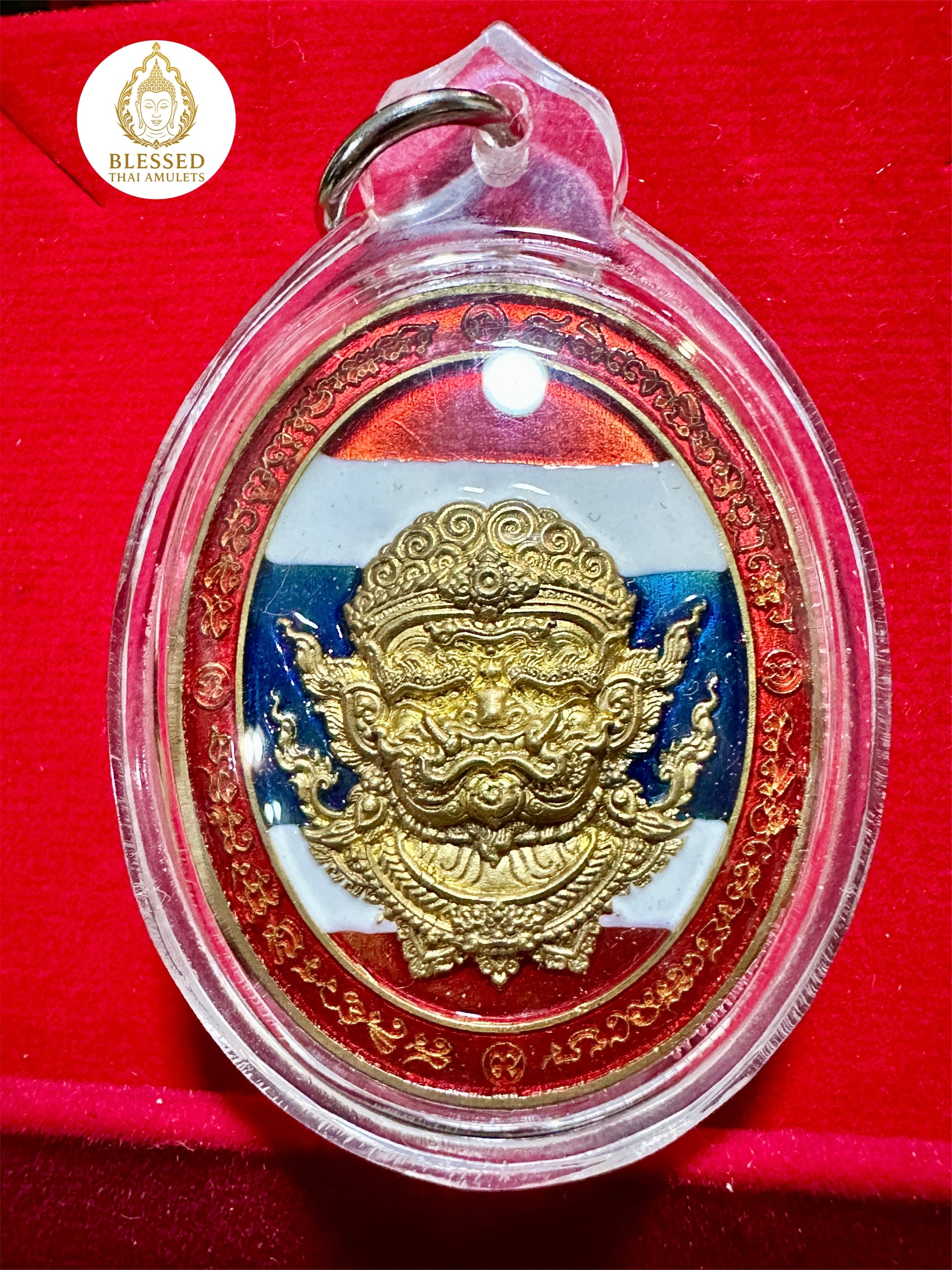 This striking Thai amulet features the powerful face of a golden Yaksha—mythical guardian giants known for warding off evil and fiercely protecting sacred spaces and treasures. The Yaksha’s image is set against the vibrant red, white, and blue of the Thai national flag, symbolizing strength, national pride, and divine guardianship.